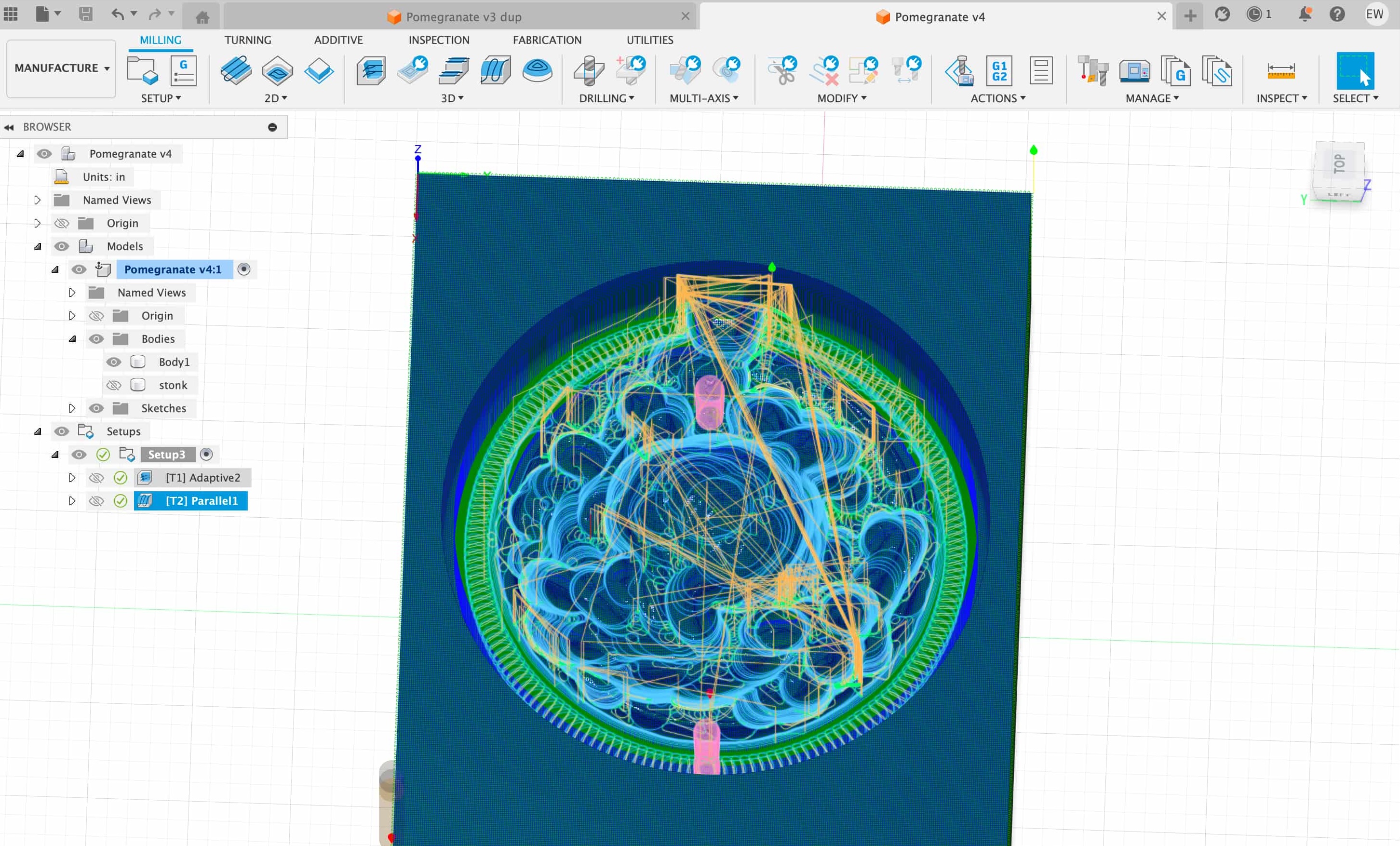 Then I generated my intended milling paths in Fusion; first an initial roughing pass, then another finishing pass with a smaller endmill.