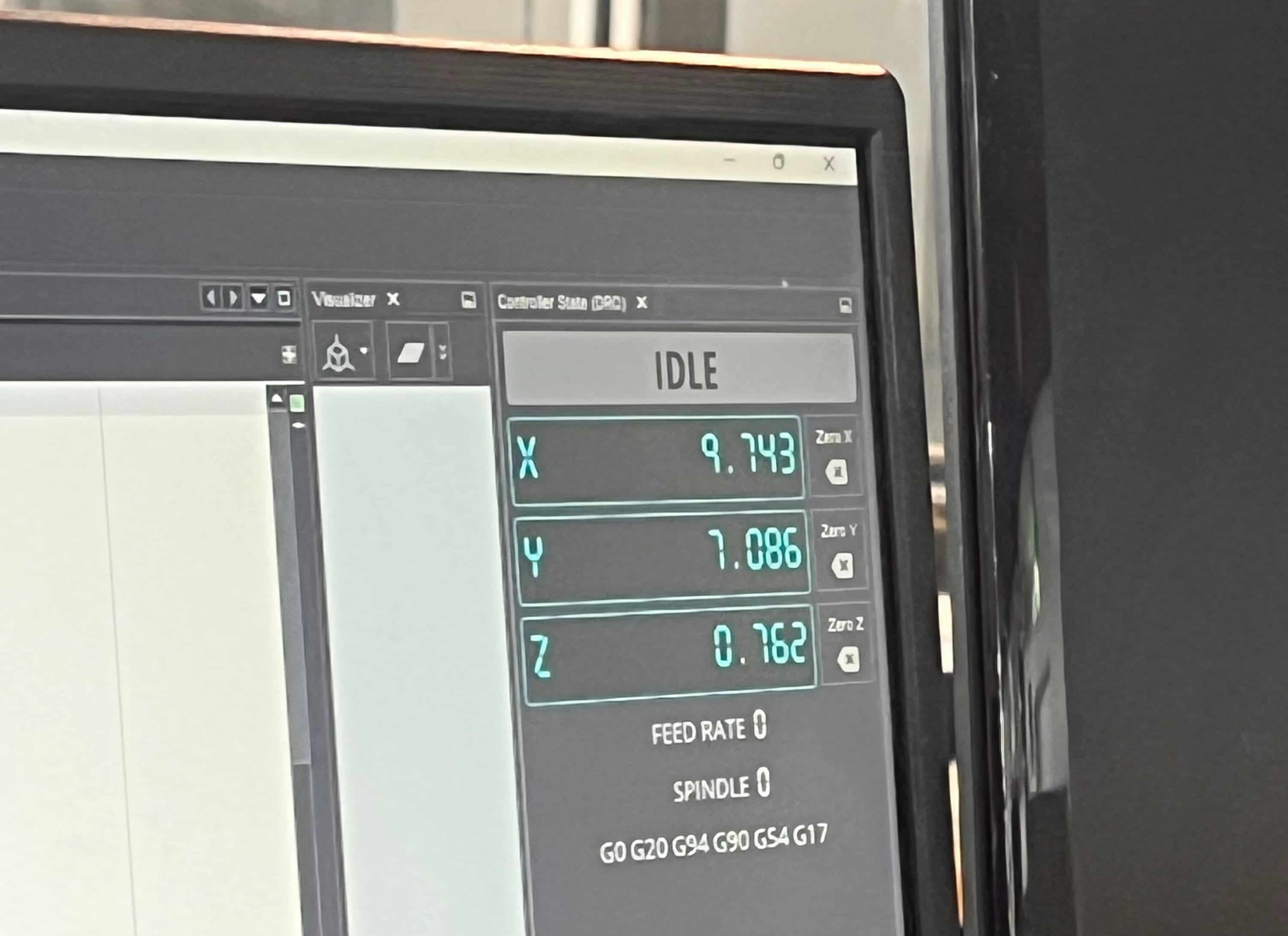 Then we zeroed the machine by manually controlling it in tiny steps, until the X, Y, and Z axes were aligned. This was done simply through arrow keys – we looked at the software and were able to control it in ~ 0.01mm steps. For X and Y, you want to make it so the endmill is centered on each axis, with half the endmill over your stock. For Z, we put a piece of paper on the stock, and dropped the endmill down little by little until it was holding –– but not tearing –– the paper; then lifted it up slightly and moved it back so we were certain it was zeroed on the very top of the stock.
