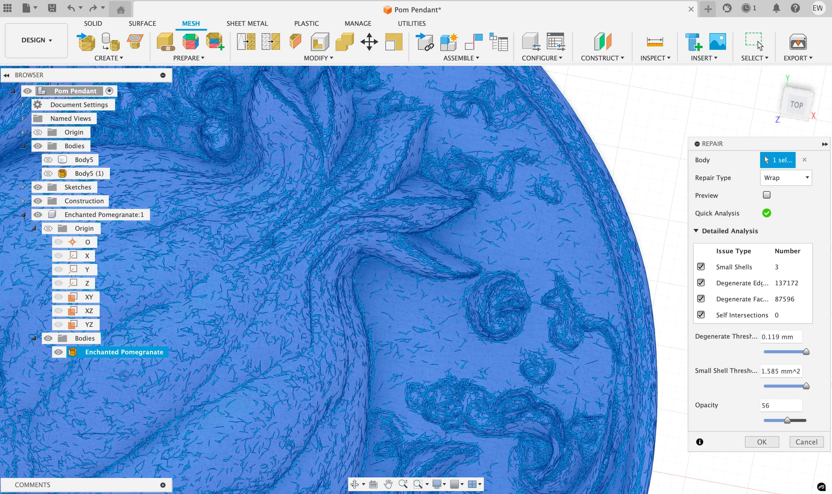 Fusion was also throwing up many errors about the model bring broken, so the first step I tried to take was using the "Repair" function under the "Mesh" menus: