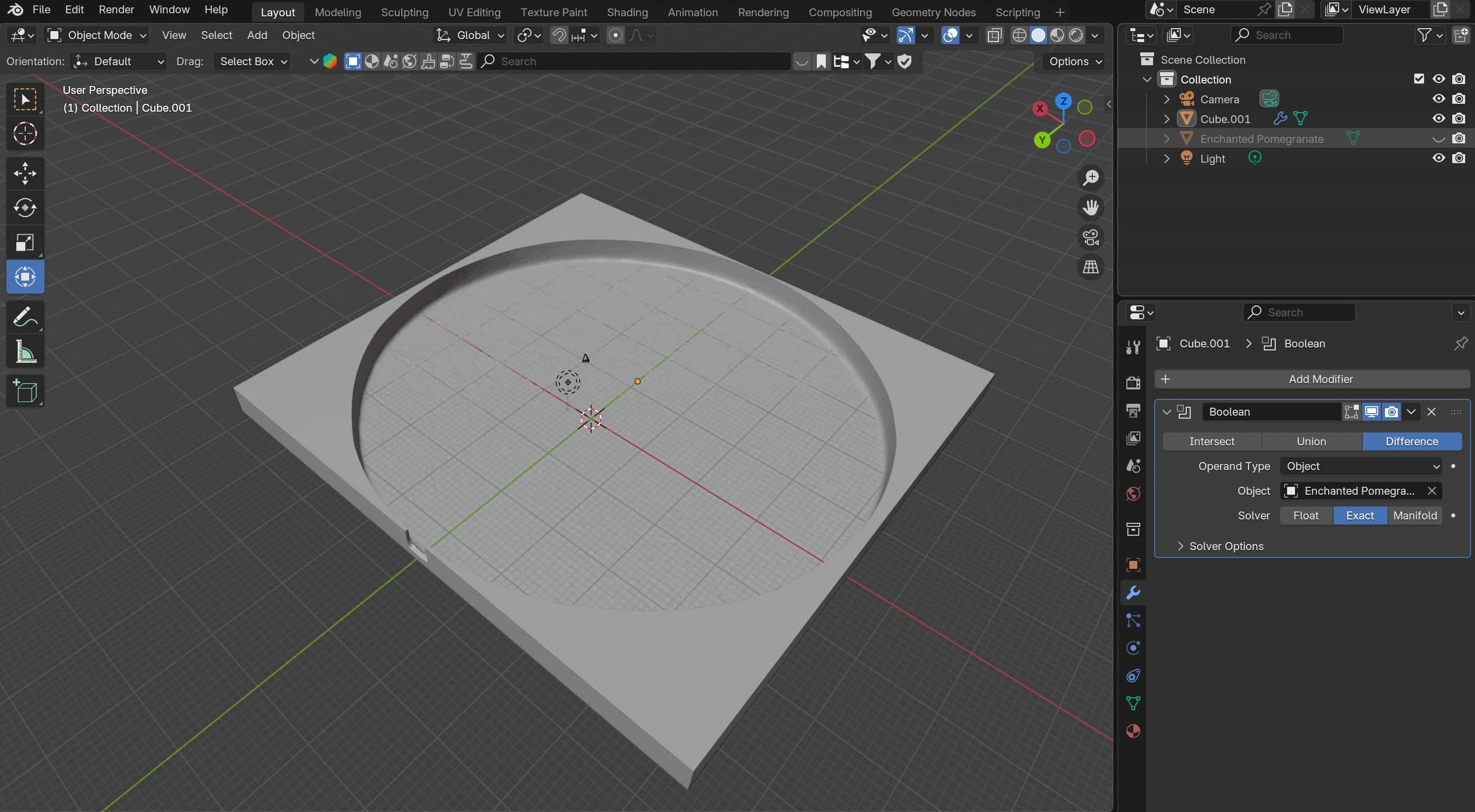 However, I was then stuck struggling for hours about how to combine the mesh with the stock box body I'd created to make the actual mold. One solution Jake suggested (thank you Jake!) was to use Blender instead, so I temporarily switched over to that. I imported my model, added a simple box, then used the "Boolean" modifier with "Difference" checked off to form what I thought would be the two sides of the mold: