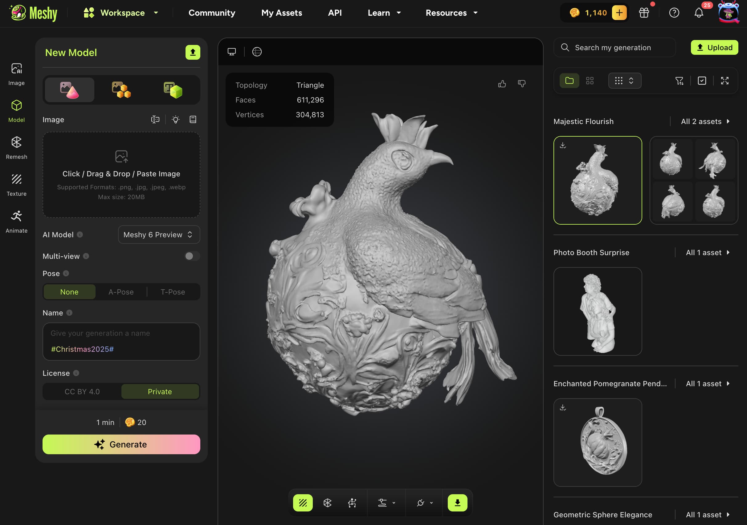 For comparison's sake, here's the same 2D image brought to 3D with Meshy:
