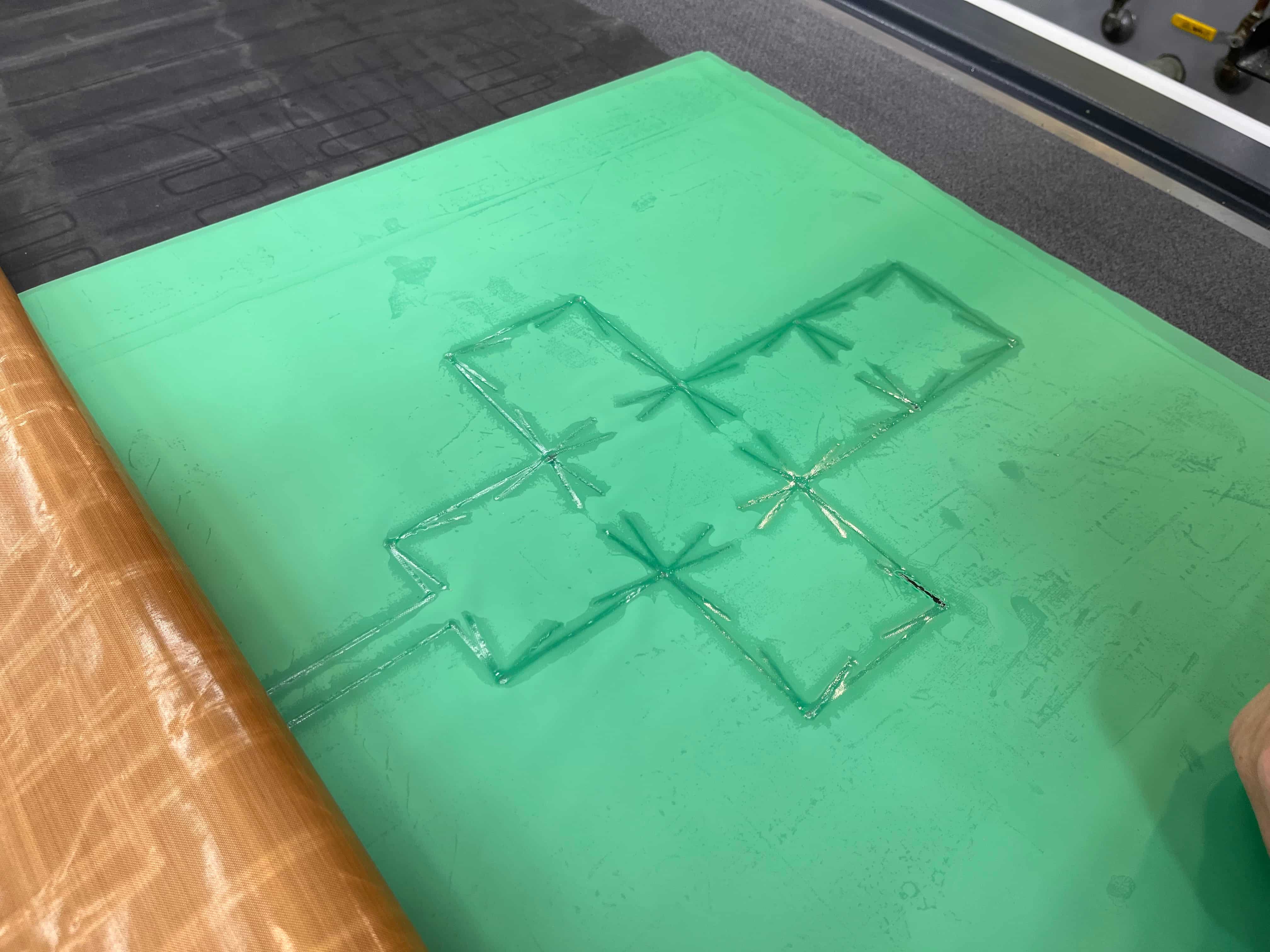 - Lowest layer is silicone; then the material; then teflon, which conducts the heat and helps the vacuum - will have kerf of 2mm (ie 4mm seams)