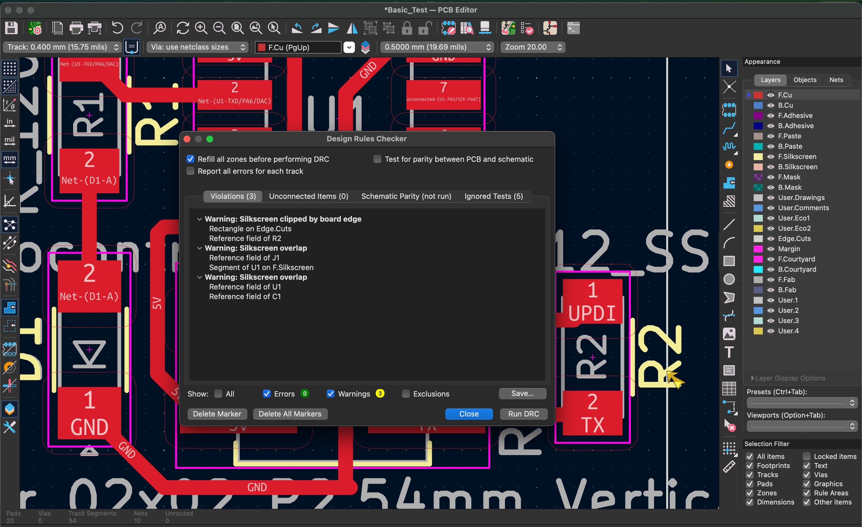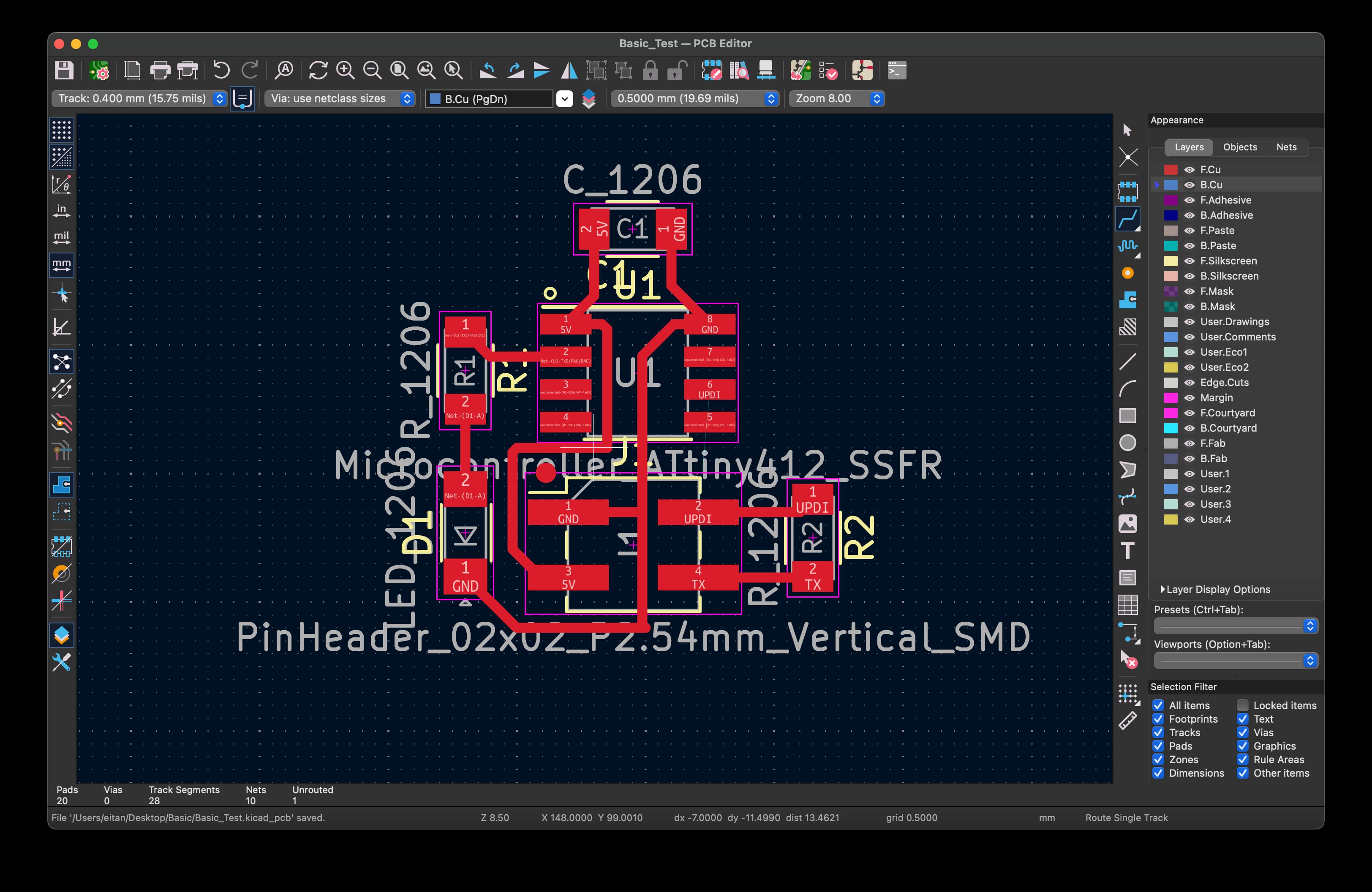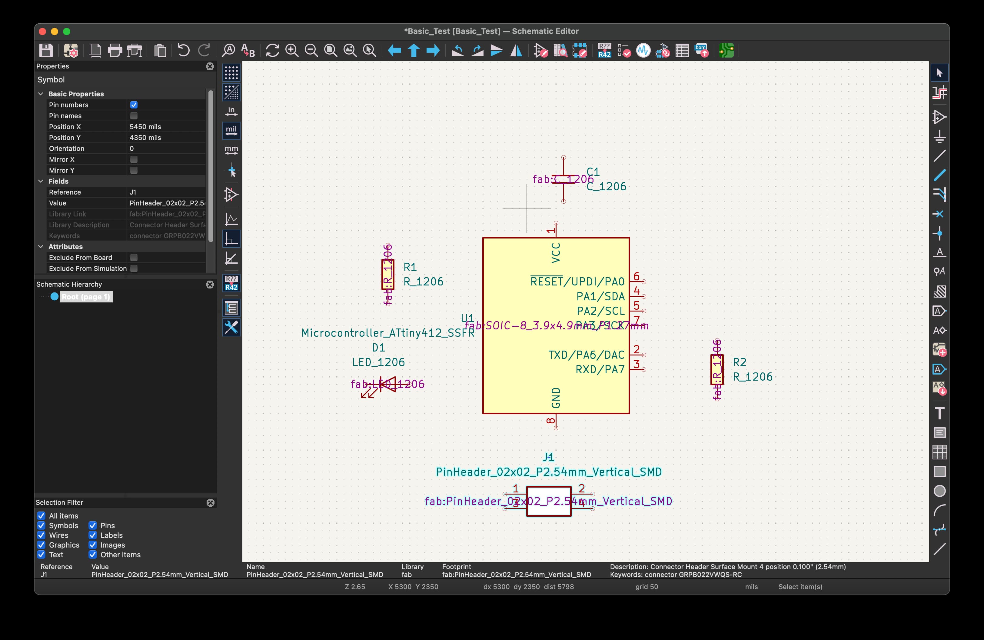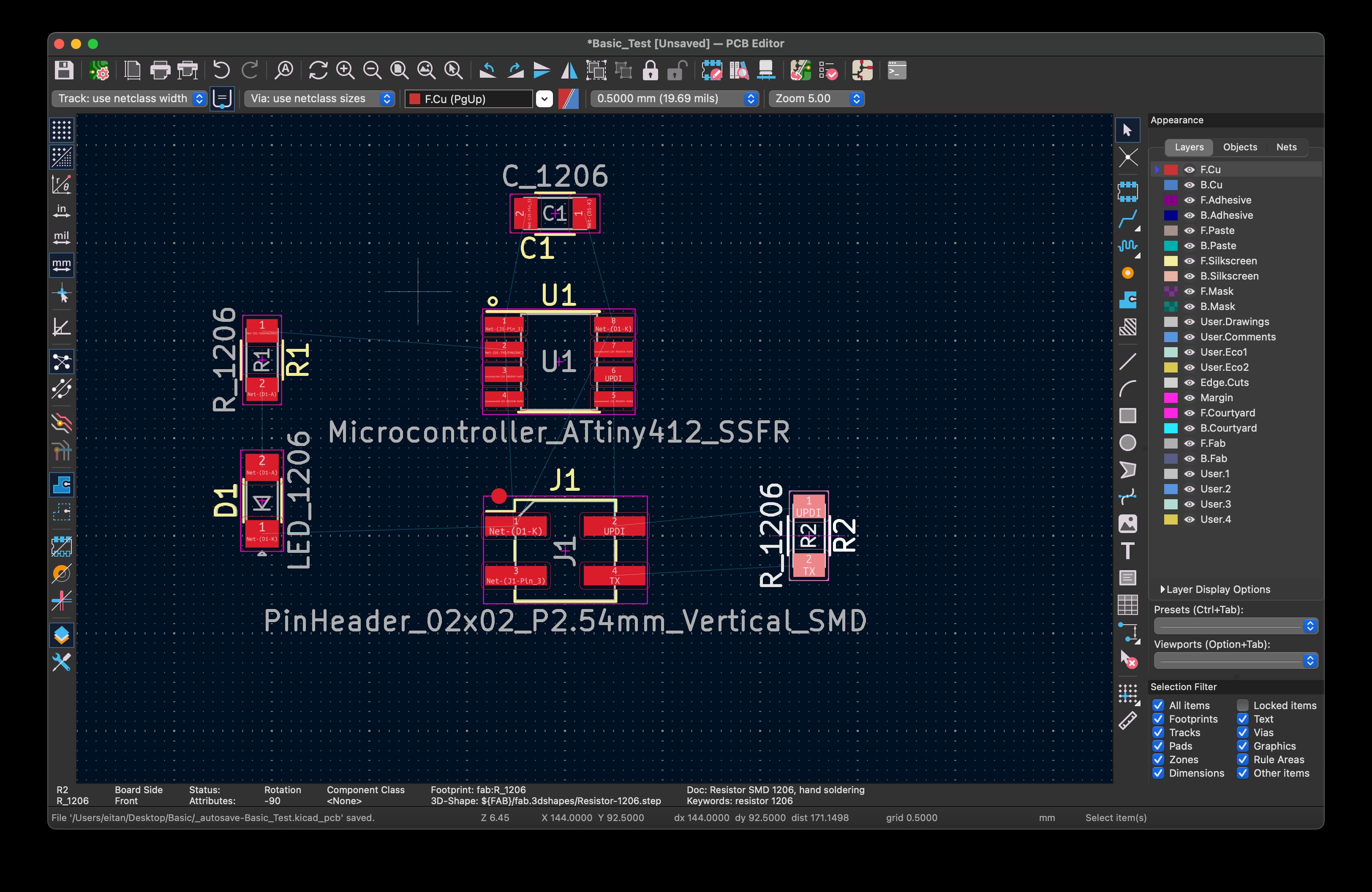 I will add more detailed documentation below soon, but this was the process of learning how to use KiCAD to organize relationships between components, then create the actual traces on the board. We also talked about design rules and how to simulate your circuits. Screenshots below, but more to come: