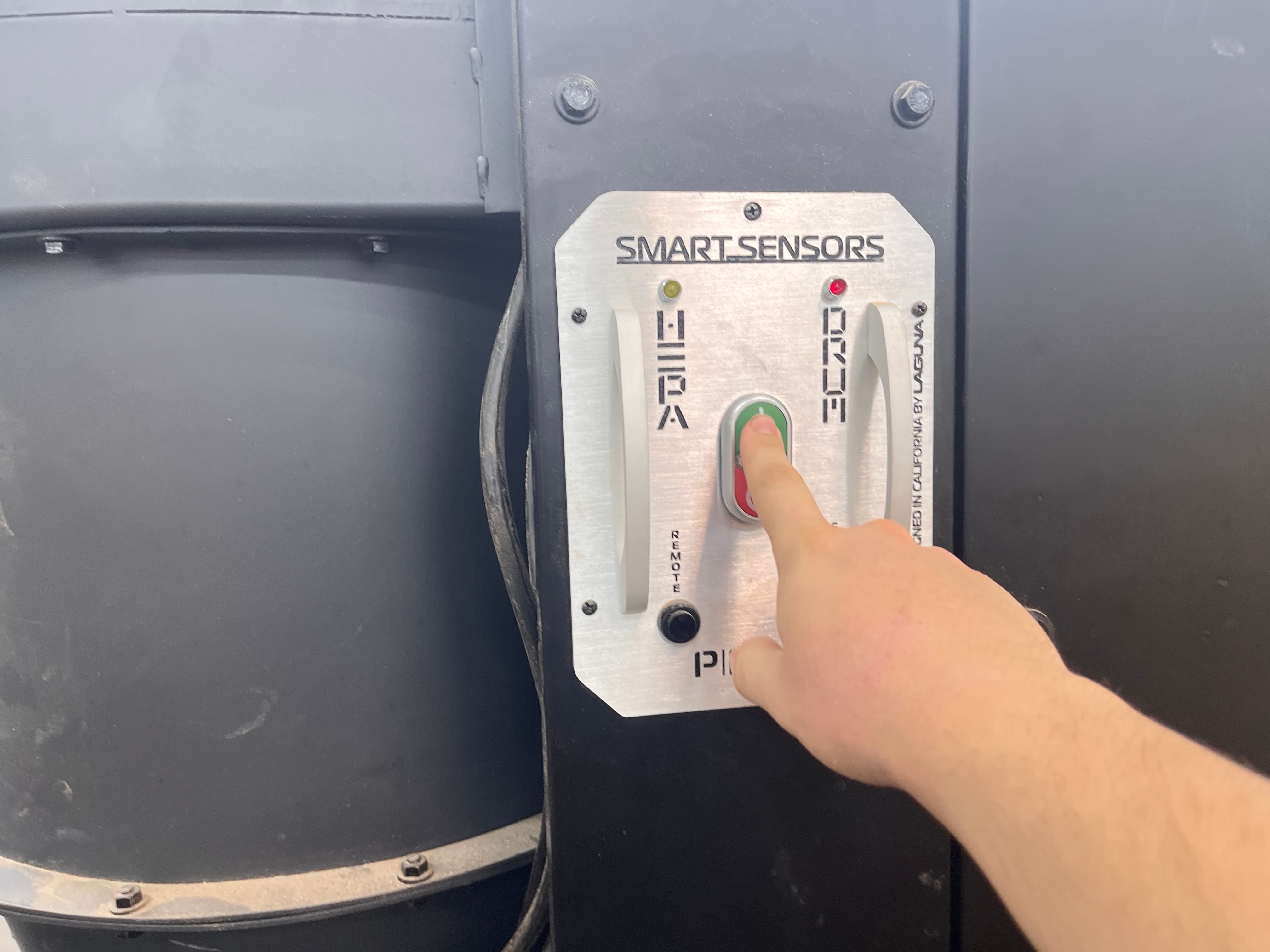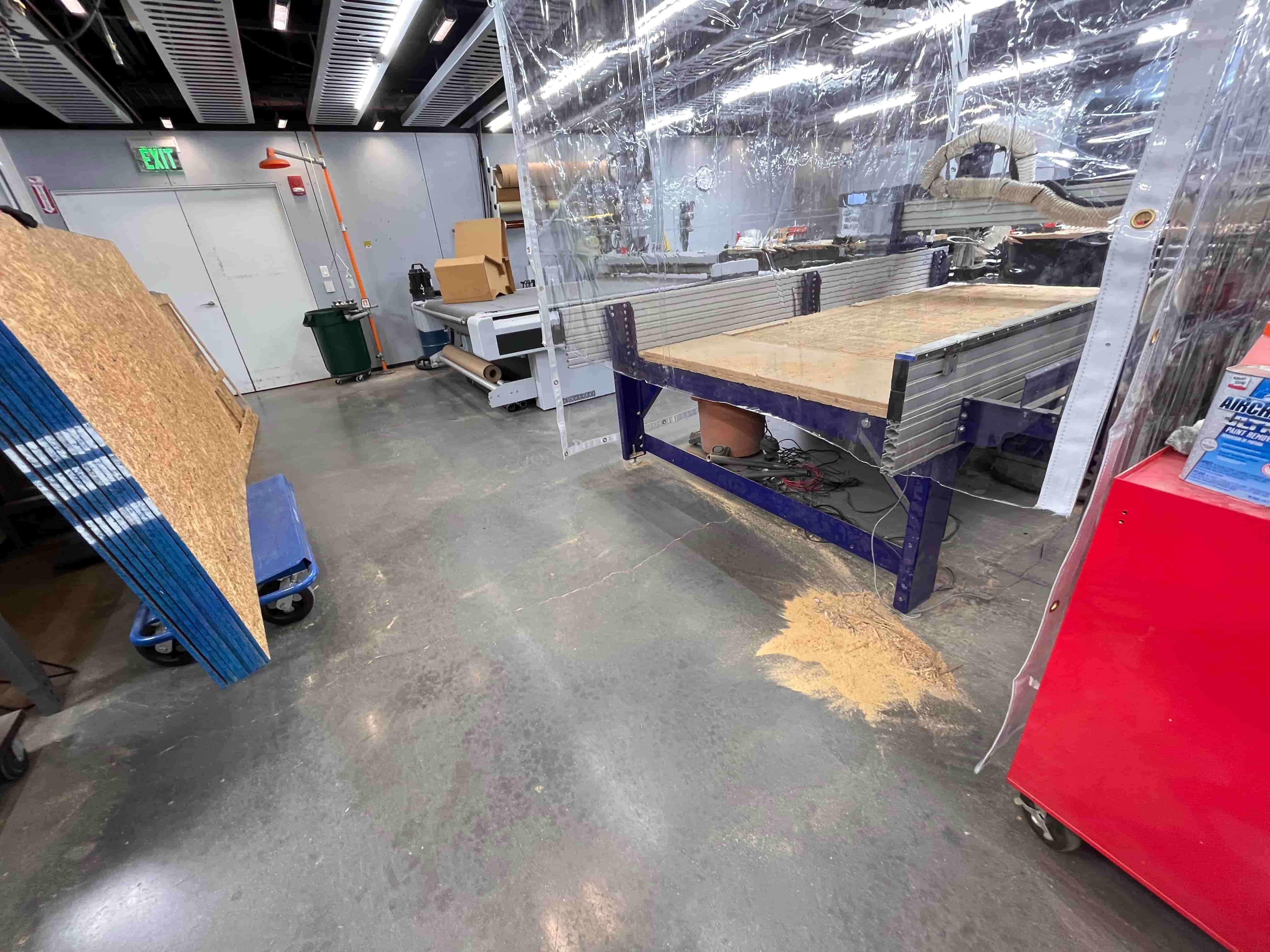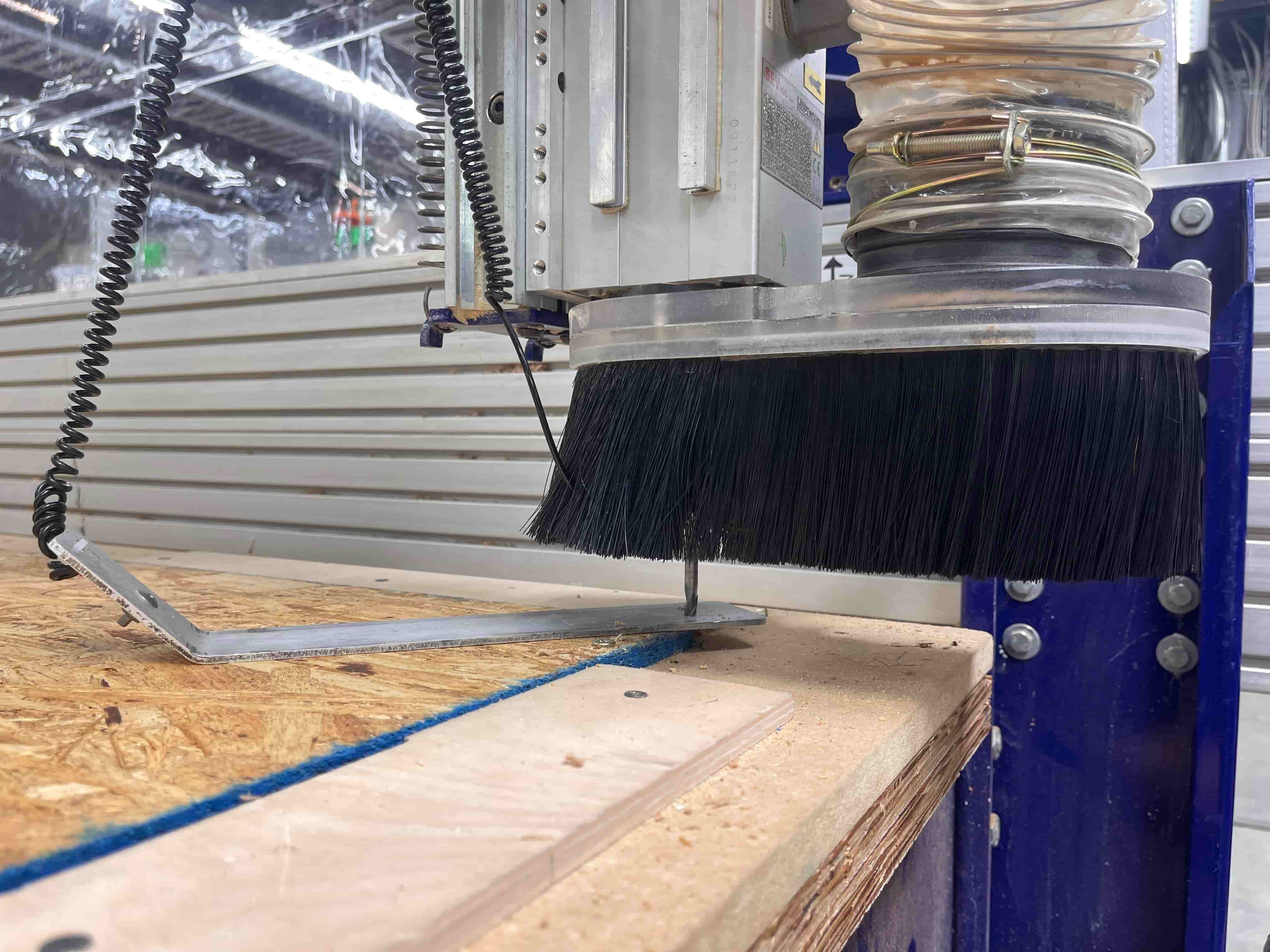 We then needed to make sure the ShopBot was good to go. This involves prompting it to probe the height, connecting the clamp to the end mill and allowing it to slowly push down onto the metal plate. From there, all we needed to do was follow the start instructions: click start, press the green start button, hit ok, and turn on the big vacuum: