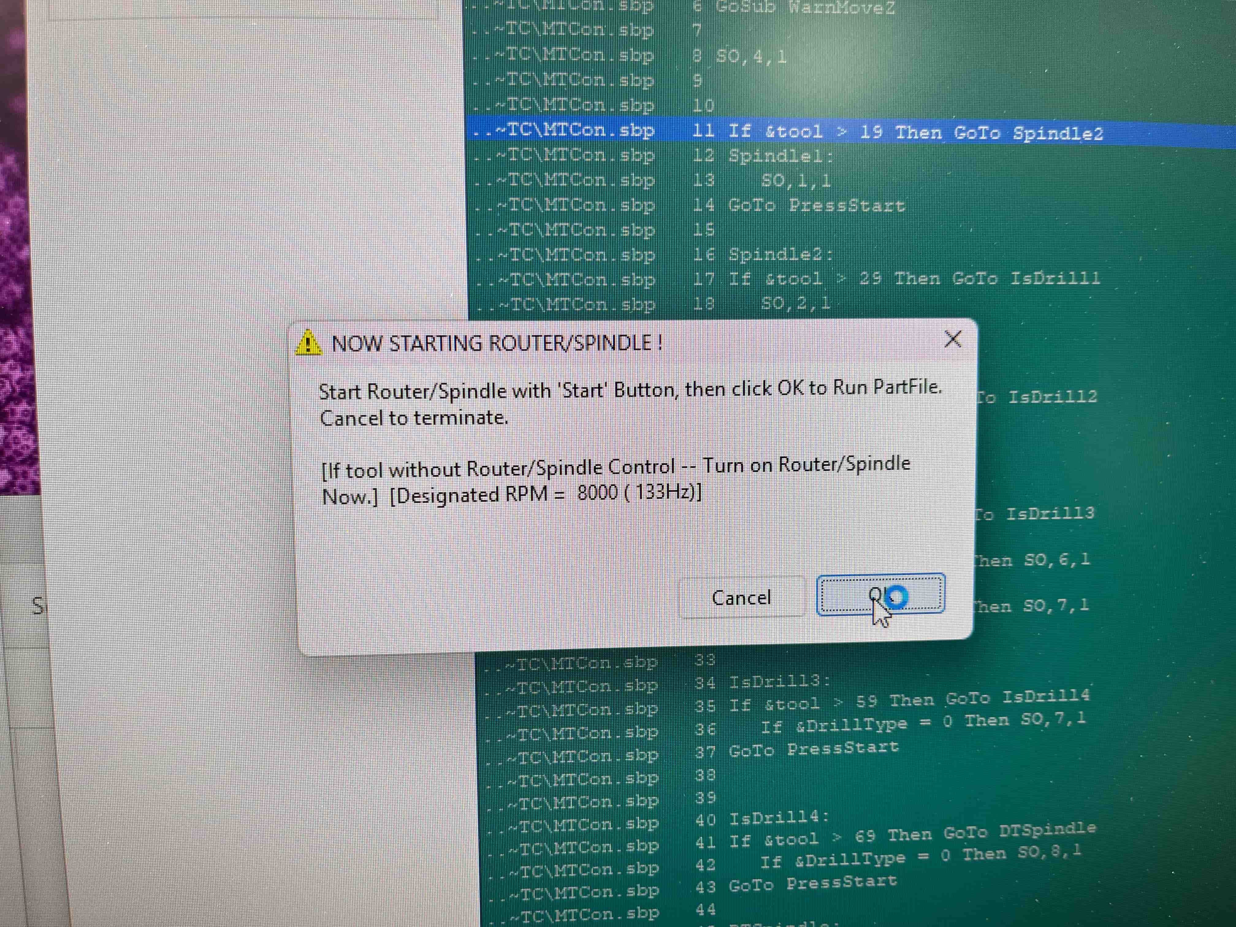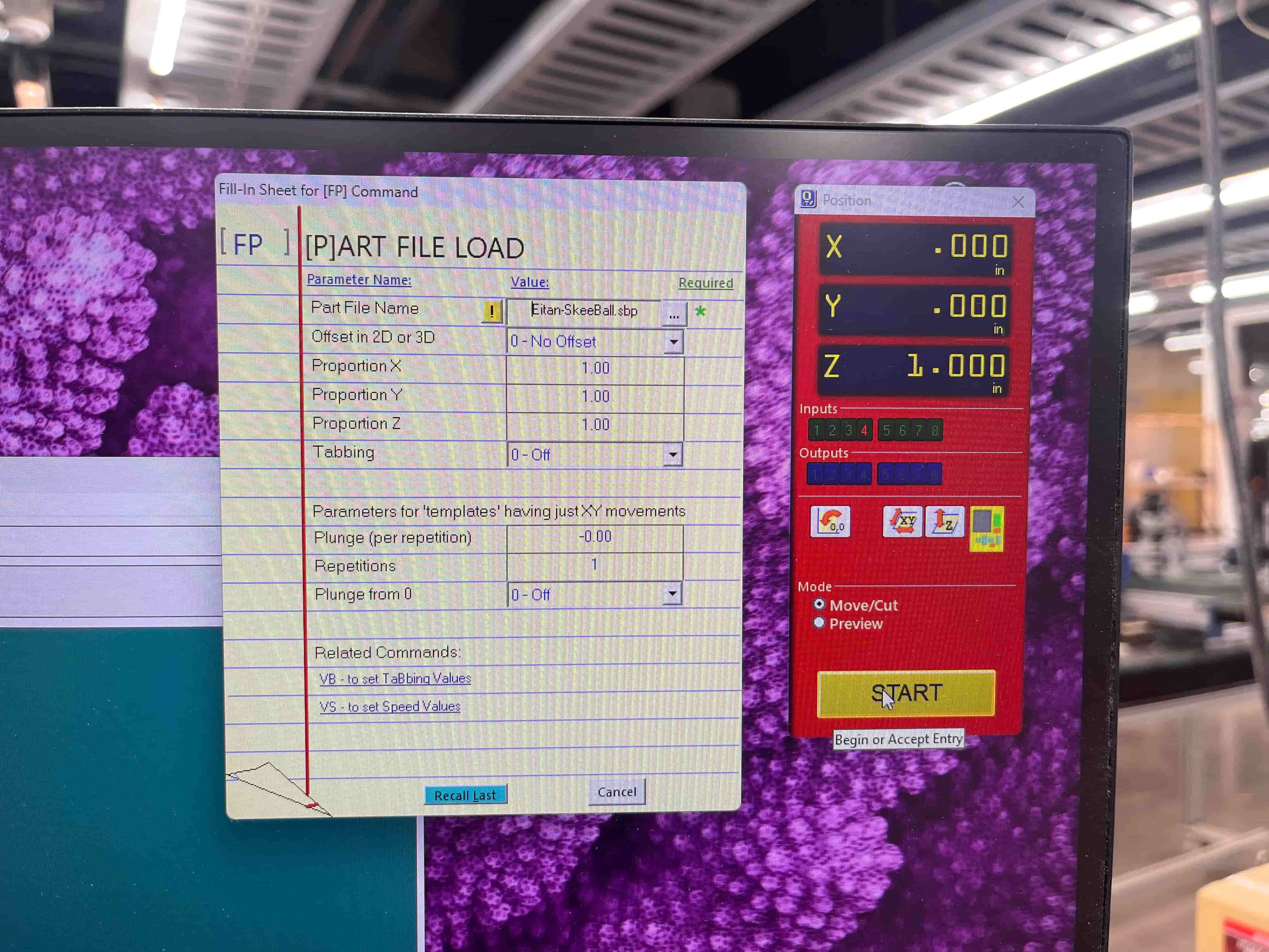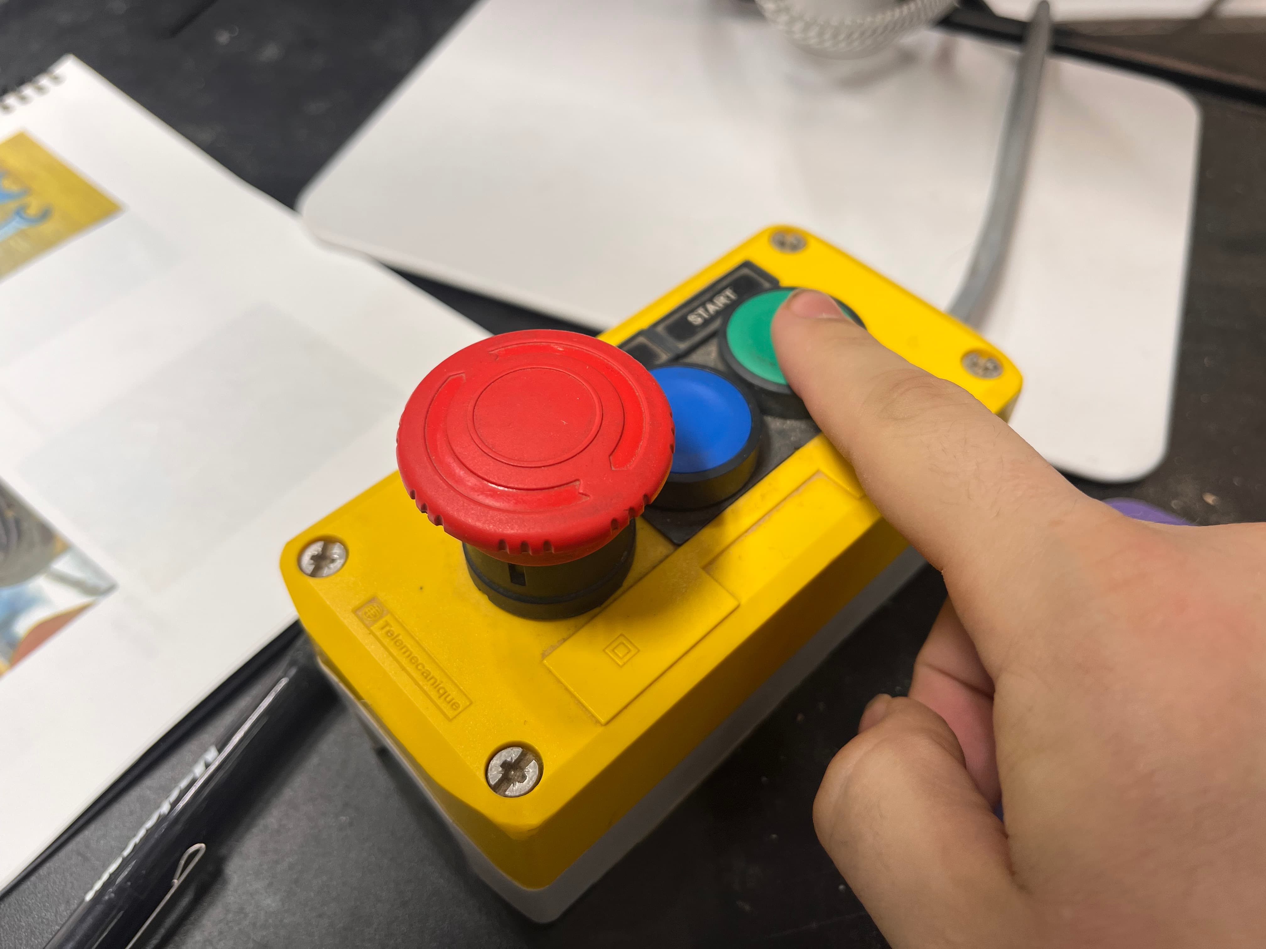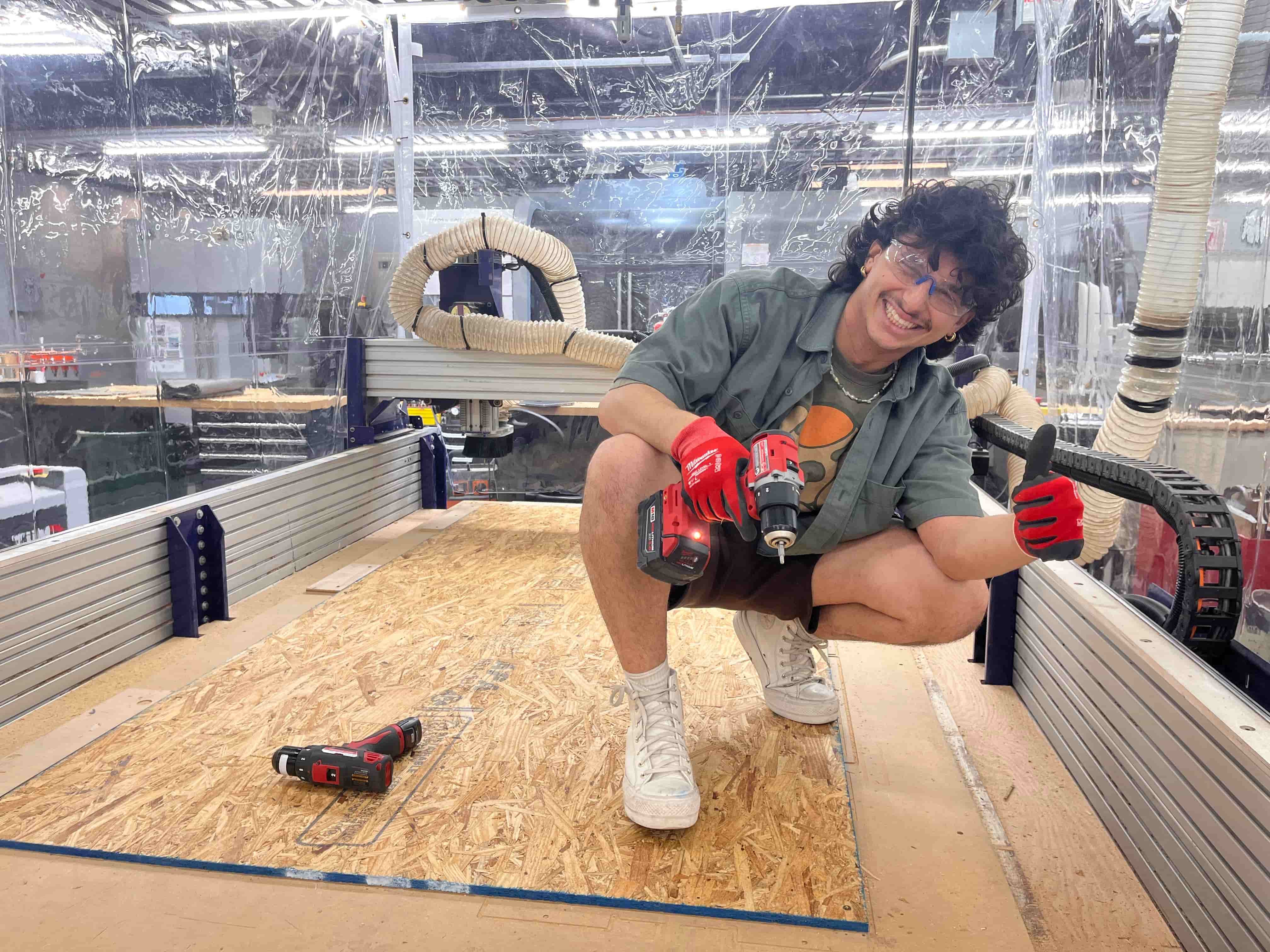 We then needed to make sure the ShopBot was good to go. This involves prompting it to probe the height, connecting the clamp to the end mill and allowing it to slowly push down onto the metal plate. From there, all we needed to do was follow the start instructions: click start, press the green start button, hit ok, and turn on the big vacuum: