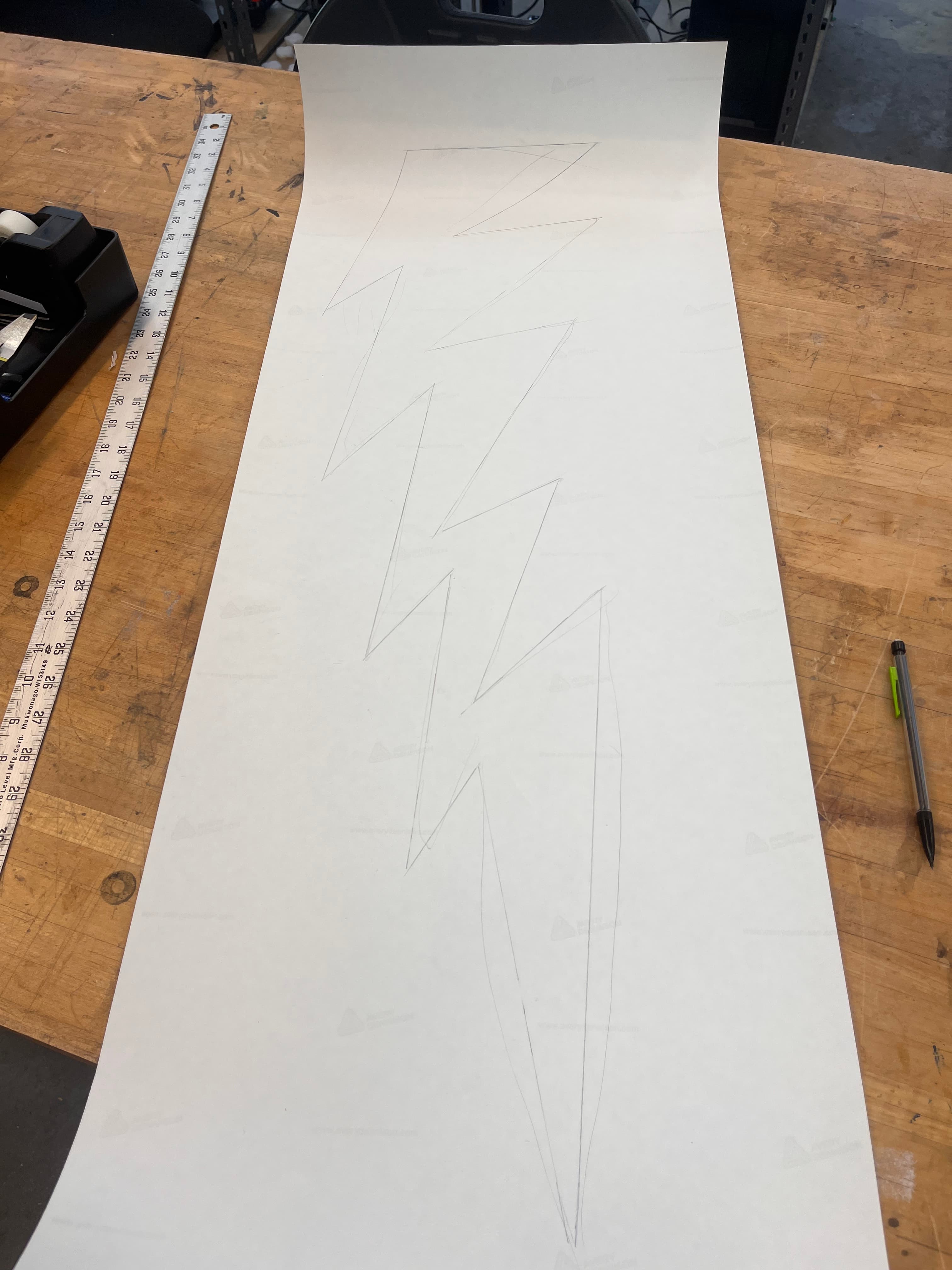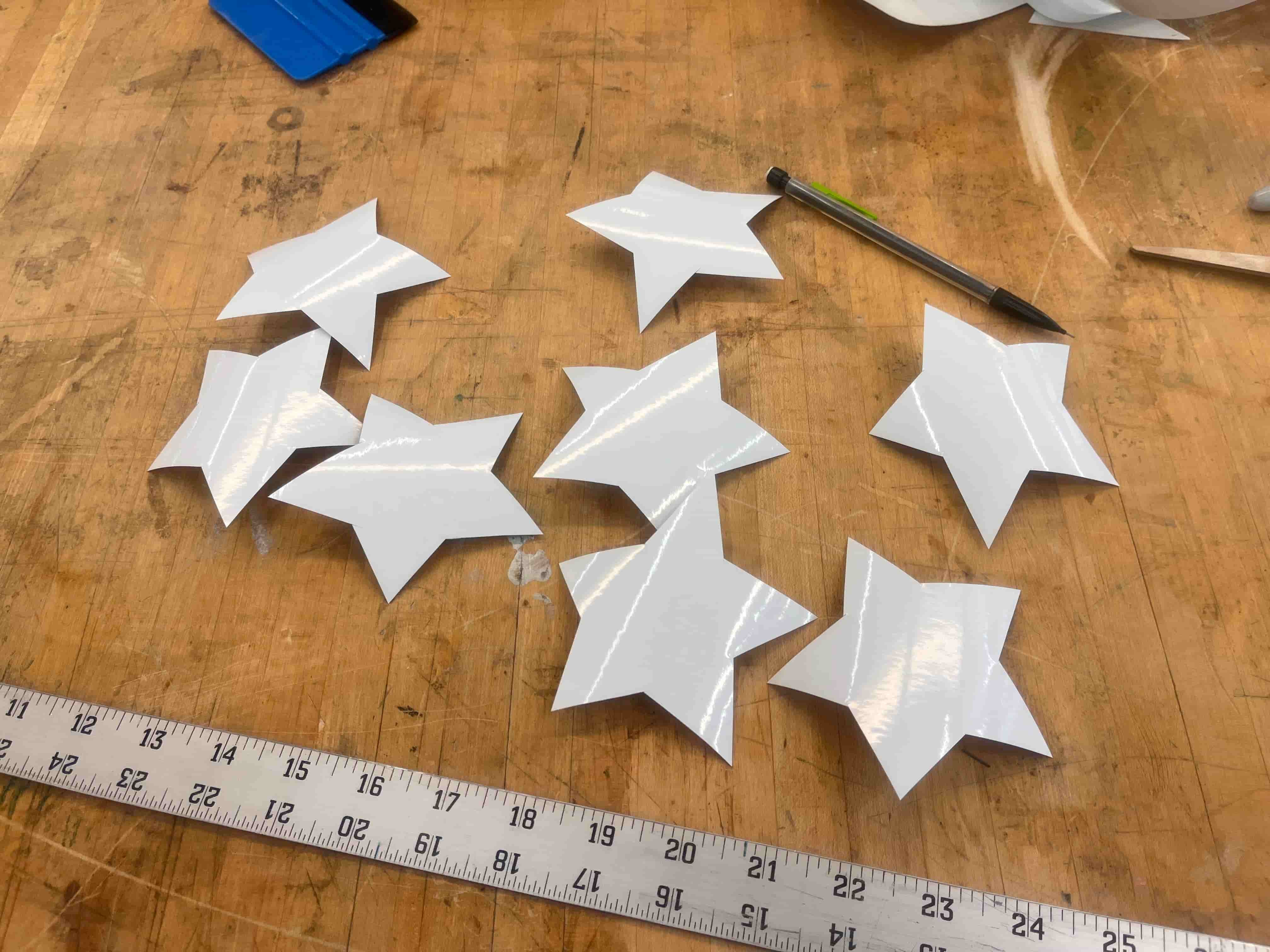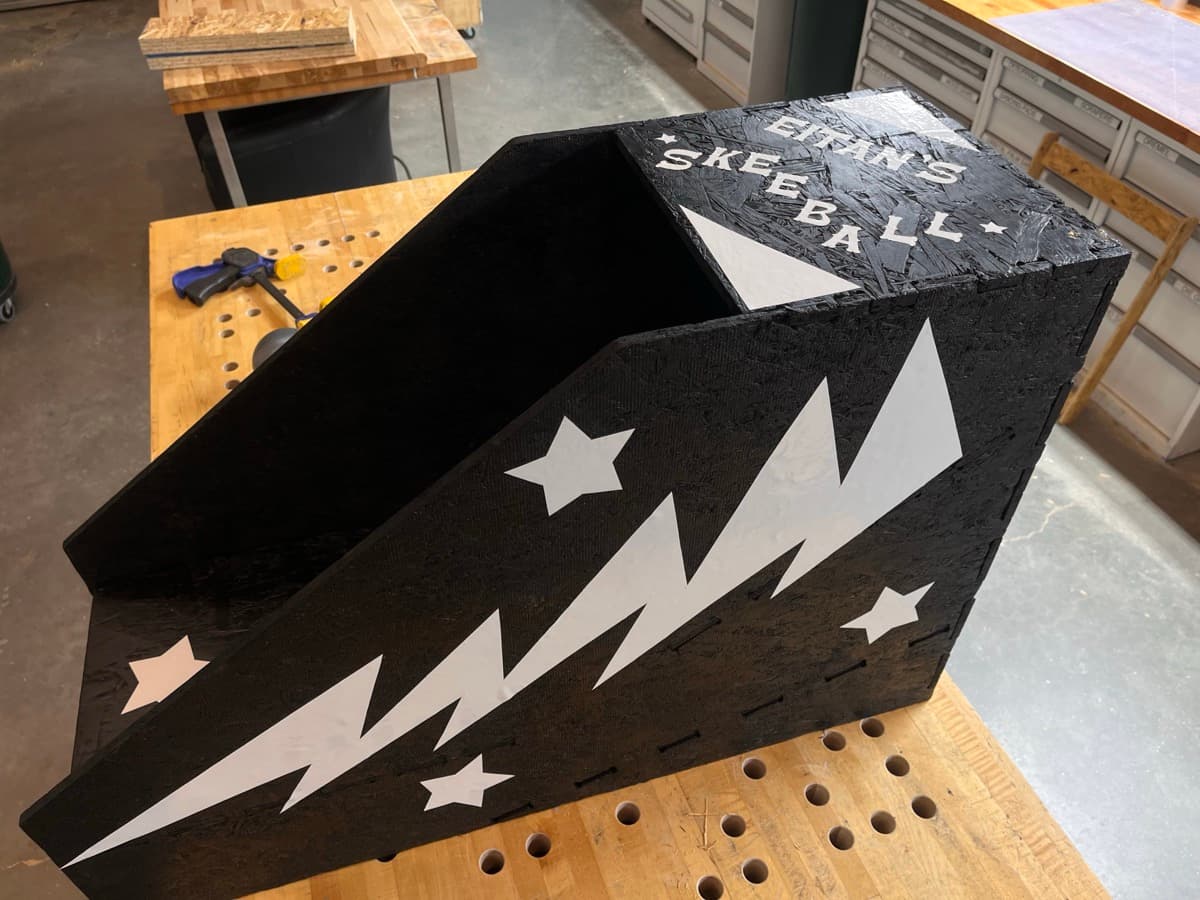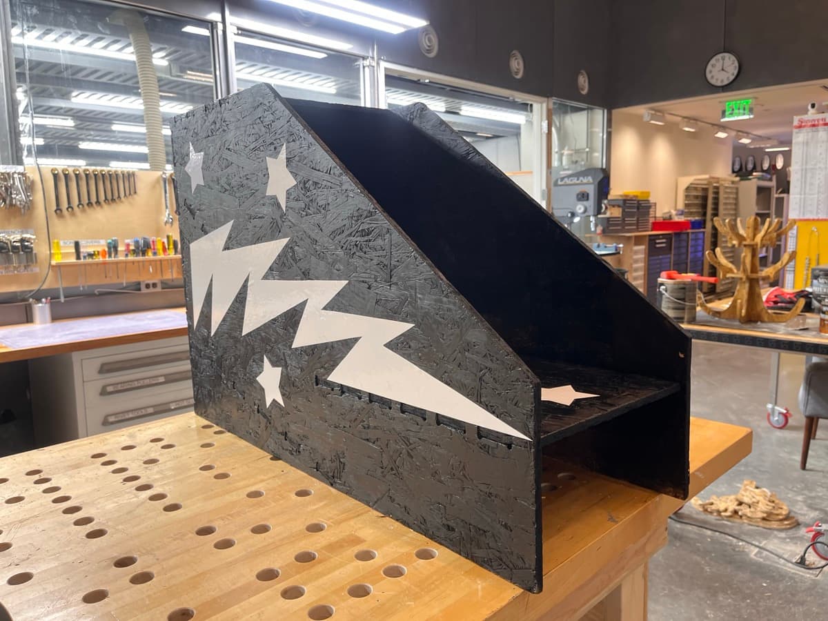 Now that I had all the pieces, and a wonderful painted structure with a ramp, I wanted to spruce it up a bit. I cut out some vinyl, taped it to the side, sketched out a lightning bolt, hand cut it with scissors, used it to trace another matching one on another piece of vinyl –– technically a mistake - you want to mirror it! but whateva it's still cool –– and cut out some stars from the scrap vinyl.