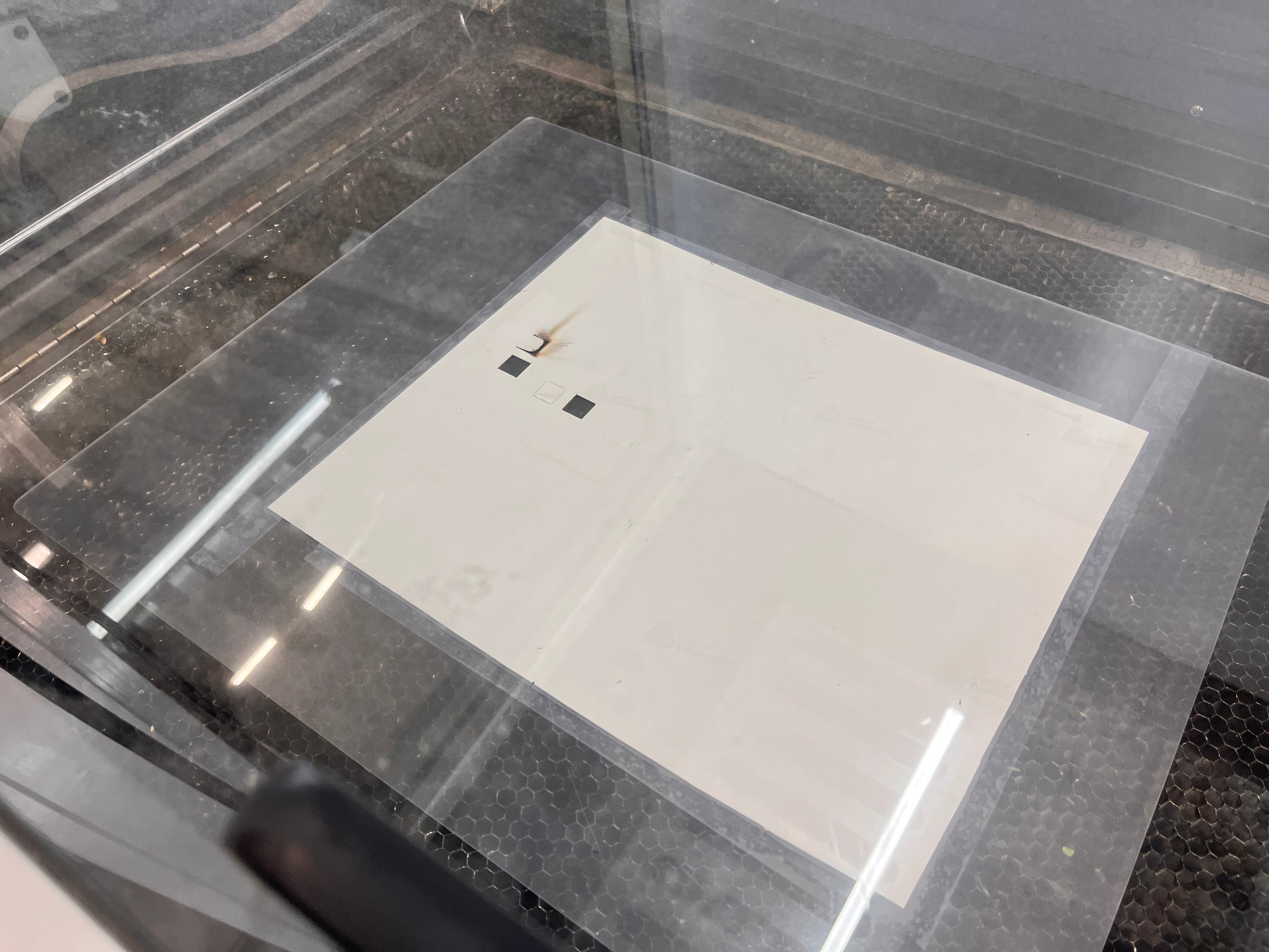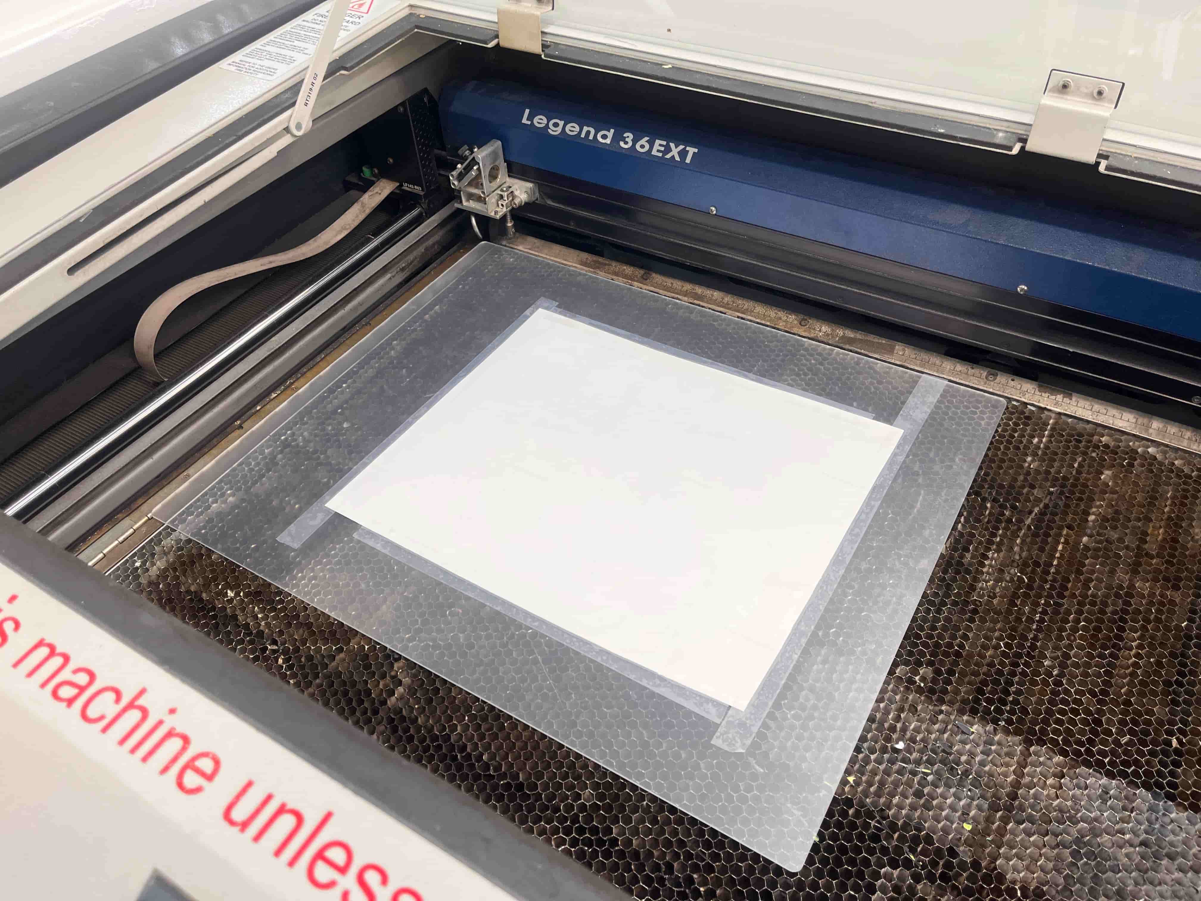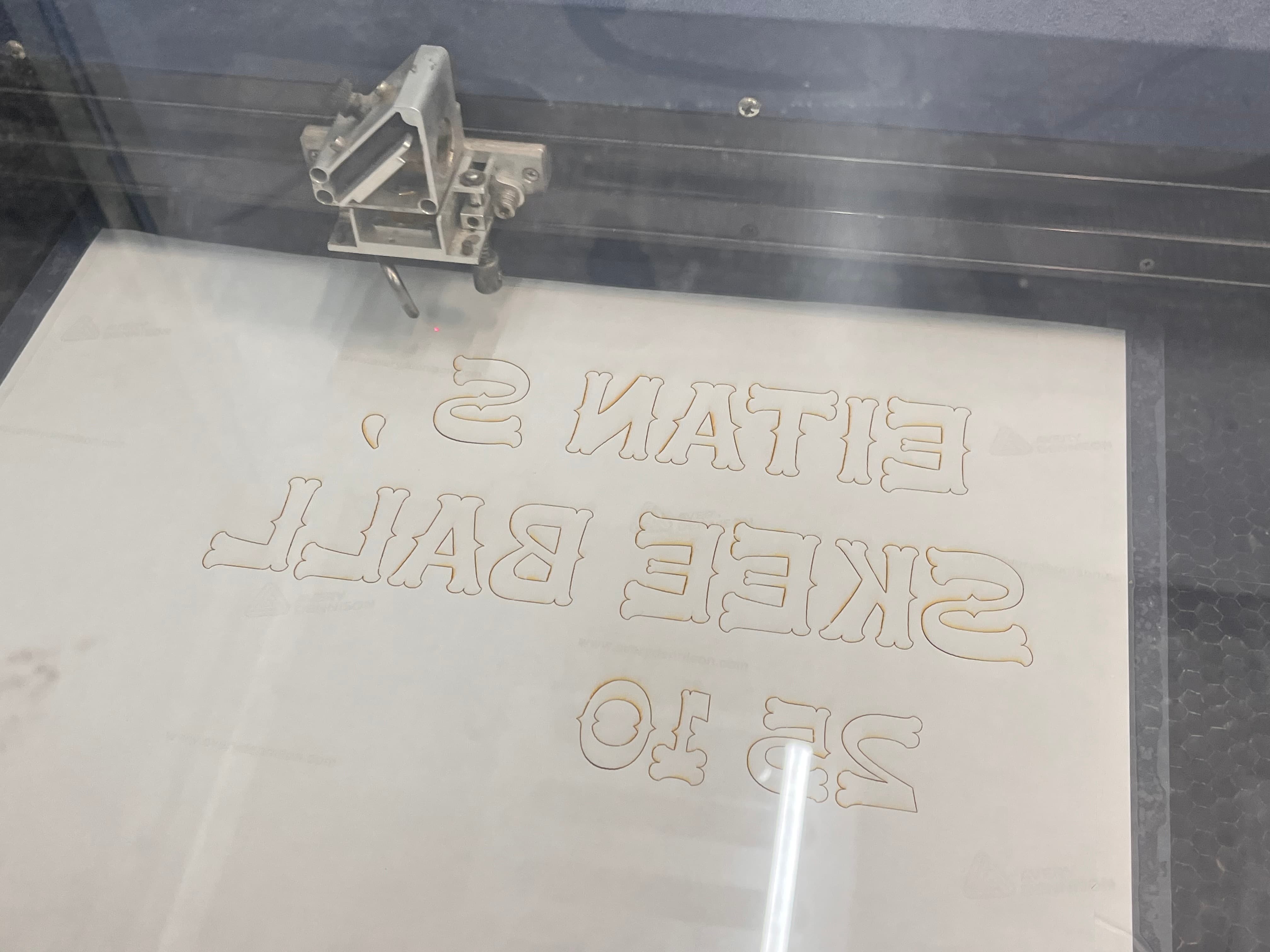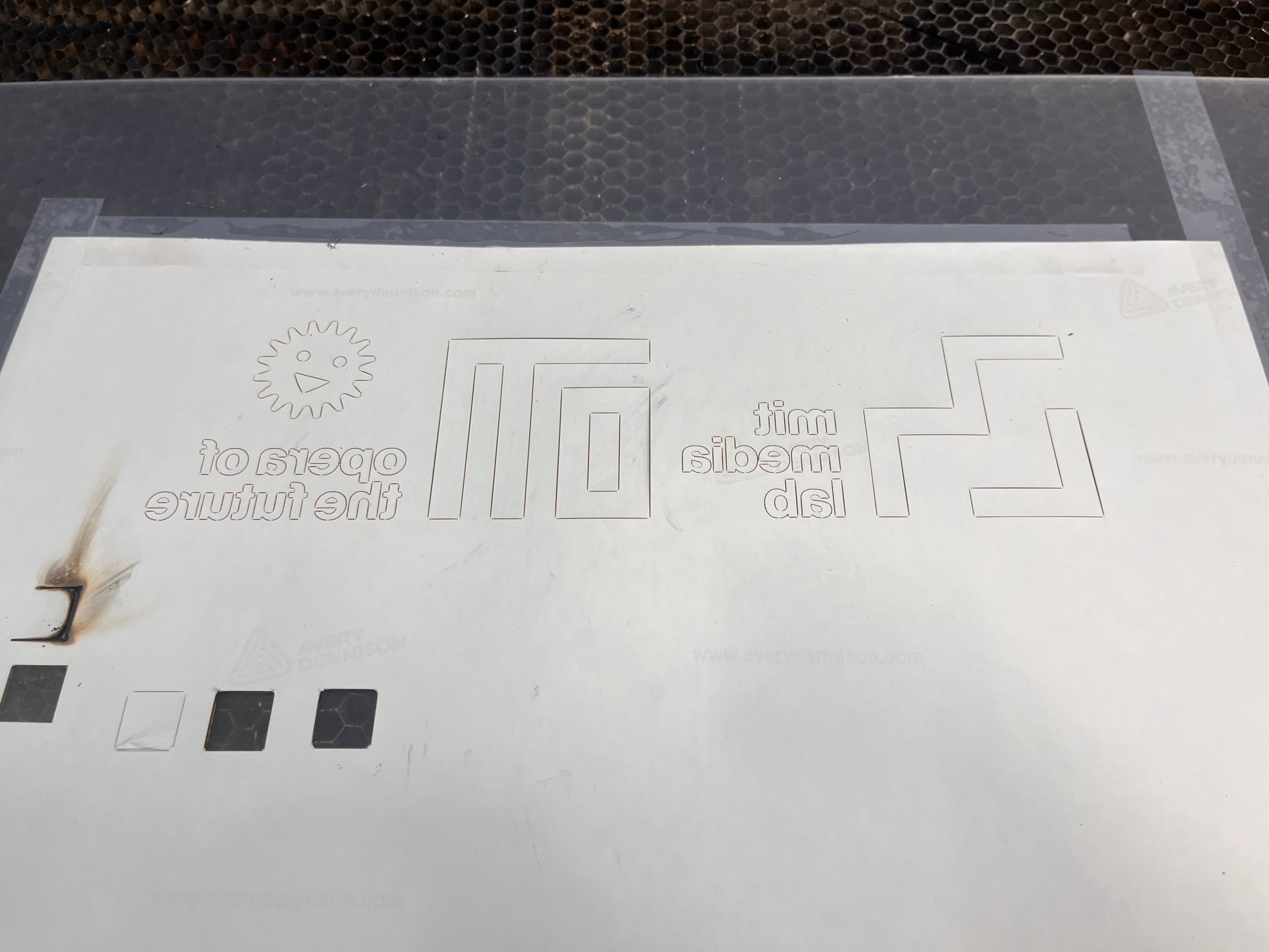 I also wanted to add some lettering and scores for the holes. Using the laser cutter, I taped some vinyl to an acrylic sheet, did a couple tests of laser speed and strength (final was 100% speed, 15% strength), and cut out the media lab logo as well as some additional letters. It was then a breeze to remove them and apply it all to the build.