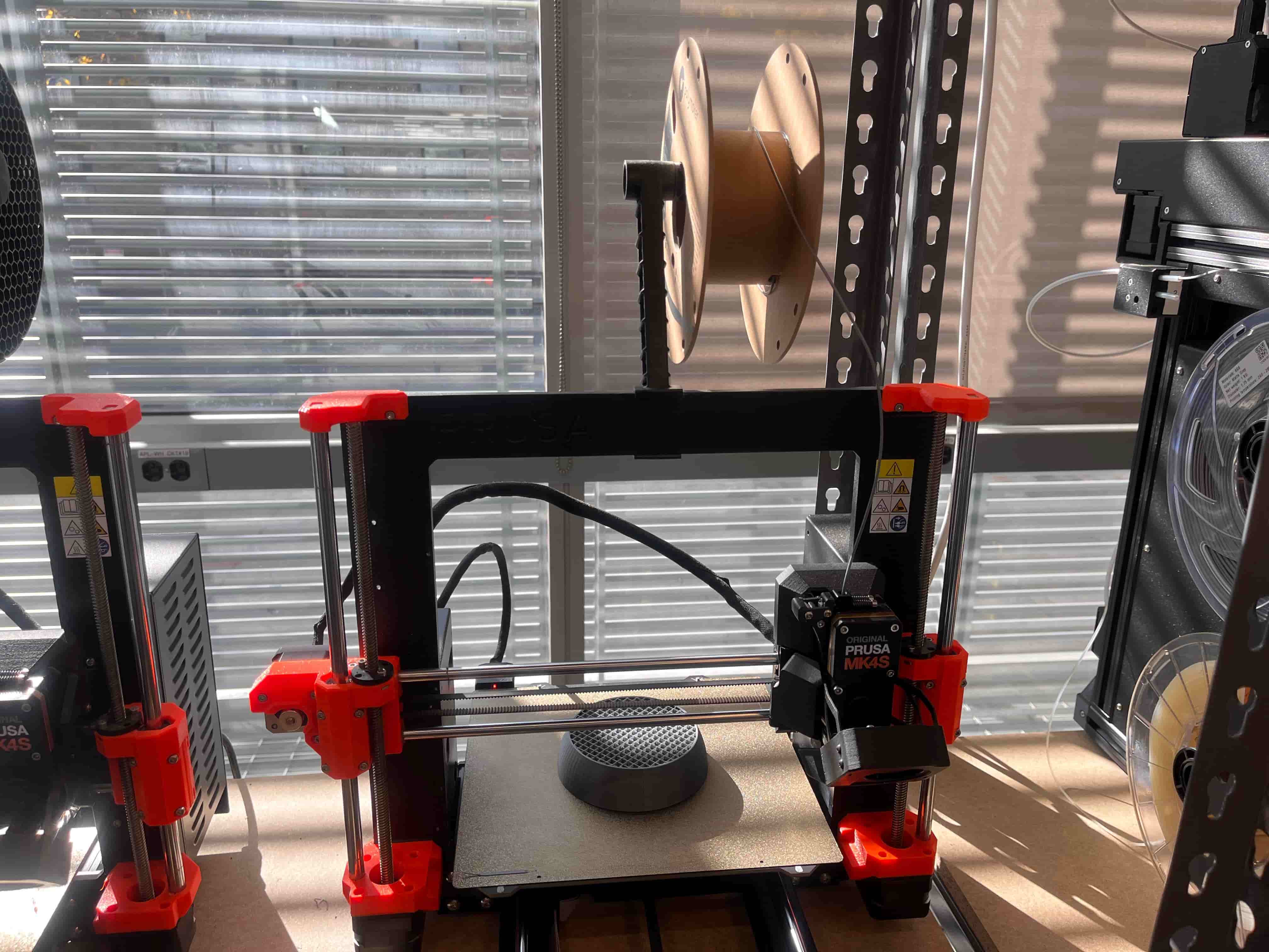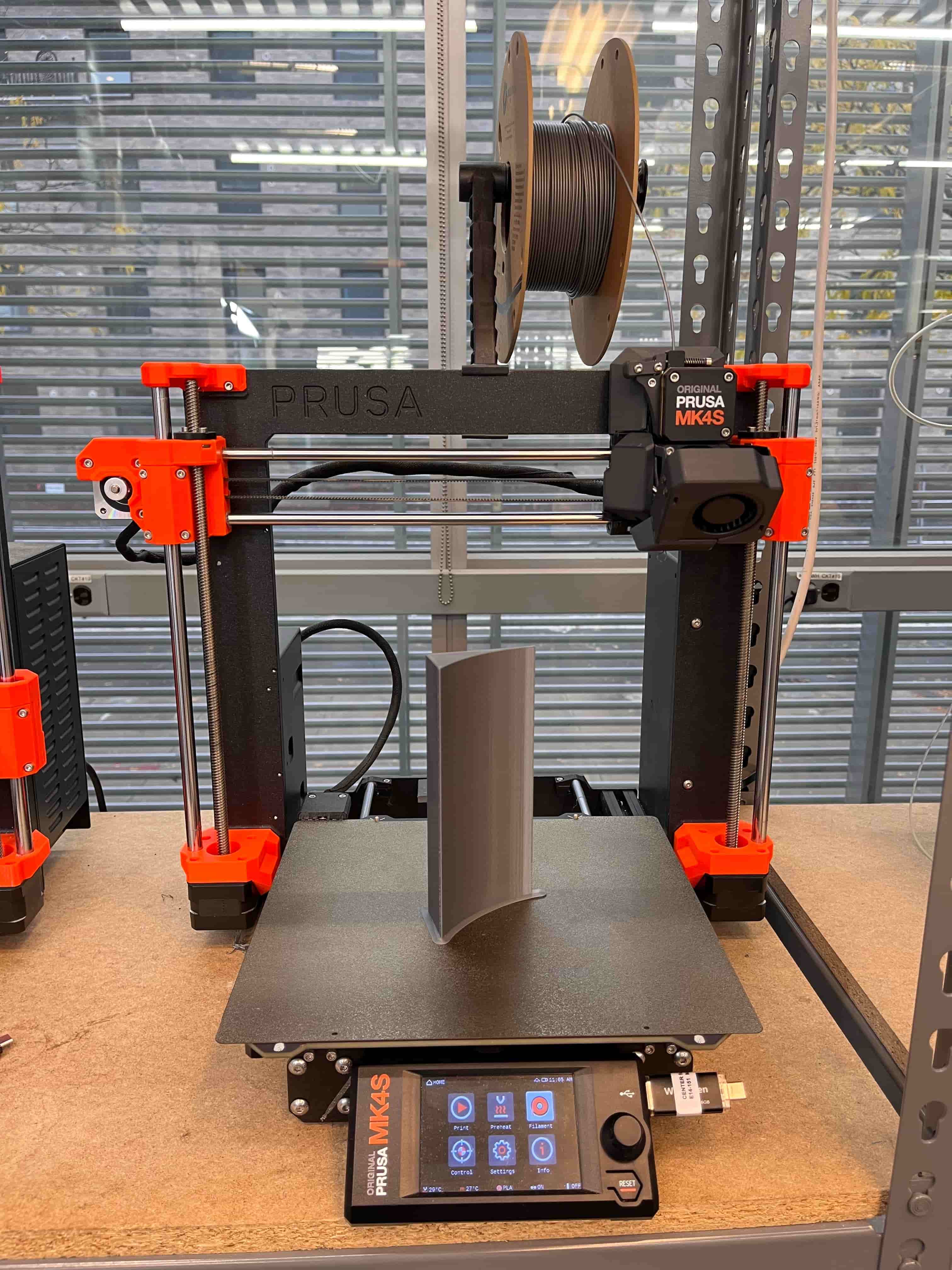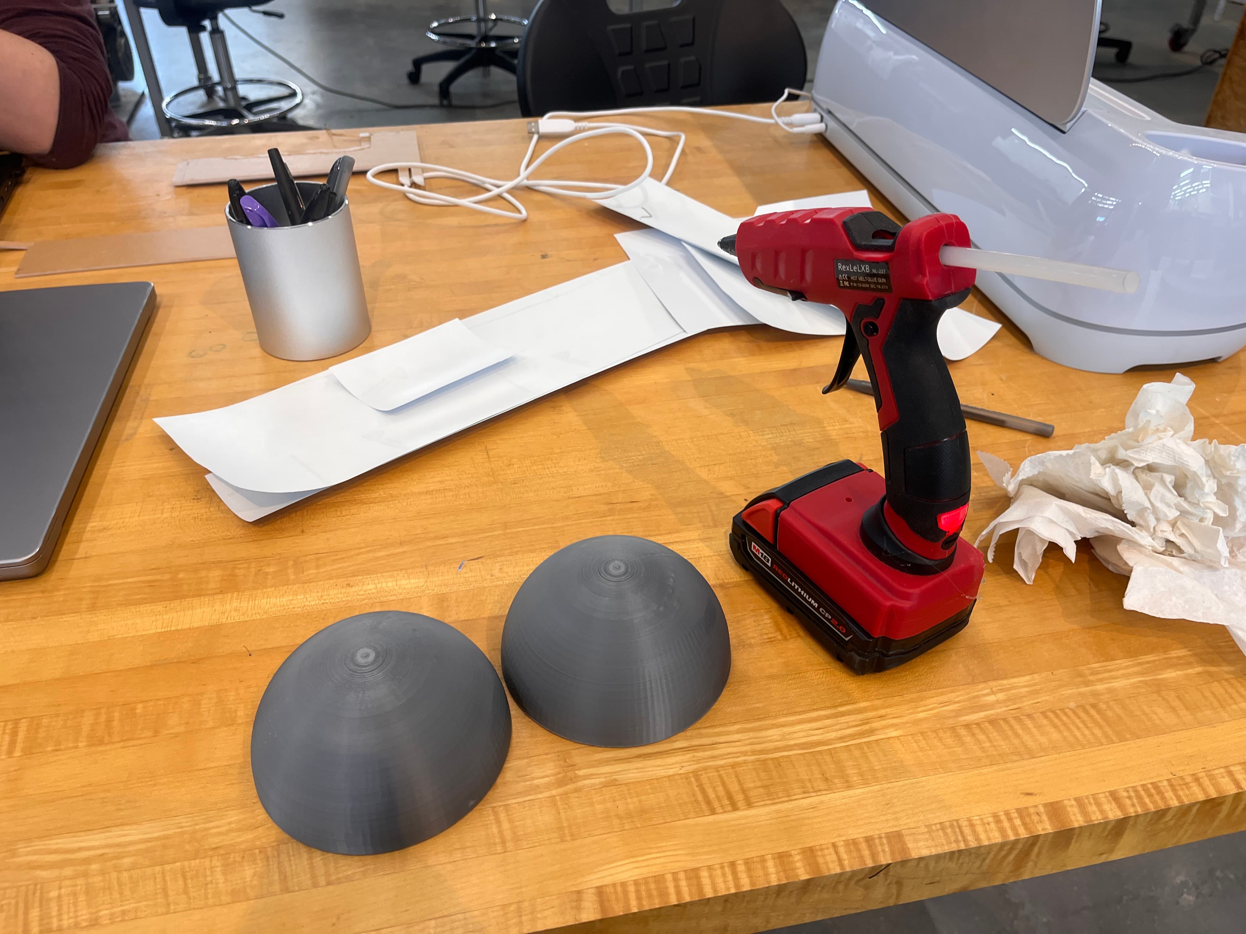 Then I brought it into Prusa and began printing on two machines! Unfortunately, in the middle of one the filament ran out, but I was able to wait until the first was finished, remove the filament from that machine, and bring it back up to finish the first. Once they were both done, I just hot-glued them together and clamped it until I thought it dried.