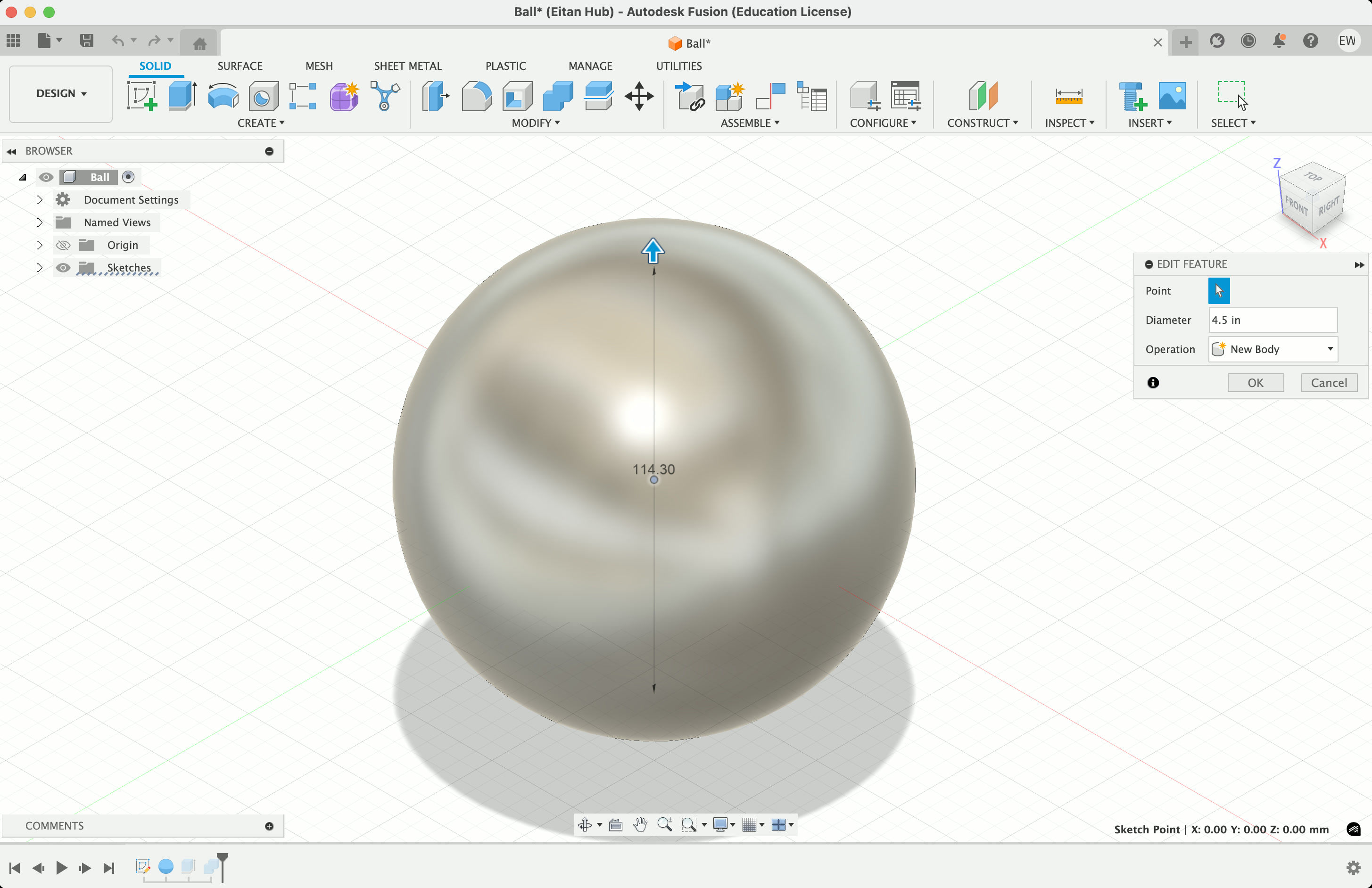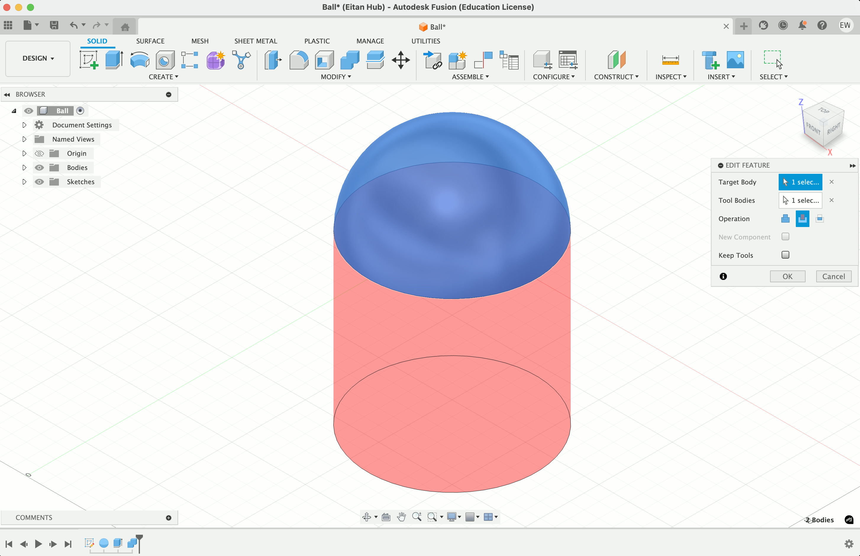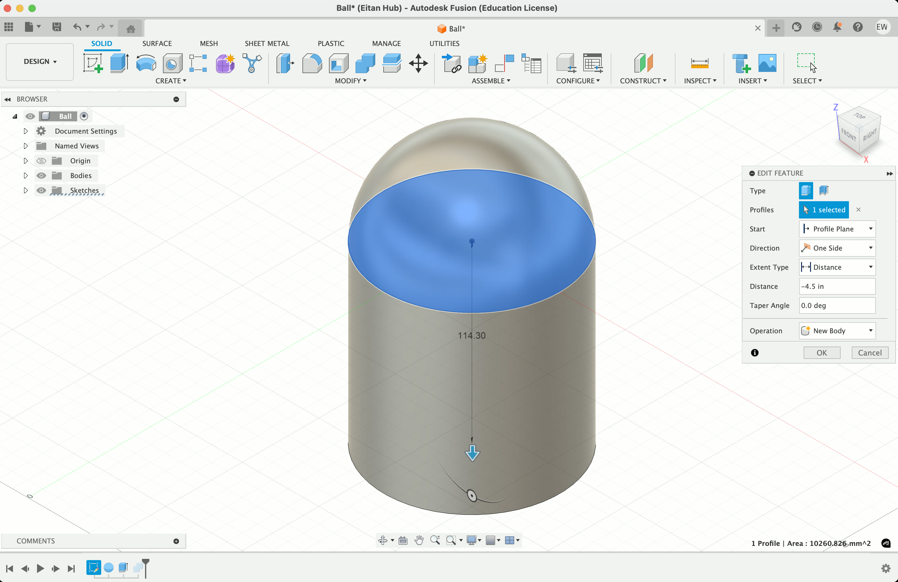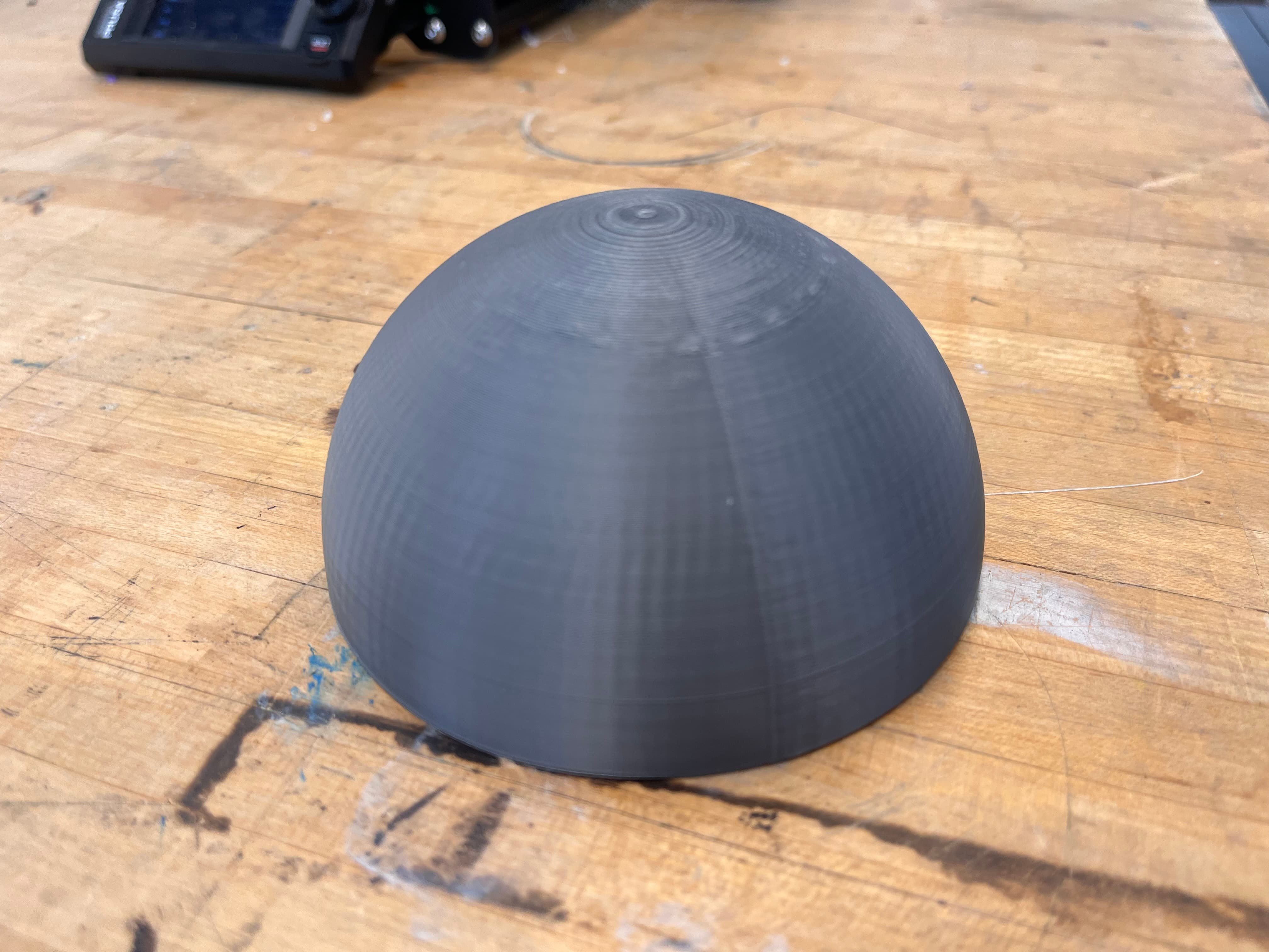 I also decided to 3D print my ball, as the bouncier one I had earlier wasn't quite what I needed – I want it to roll up the ramp, not bounce. So I went into Fusion, made a circle about ~4.5" wide, added a sphere on top of it, extruded the circle into a cylinder, then used it to split the sphere in half. There's probably a smarter way to do this, but I was having a suprising amount of trouble, so i was happy this worked.