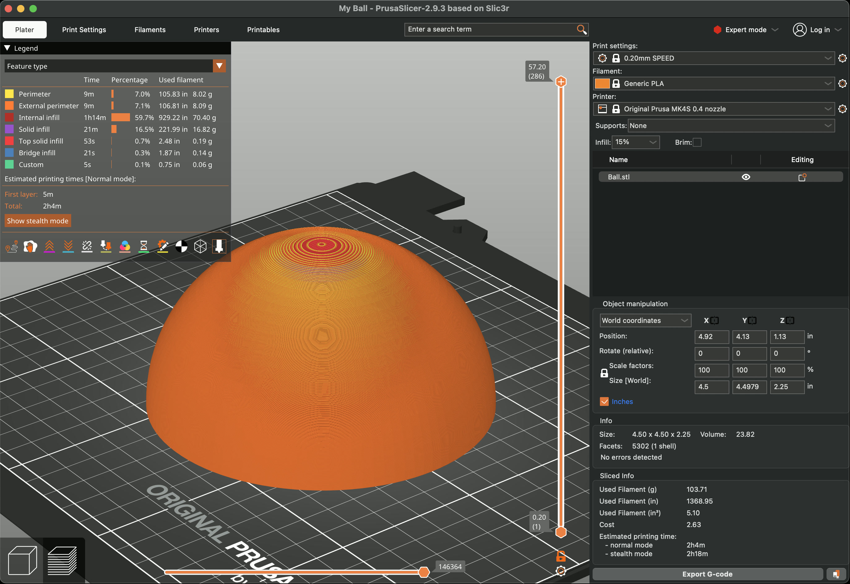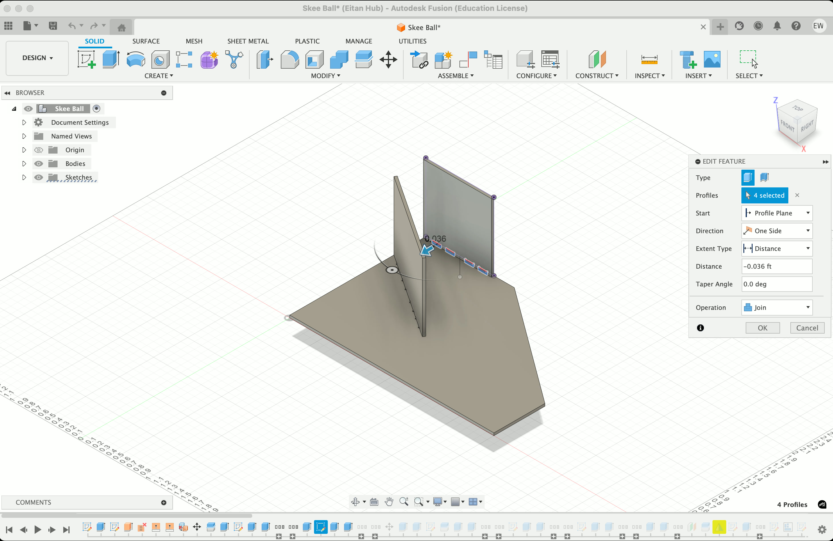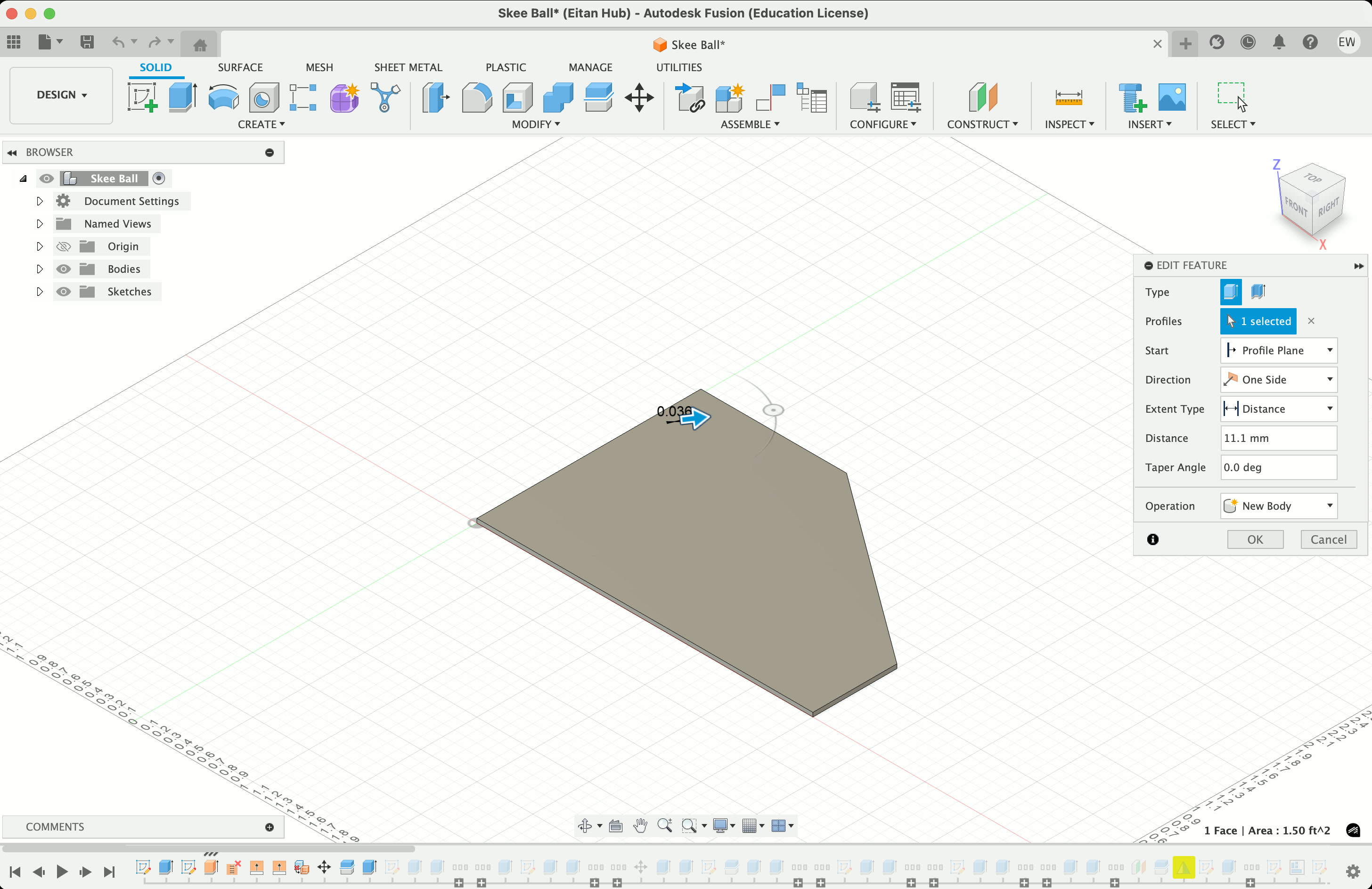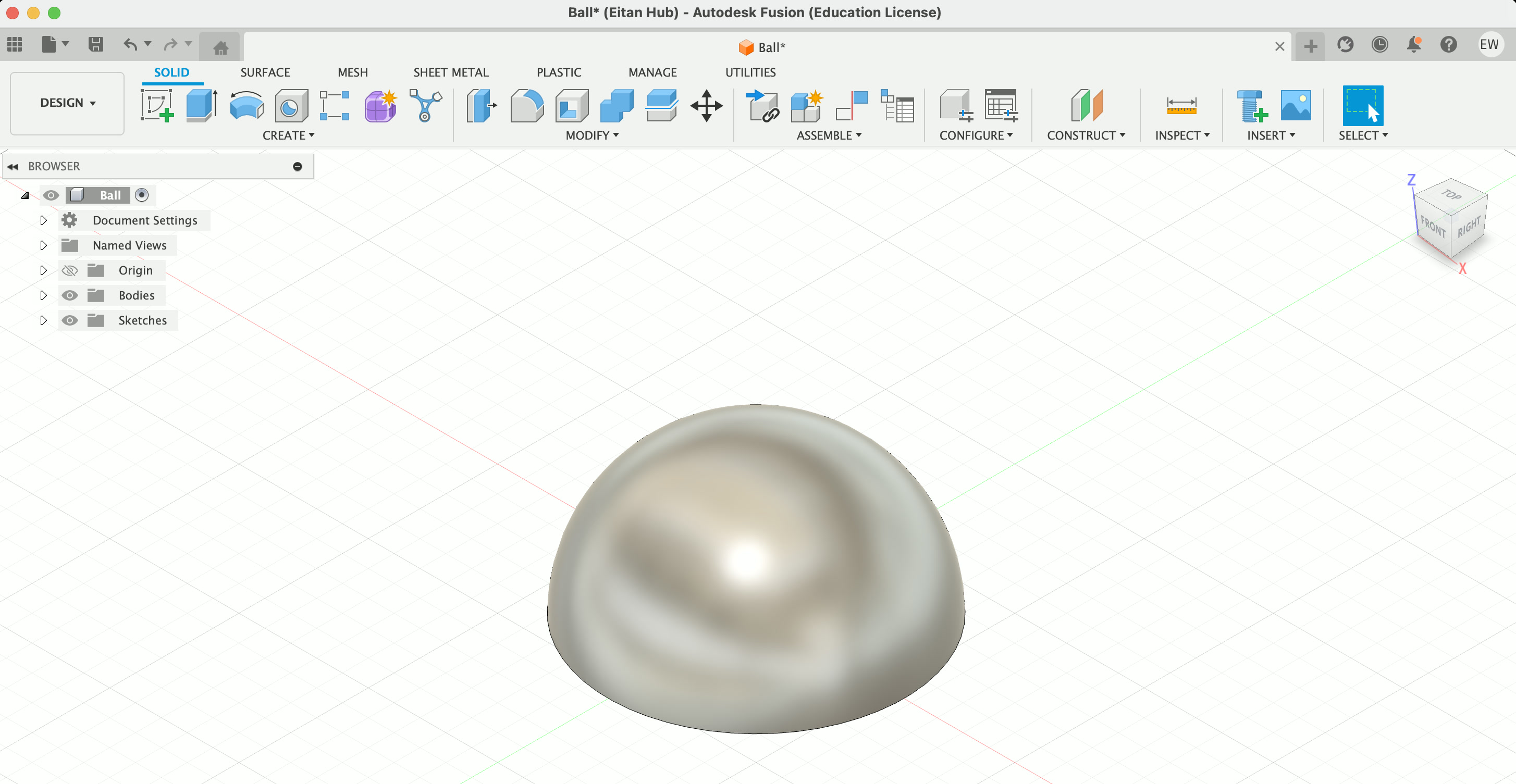 I also decided to 3D print my ball, as the bouncier one I had earlier wasn't quite what I needed – I want it to roll up the ramp, not bounce. So I went into Fusion, made a circle about ~4.5" wide, added a sphere on top of it, extruded the circle into a cylinder, then used it to split the sphere in half. There's probably a smarter way to do this, but I was having a suprising amount of trouble, so i was happy this worked.