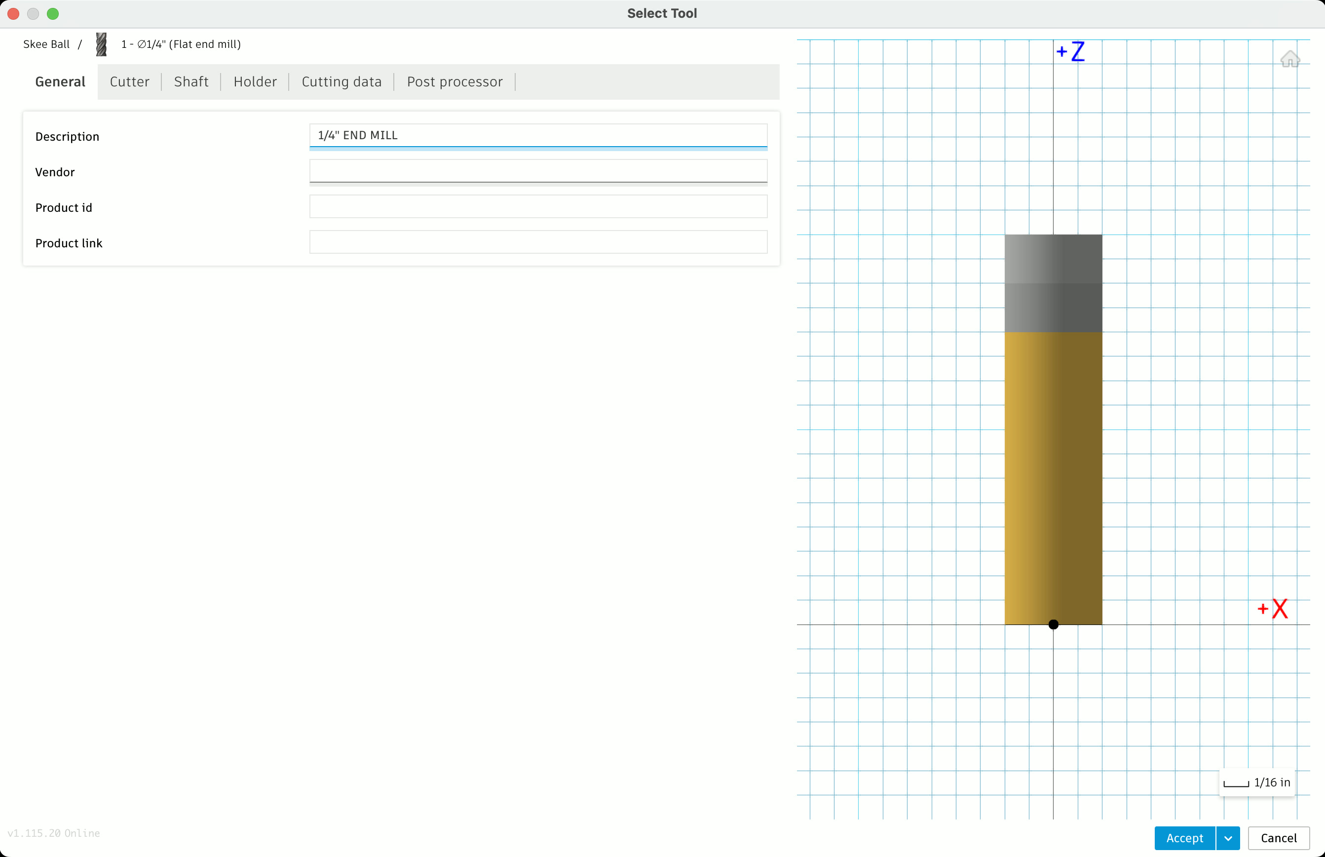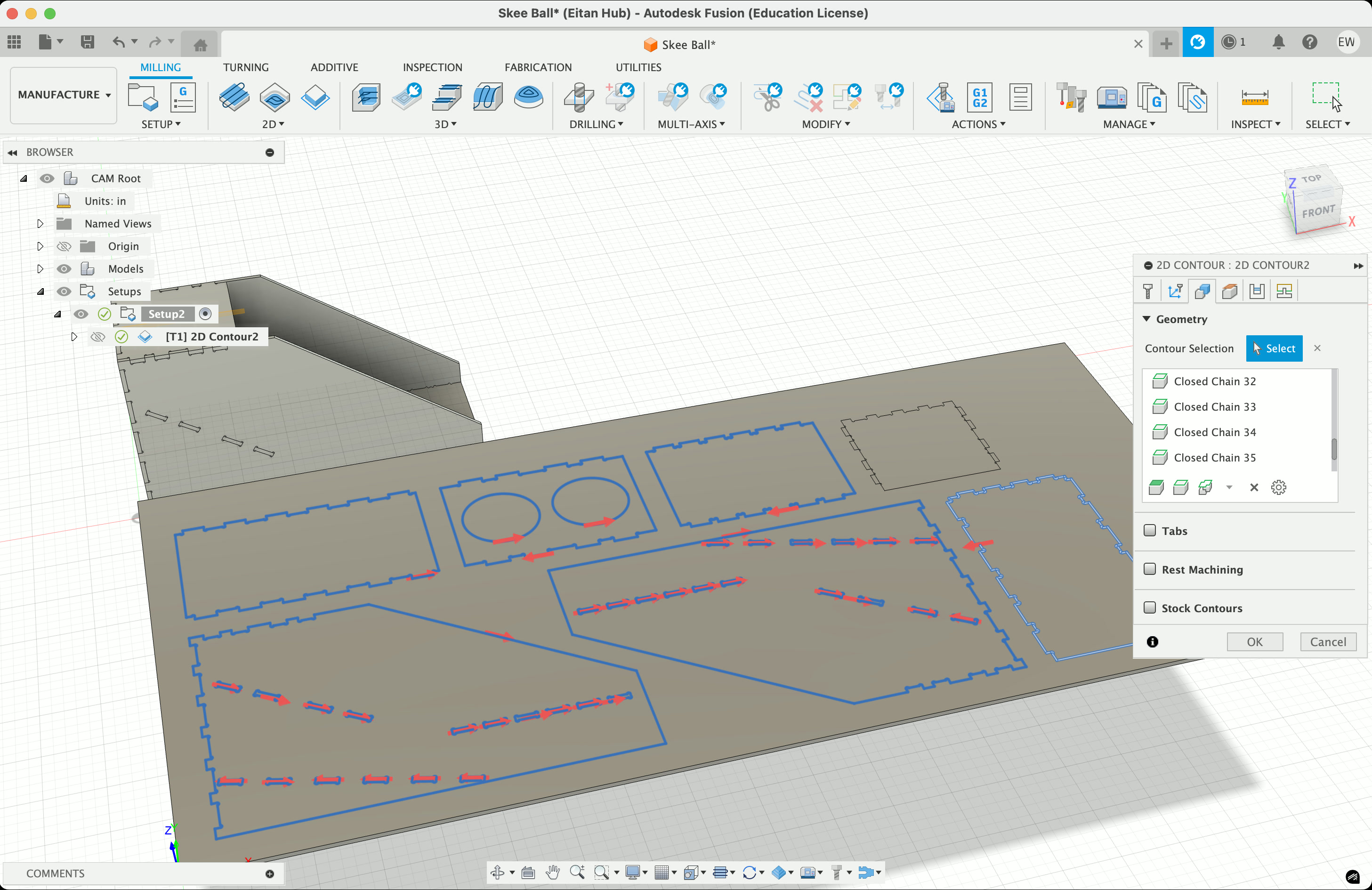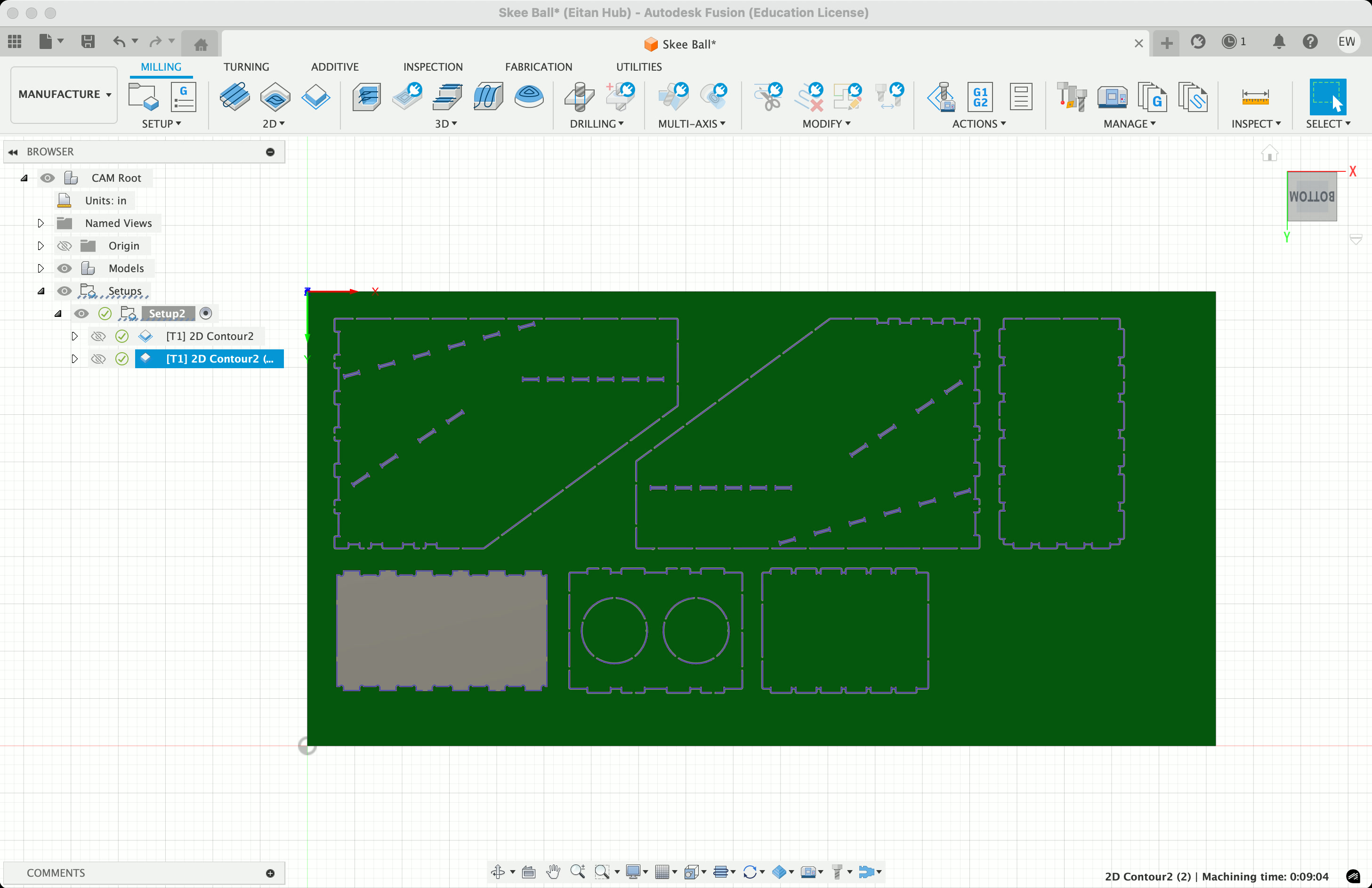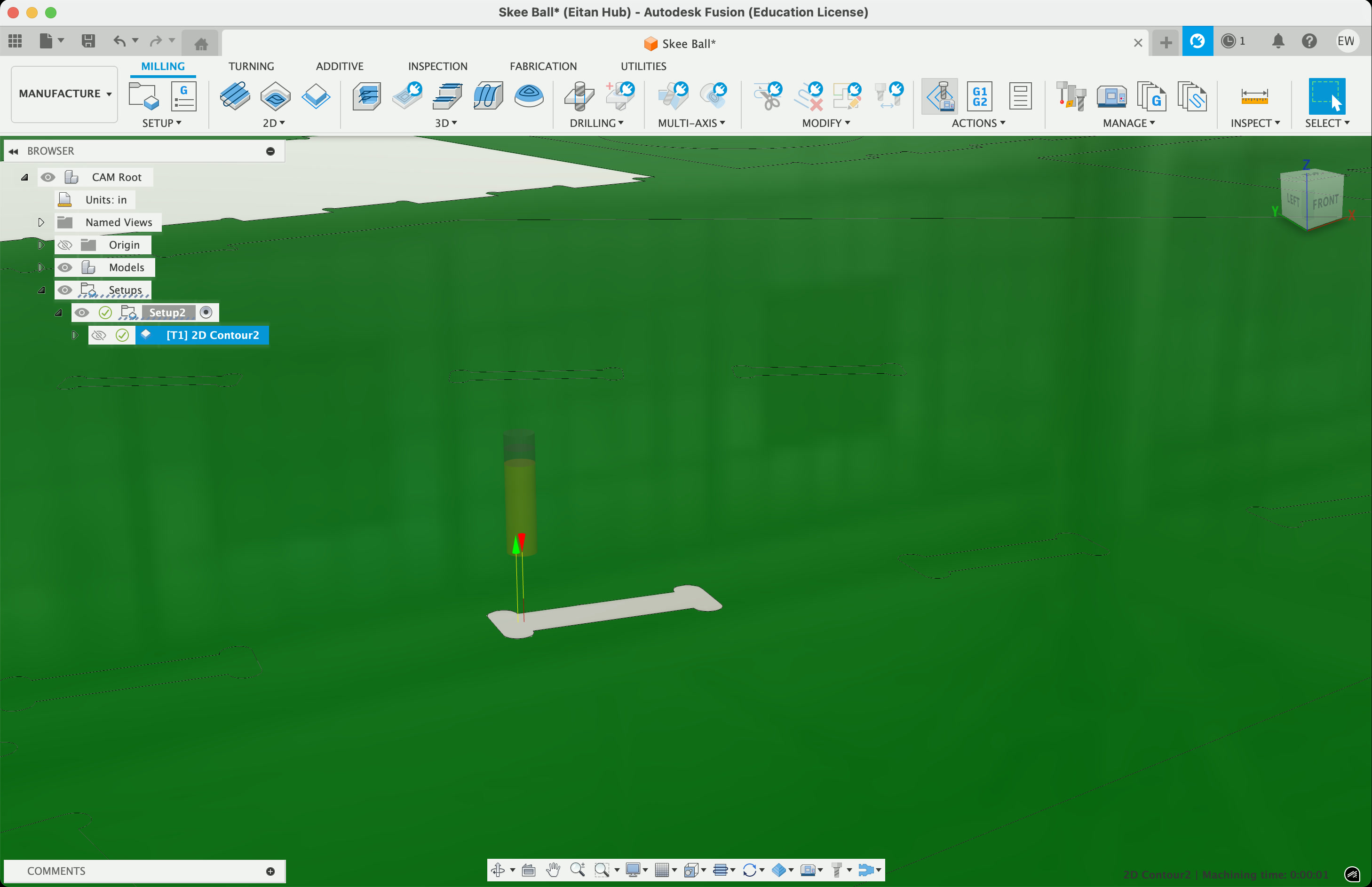 We then move into the "Manufacturing" tab, and create a new setup for milling, adding a new 1/4" end mill as the tool. Use the "2D Contour" tool and select all your edges, then use the "Simulate" tool to make sure the intended cutting path looks about right. Make sure to zoom in and slow down the simulation speed to ensure it's actually milling all the way through, that nothing is left out, etc.