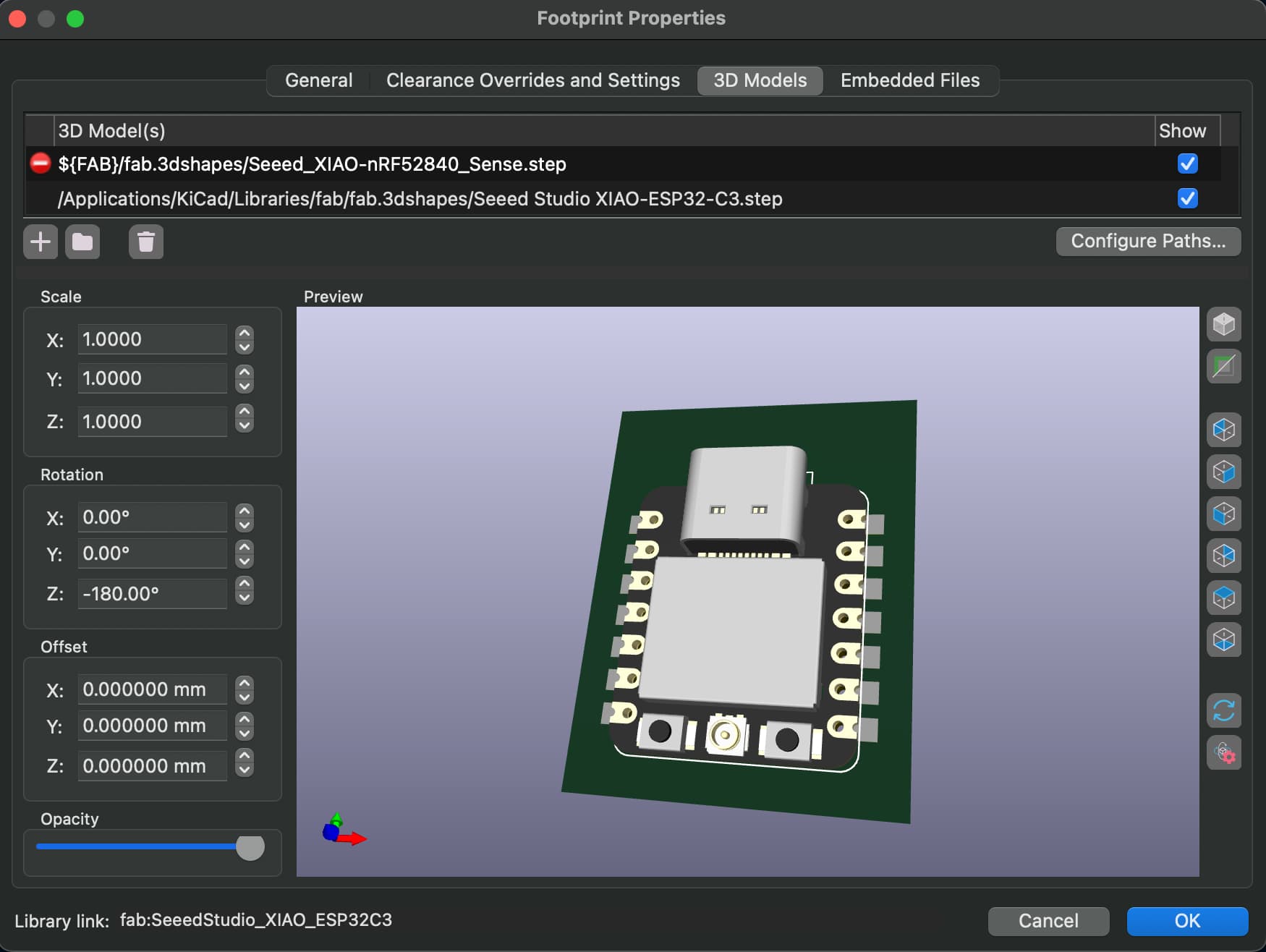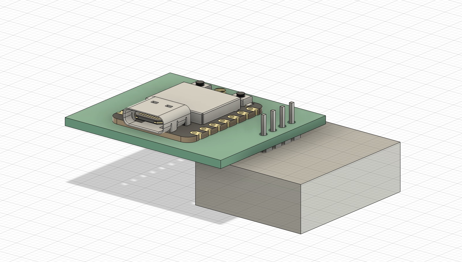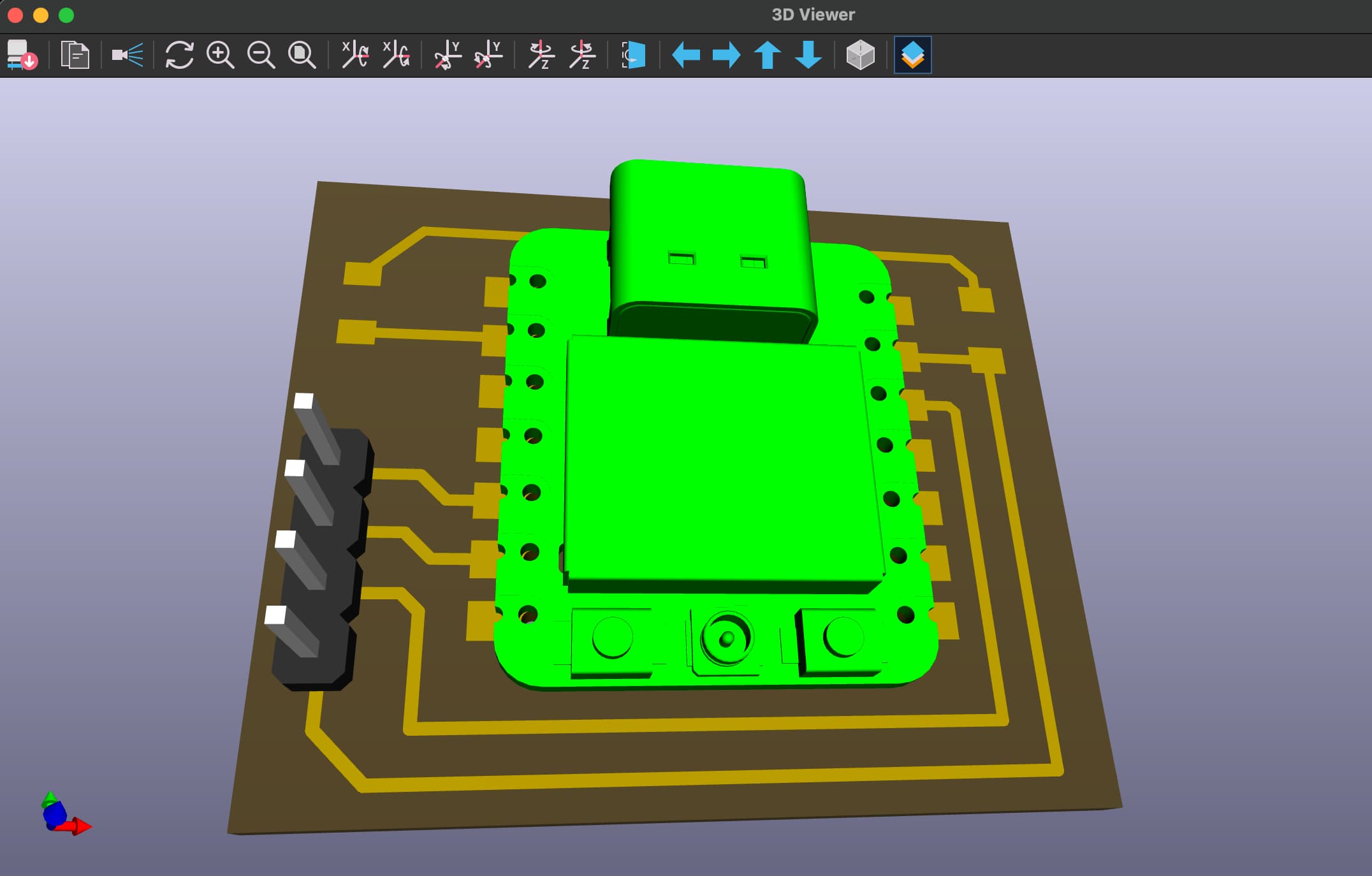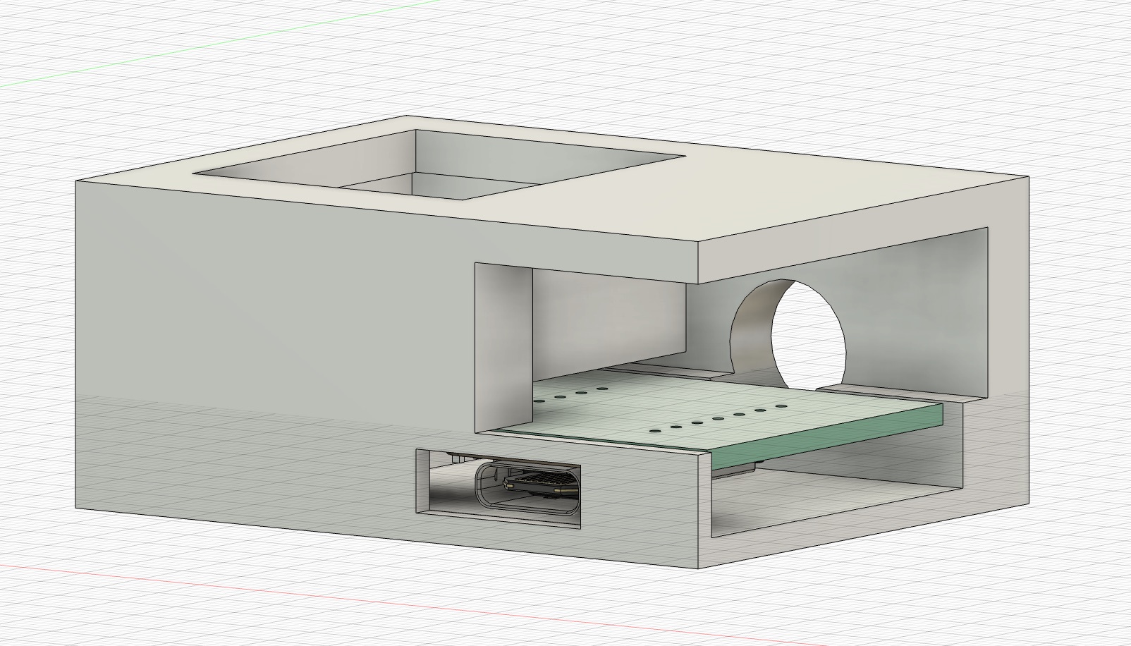 I also wanted to try making a 3D-printed case for my build this week. I was able to find a 3D model of the ESP32C3, and import it into KiCAD to combine with the connector I was using; then export those into Fusion360 to model around: