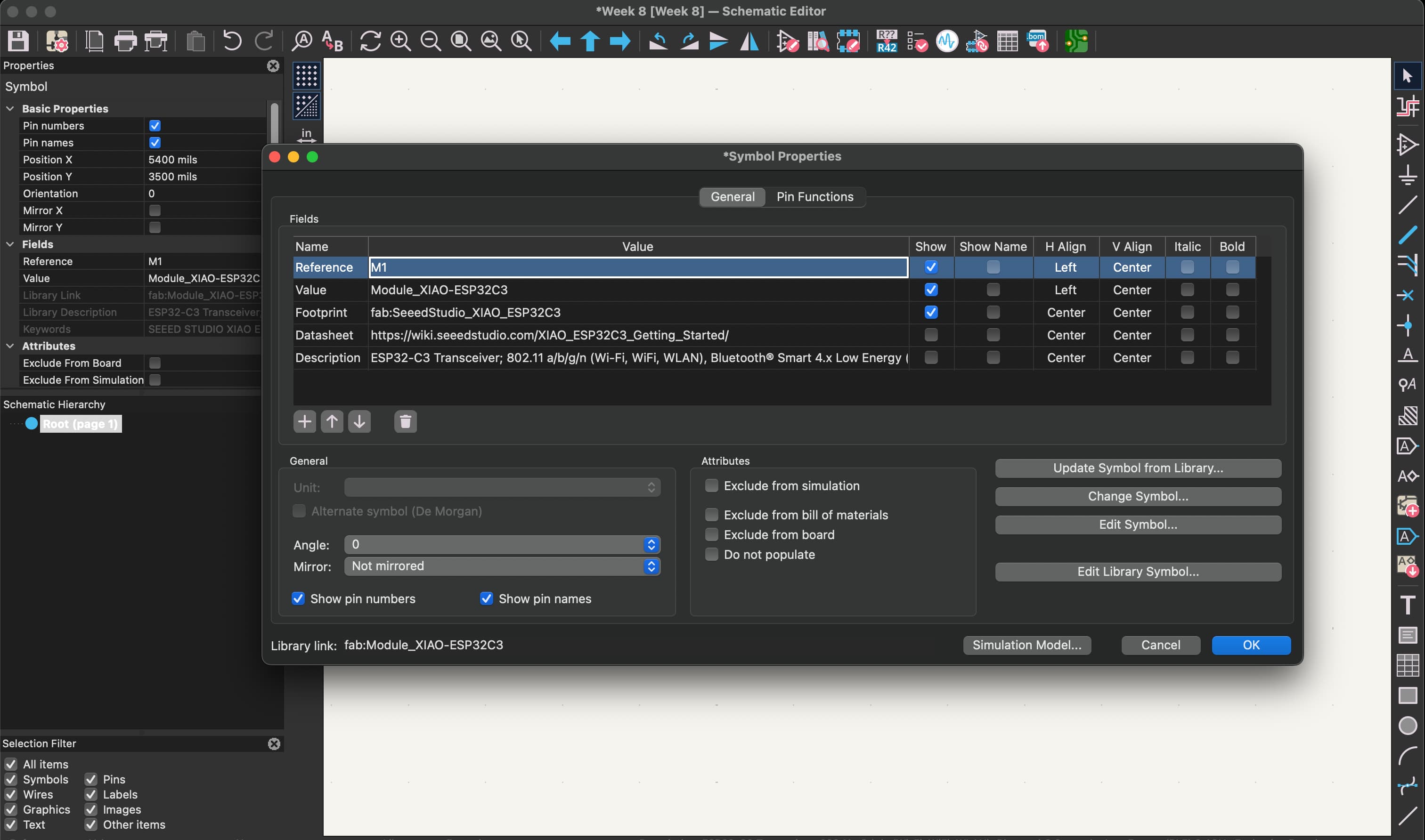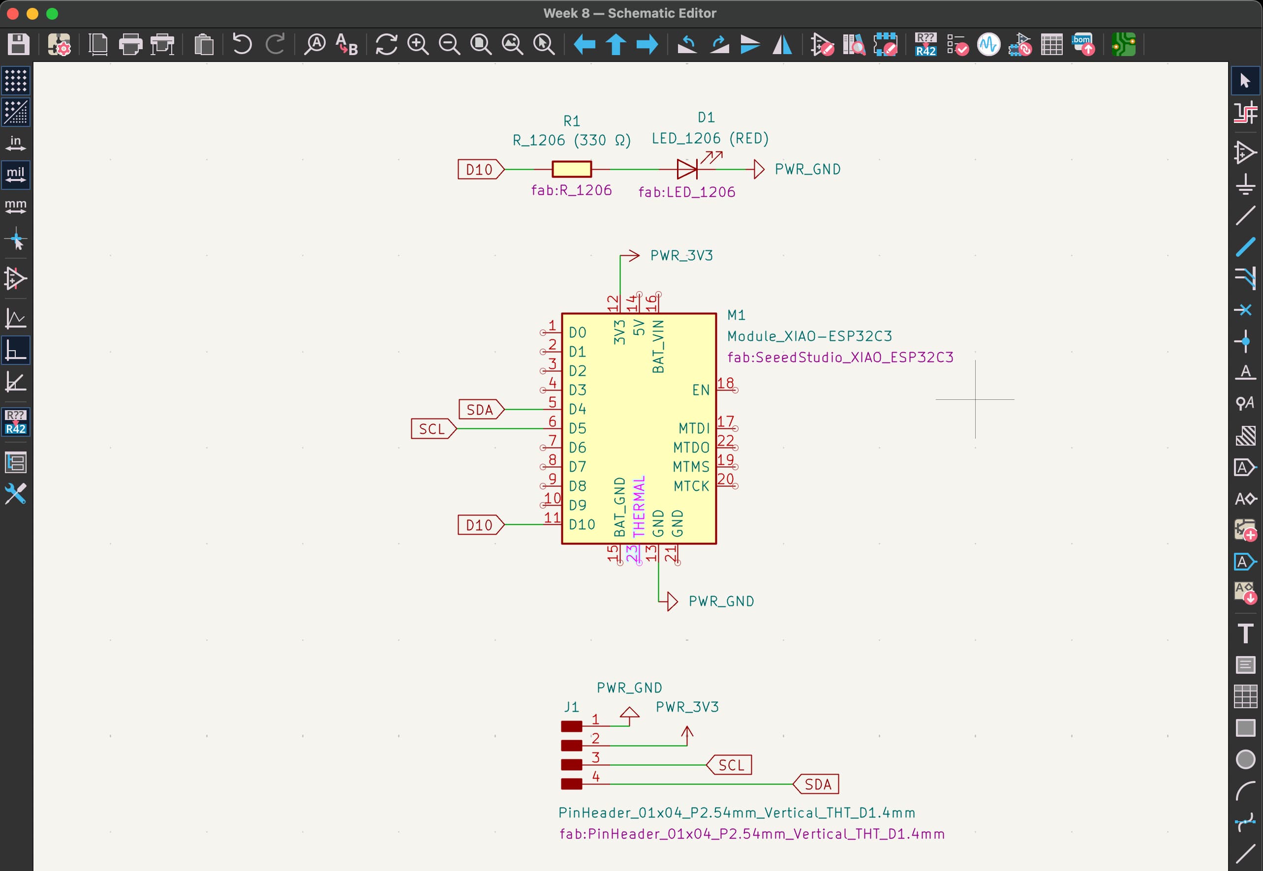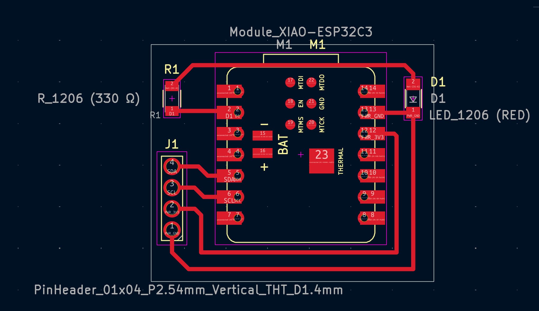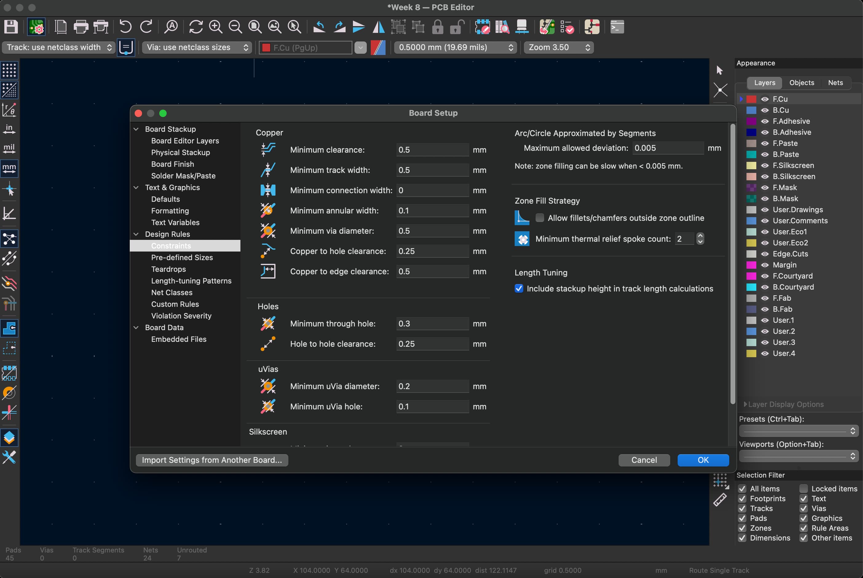 I then exported into the KiCAD PCB view, where I started actually designing how each component would be connected on my intended PCB board. I made sure to up the minimum clearance to 0.5mm based on what we found in previous weeks.