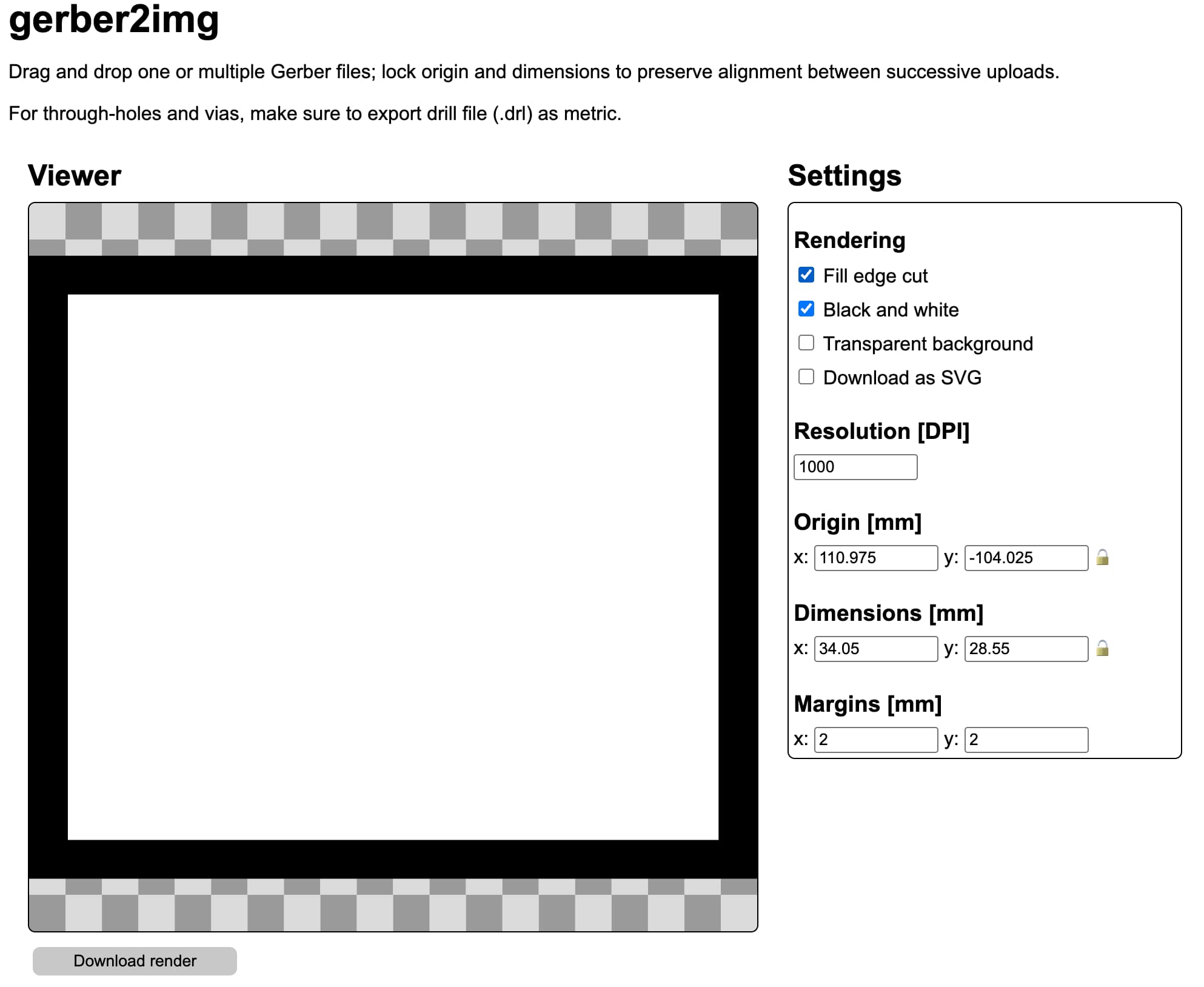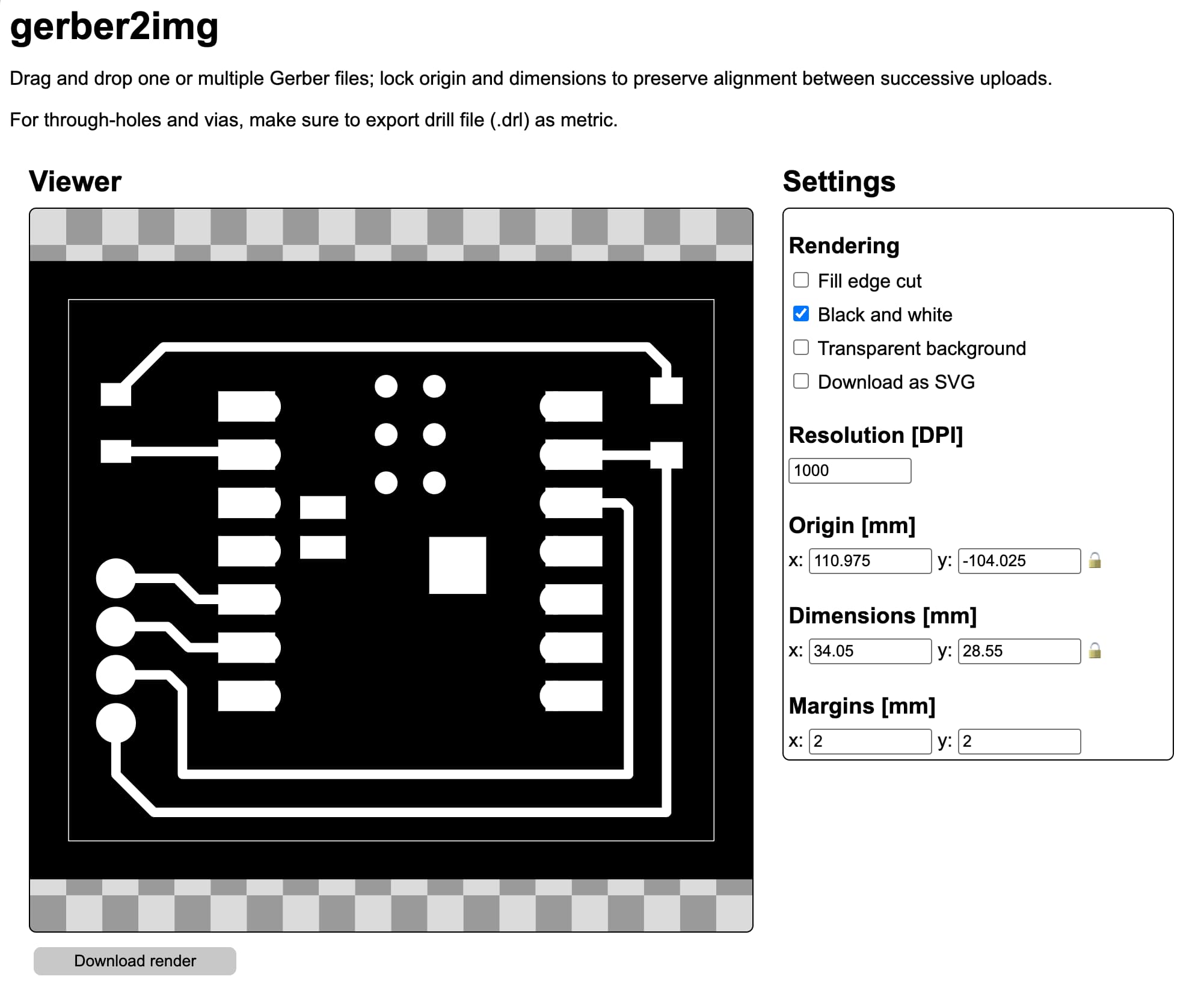 Now that I had my Gerber and Drill files, all I needed to do was drop them into Quentin's "gerber2image tool." That generates the two .pngs pictured below: