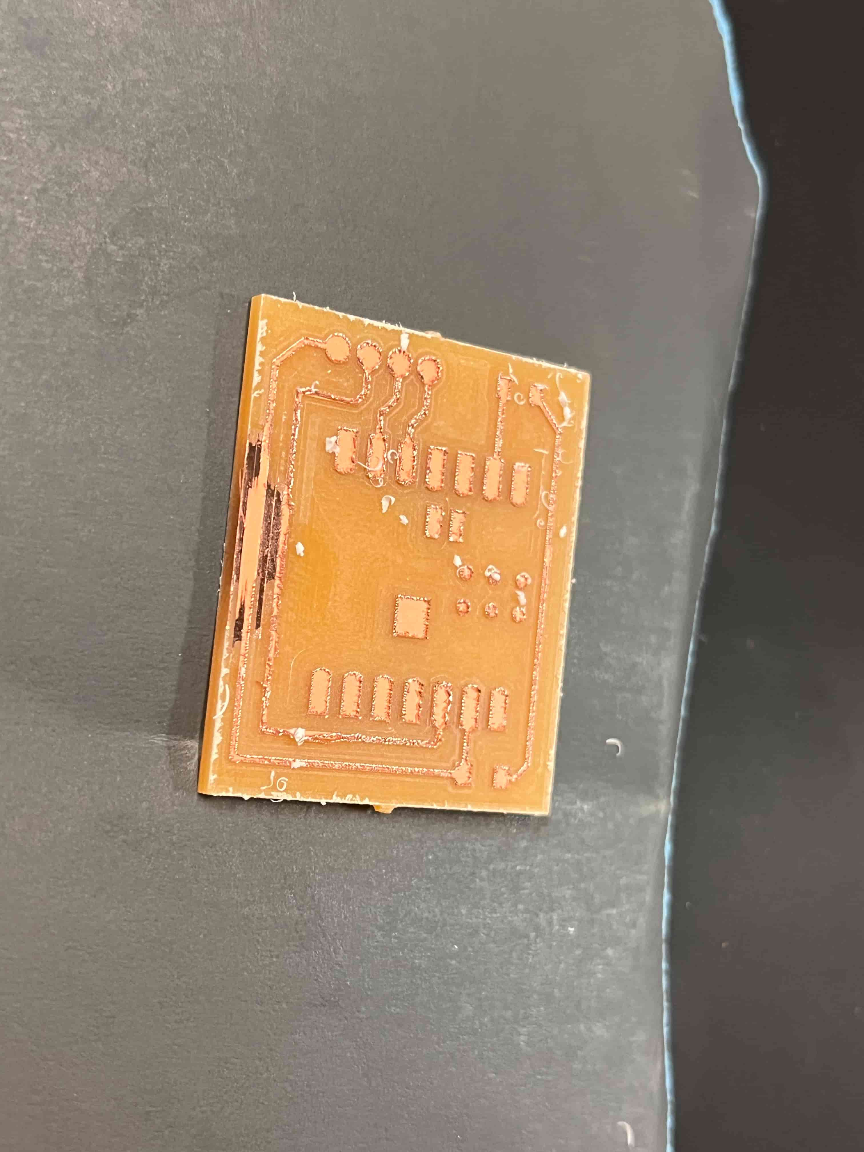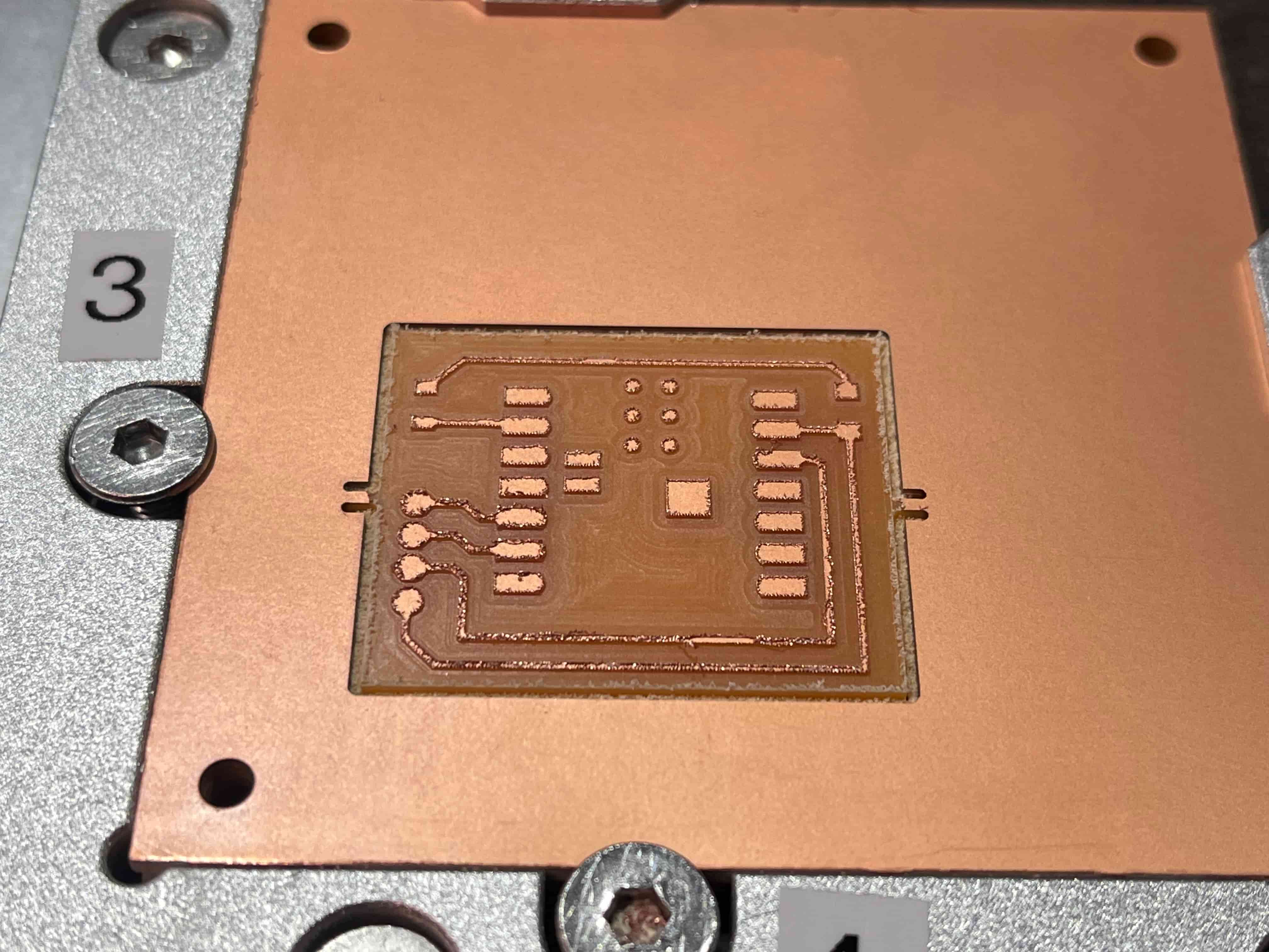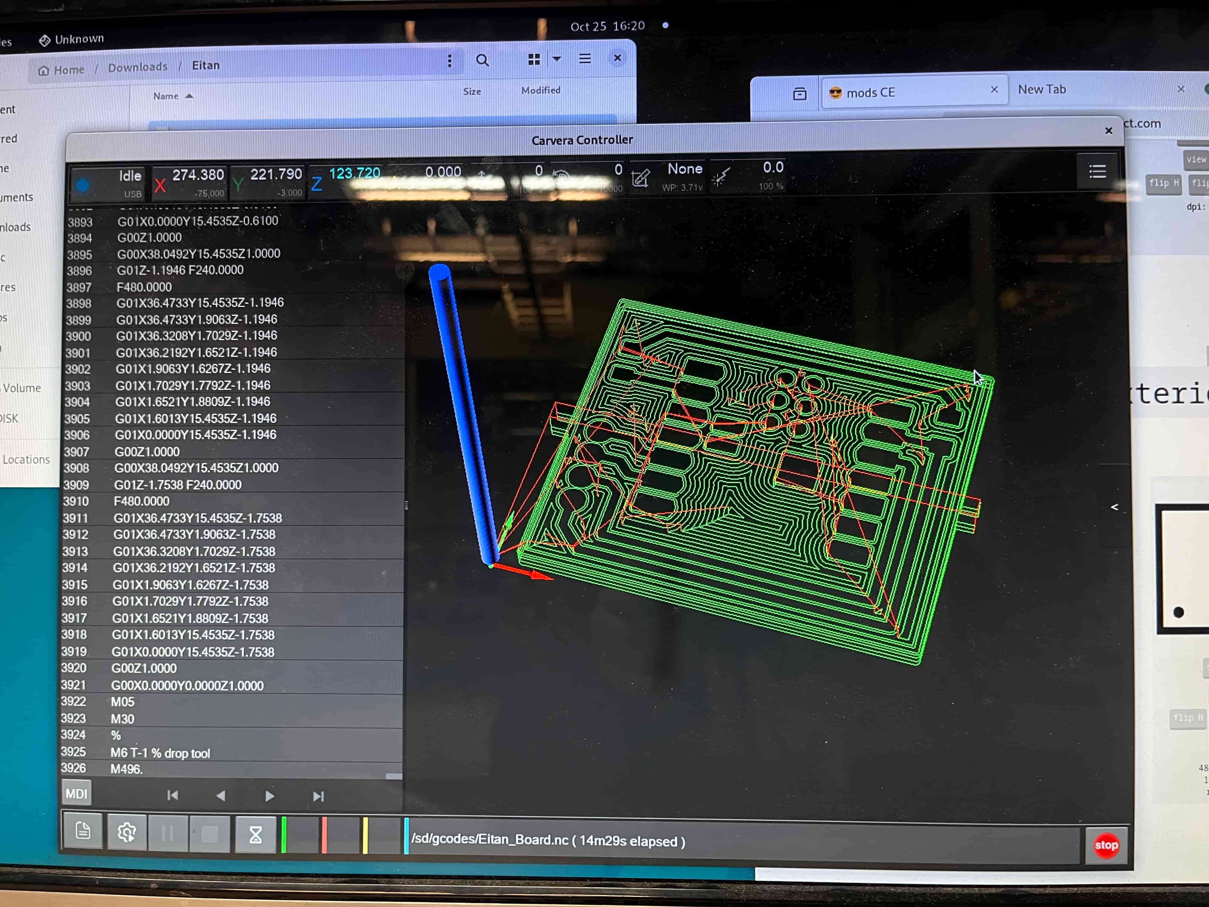 Then I brought my .nc file over USB to the milling machine, plugged it in, made sure the offset was aligned with my intended board shape (avoiding the screws holding the board in), and hit "Run"!