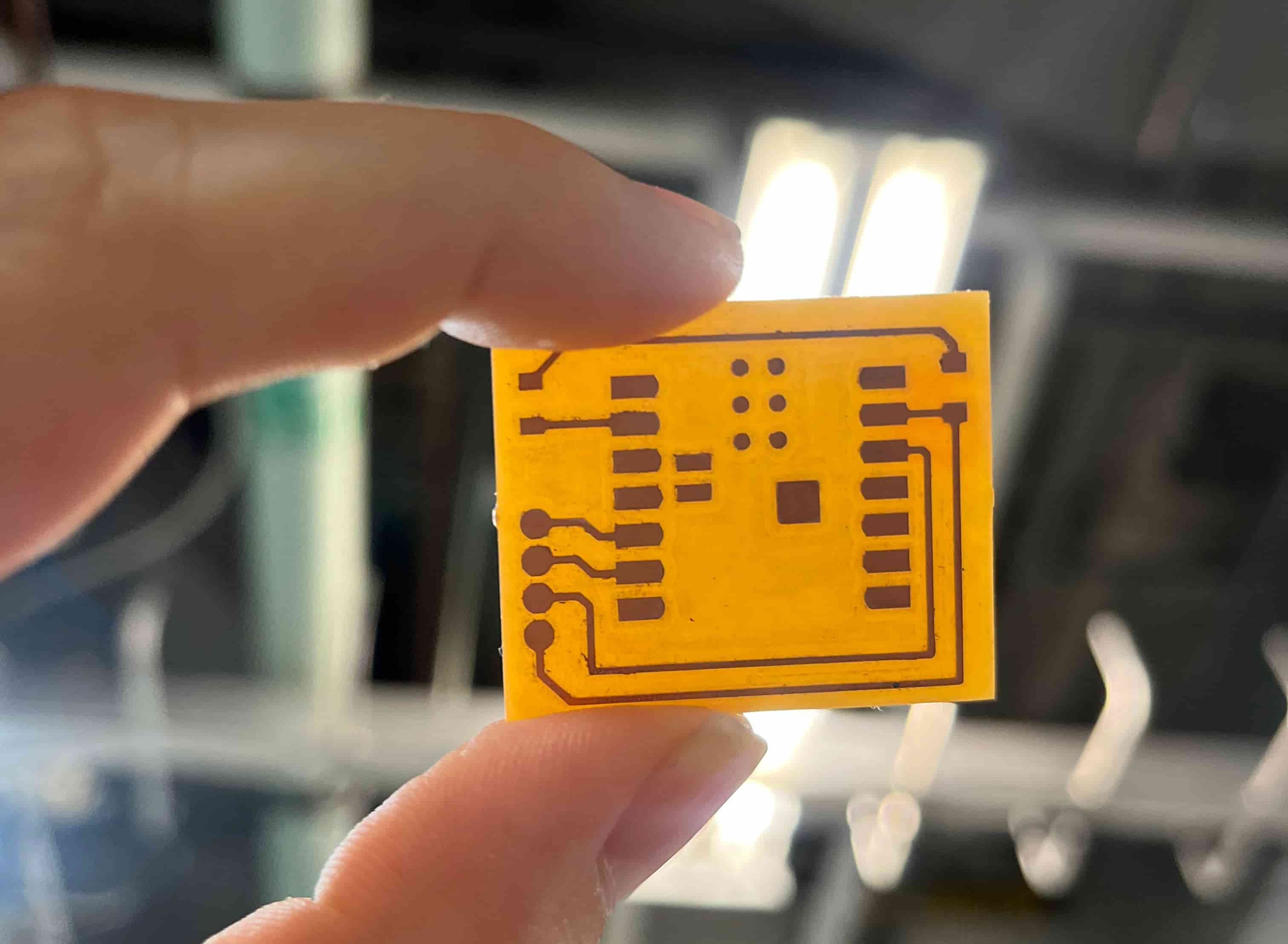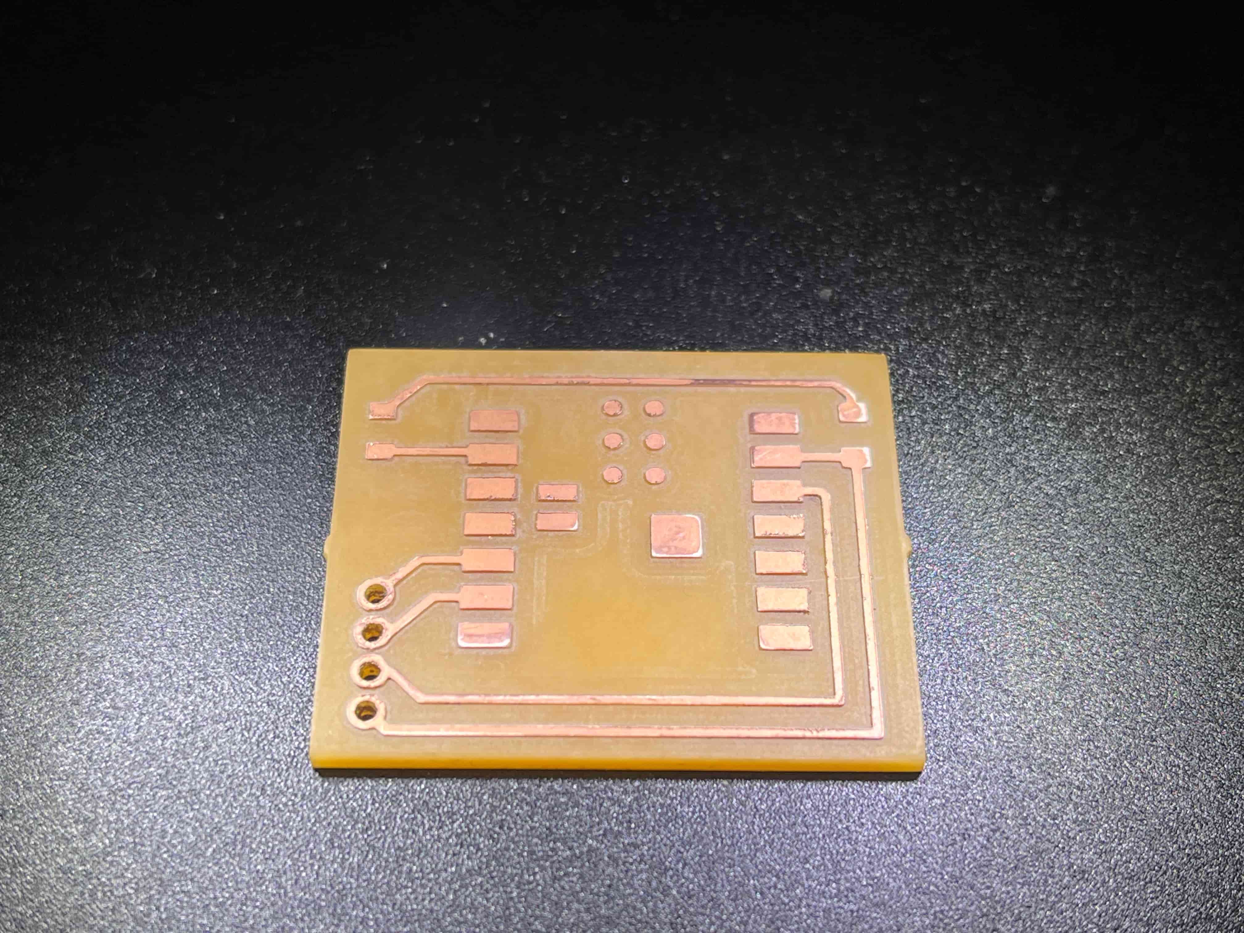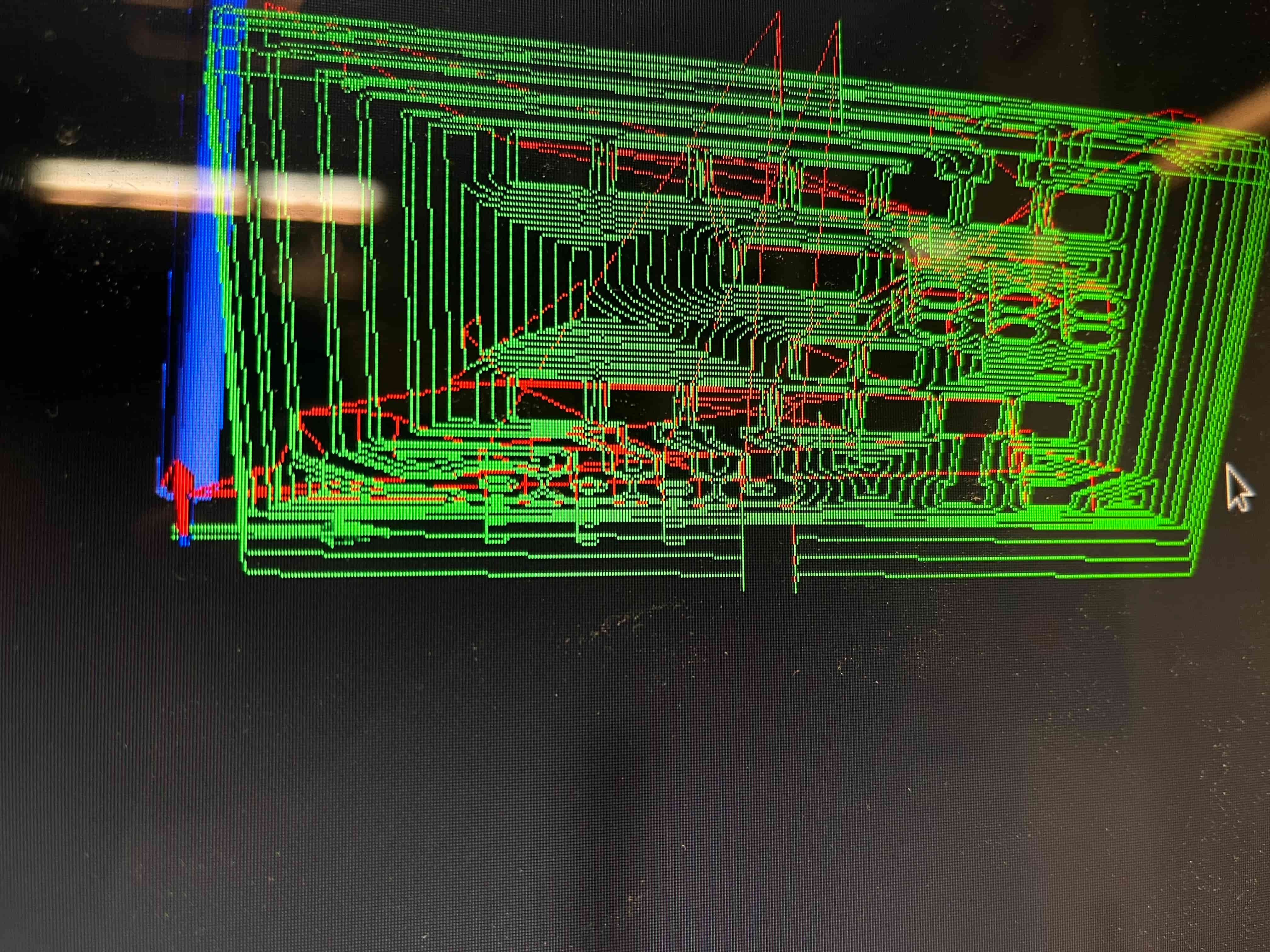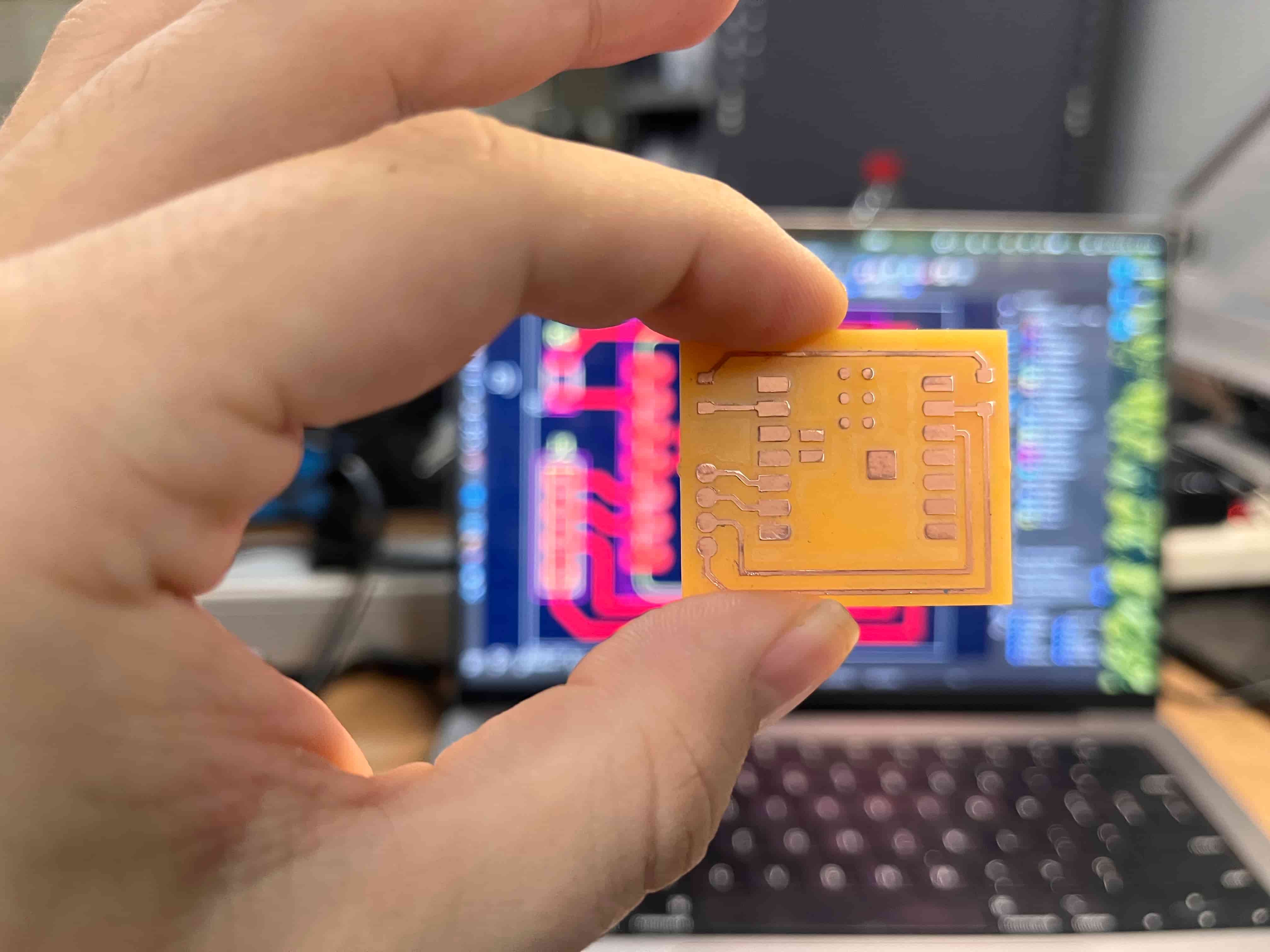 Then I brought my .nc file over USB to the milling machine, plugged it in, made sure the offset was aligned with my intended board shape (avoiding the screws holding the board in), and hit "Run"!