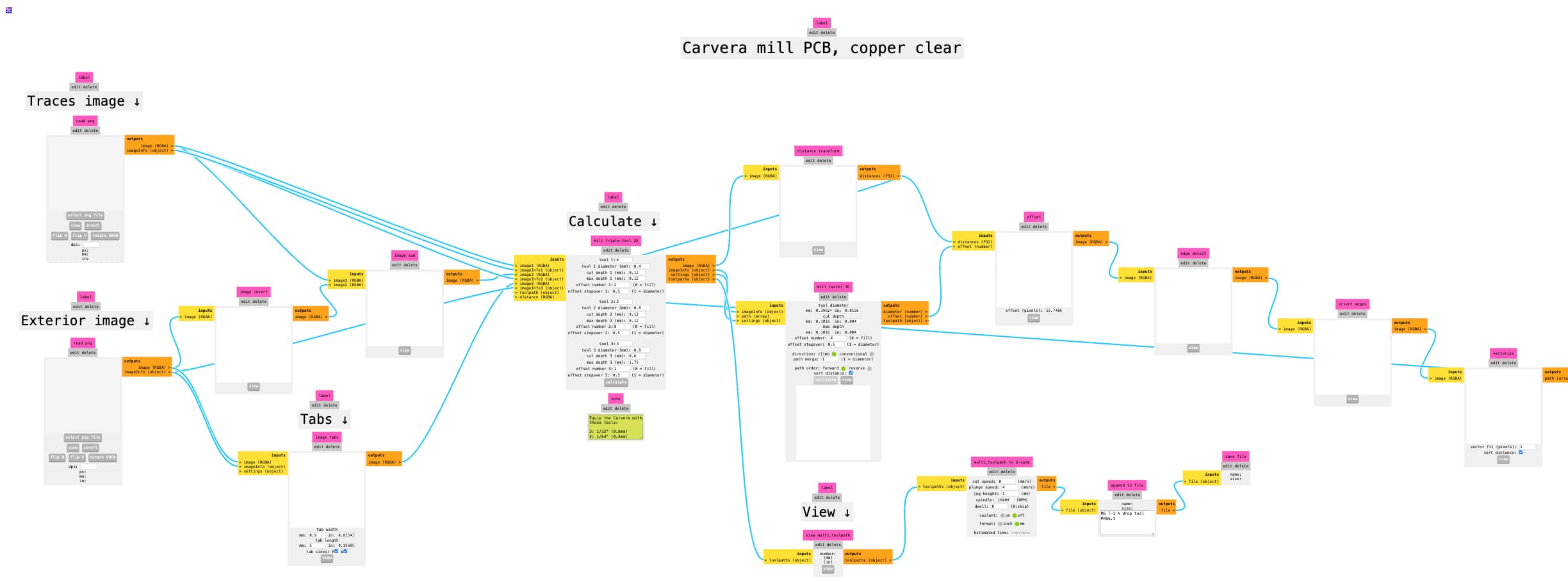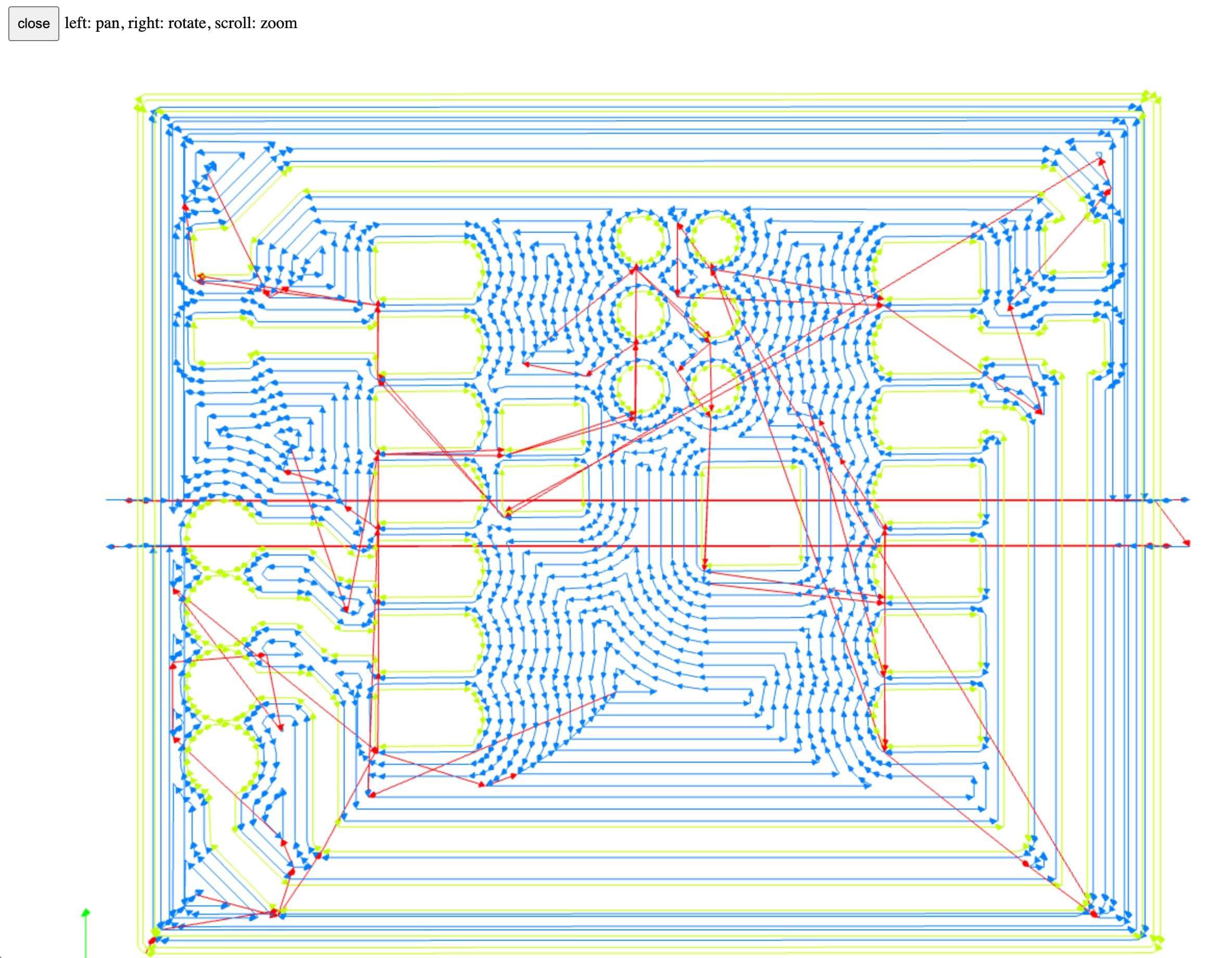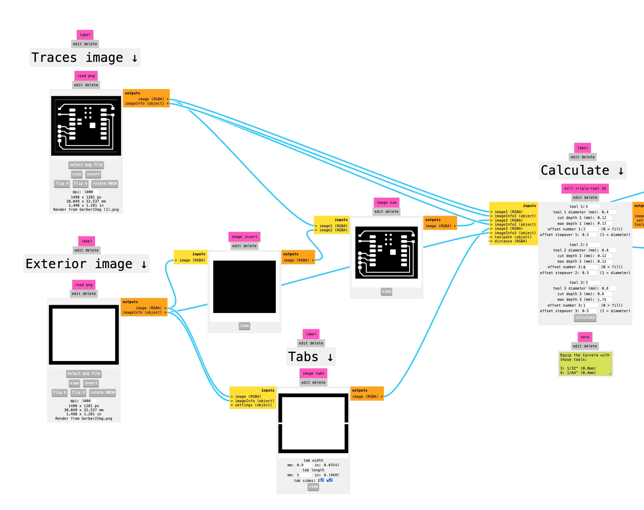 From there, I opened up the "mods project" site, then right clicked into programs –> open program –> "Carvera mill 2D PCB all". Then I dragged the trace png into "Traces image", and the board png into "Exterior image", and hit "Calculate". This generates the correct file for the milling machine, as well as a 3D model with the milling path within your browser (also pictured below):