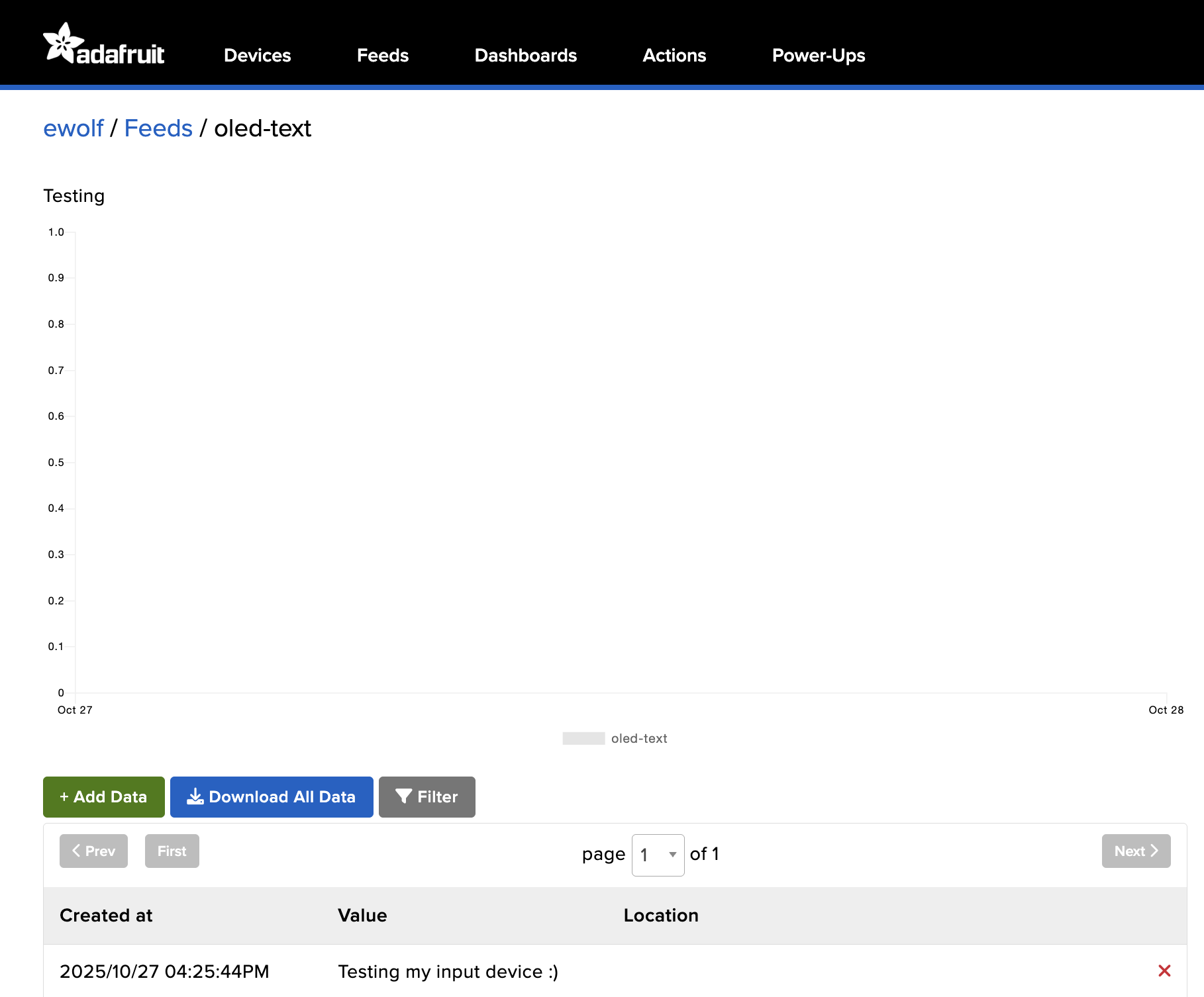 It was time to start trying to send a message over WiFi. Once again, I employed ChatGPT to generate code for me, working through the errors until we found something that worked (included in the same conversation linked above). In the end, what seemed to work was signing up for an Adafruit IO account, through which I could include my account username and key within the Arduino code, and set up an attached feed through the Adafruit IO website that I could send messages from.
