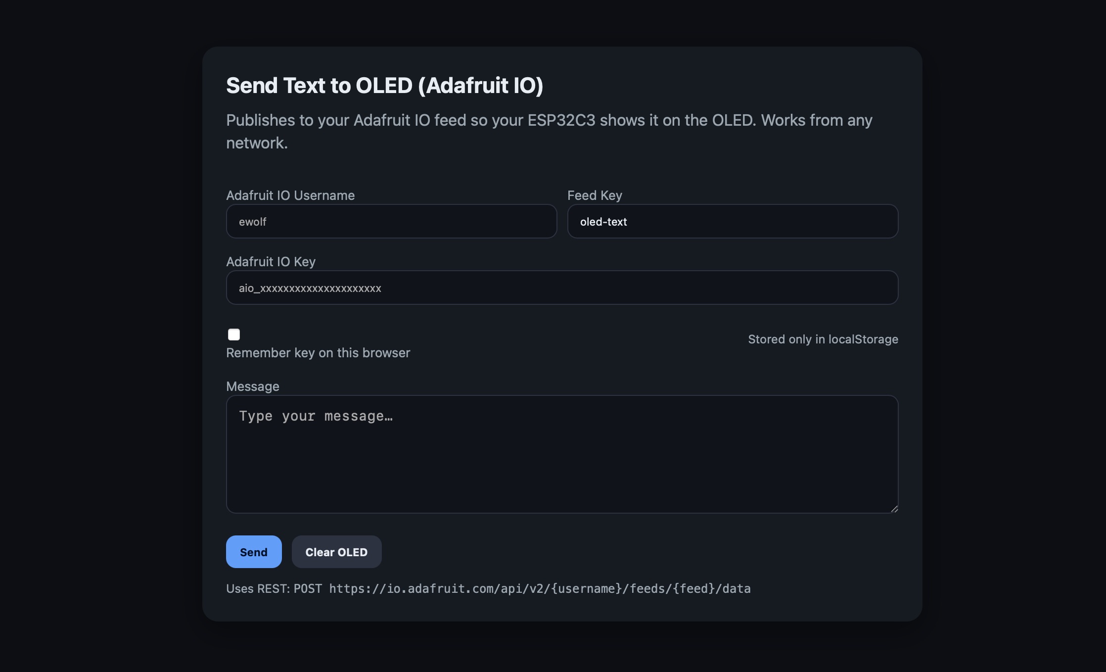 What it's doing: Provides a clean web interface for publishing messages to your Adafruit IO feed without needing to log into the Adafruit IO dashboard. Takes your Adafruit IO username, API key, and feed name, then uses the REST API to POST messages directly to the feed. Includes optional credential storage in the browser's localStorage so you don't have to re-enter your API key each time. Features a "Clear OLED" button that sends an empty string to blank the display, and supports Cmd/Ctrl+Enter keyboard shortcut to quickly send messages.