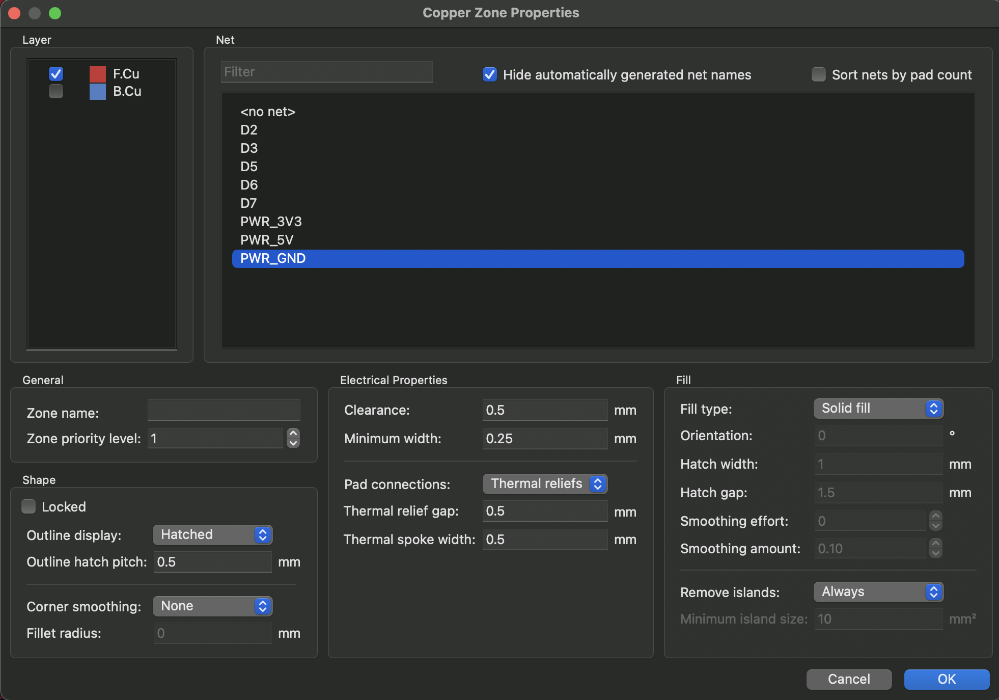 By double clicking the component you can edit the footprint, so we slightly moved them further apart and reduced the minimum distance for the tool to follow. Saetbyol also showed me that instead of wiring all the "GROUND" traces to each other, you can use the "Draw Filled Zones" tool on the front copper layer, then select "PWR_GND", then "Solid Fill" to automatically fill in the rest of your board with copper; this means all the "GND" traces are automatically connected through the rest of the board. This has a wonderful byproduct of also reducing milling time, since it no longer needs to mill out all the empty space where there aren't any traces.