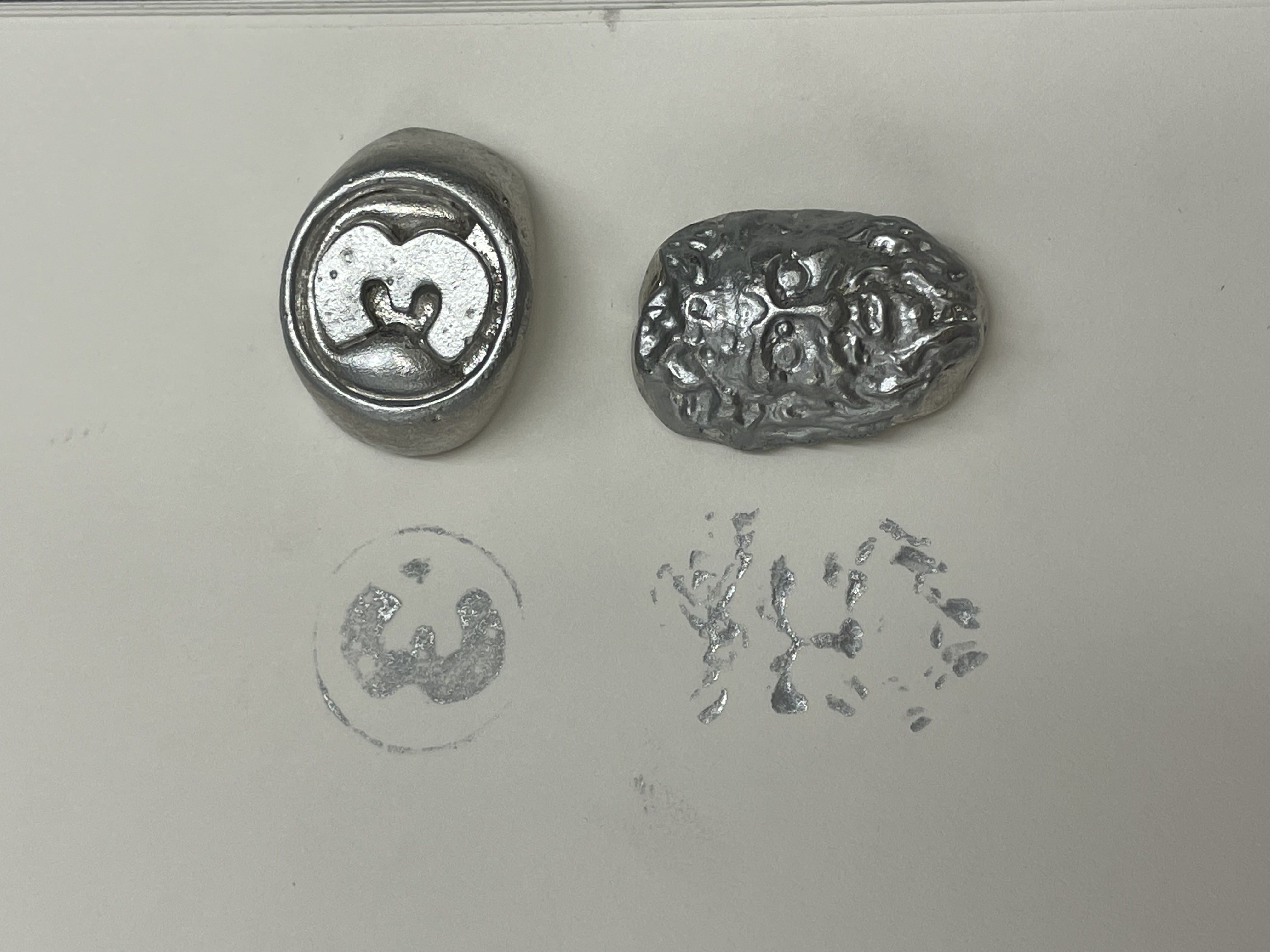 The only thing I would change is making a more complicated mold so that I could pour over these rings. It makes sense that I didn’t do this now, because it was so easy to get the project done with mostly the desired result by submerging them instead of pouring over them. In addition to casting the rings in the bismuth–tin alloy, I also cast wax into them and may think about how to use these waxes for something else. Finally, I inked and stamped them to see what they might look like without a flexible material.