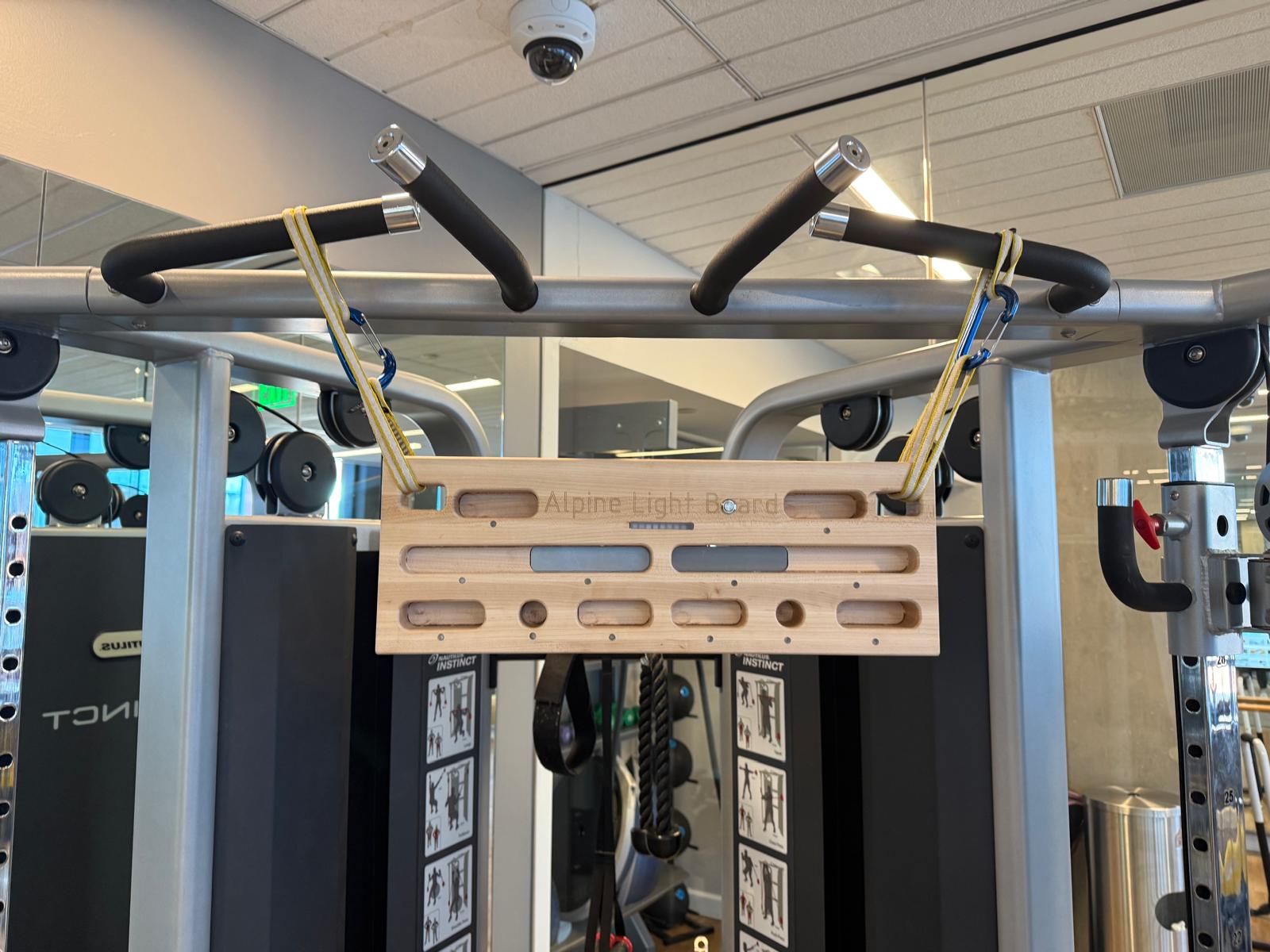 A rock climber's ideal training partner is a SMART hangboard. It includes LED lights indicating which holds to use, a load sensor-activated timer, and a mobile app for programming and tracking workouts.