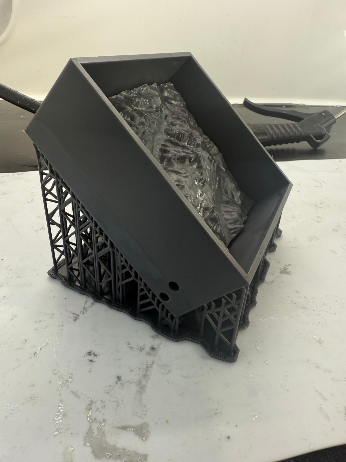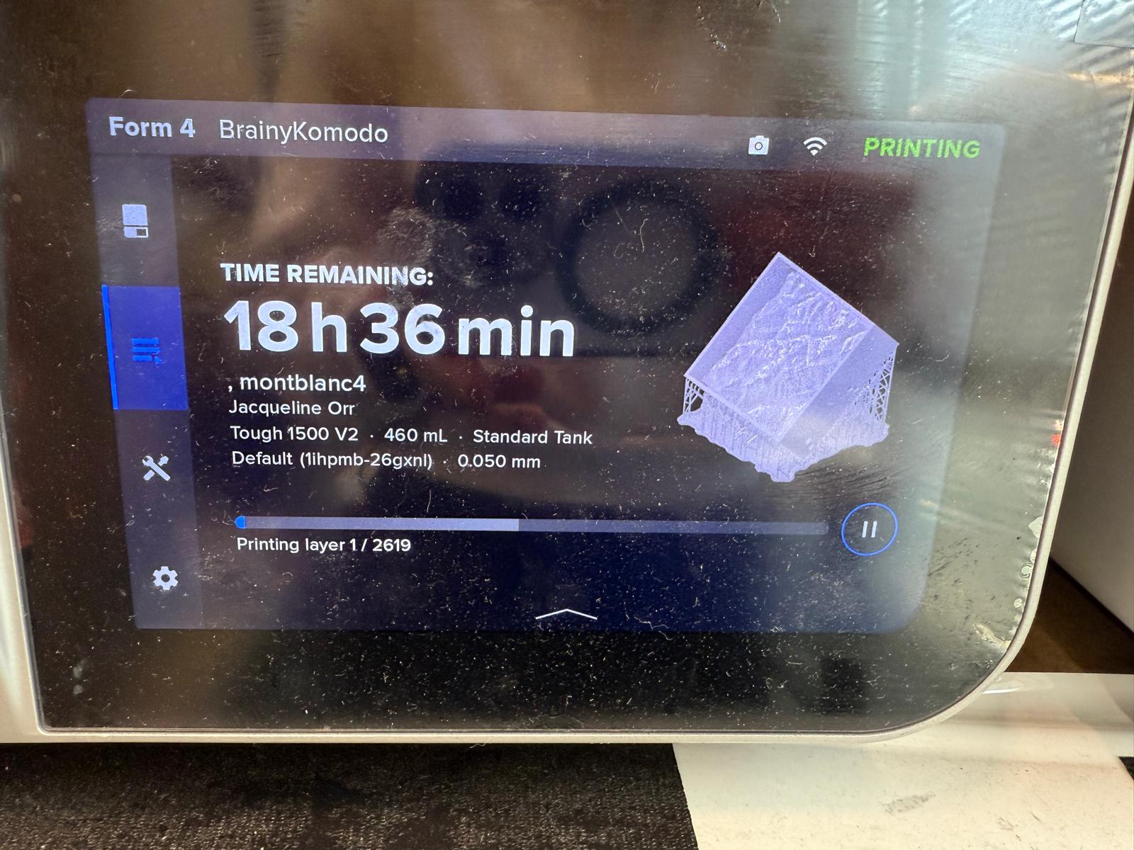 I uploaded the design into SolidWorks to reduce the mesh by 80%, then reimported it as a solid body and built a box around it. I manufactured the part using SLA printing. It took about 18.5 hours to finish the print.