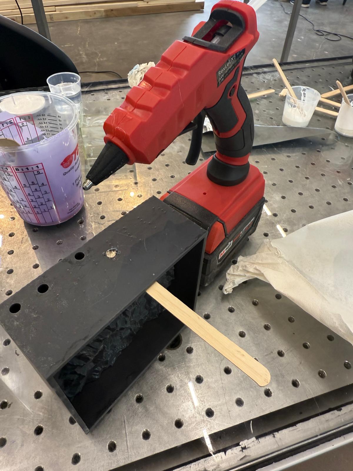 and Dan suggested I use an air gun, which worked perfectly. The walls of the mold were too thin and ripped easily, so I used hot glue again to reinforce them.