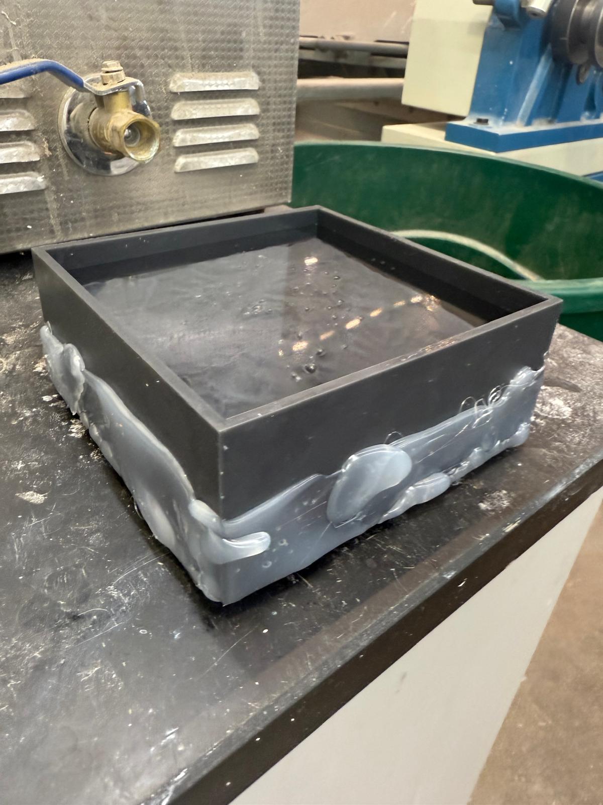 To seal the holes in the mold, I used a hot glue gun. Then I weighed equal parts of A and B, food-safe silicone, and poured it into the mold. I used the vacuum to remove all the bubbles; however, I think I left it in the vacuum too long, which caused an exothermic reaction that loosened some of the hot glue and made the silicone escape the mold. I only realized this about 5 hours later. The mold held perfectly for the first 30 minutes or so.
