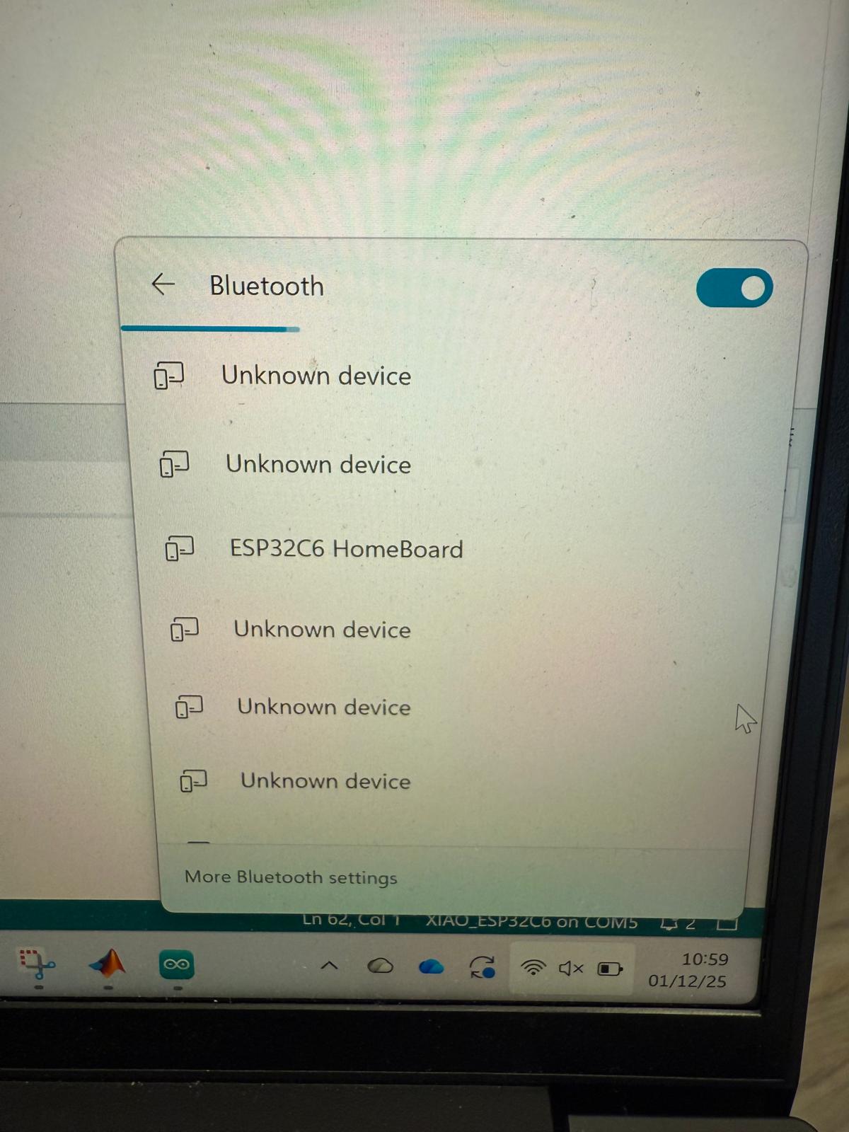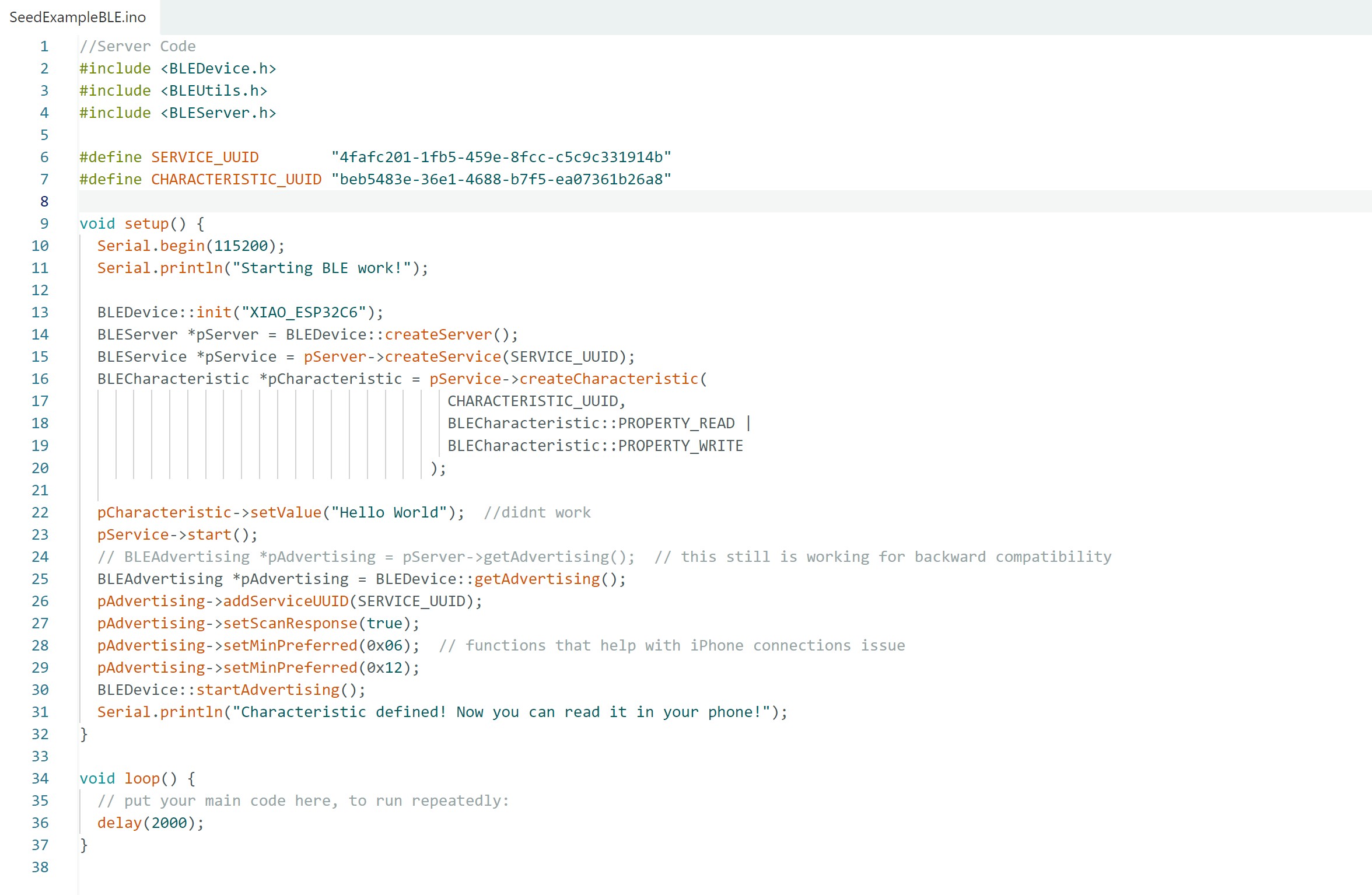 For my final project, I hope to use Bluetooth for users to send data from their phones to the microcontroller. After trying to connect to my microcontroller with Bluetooth using an example Arduino code, it didn't work; I checked the seedxiao website and datasheet for the ES32C6 and learned that only BLE would work. SeedXiao provided an example BLE code, so I tried it.