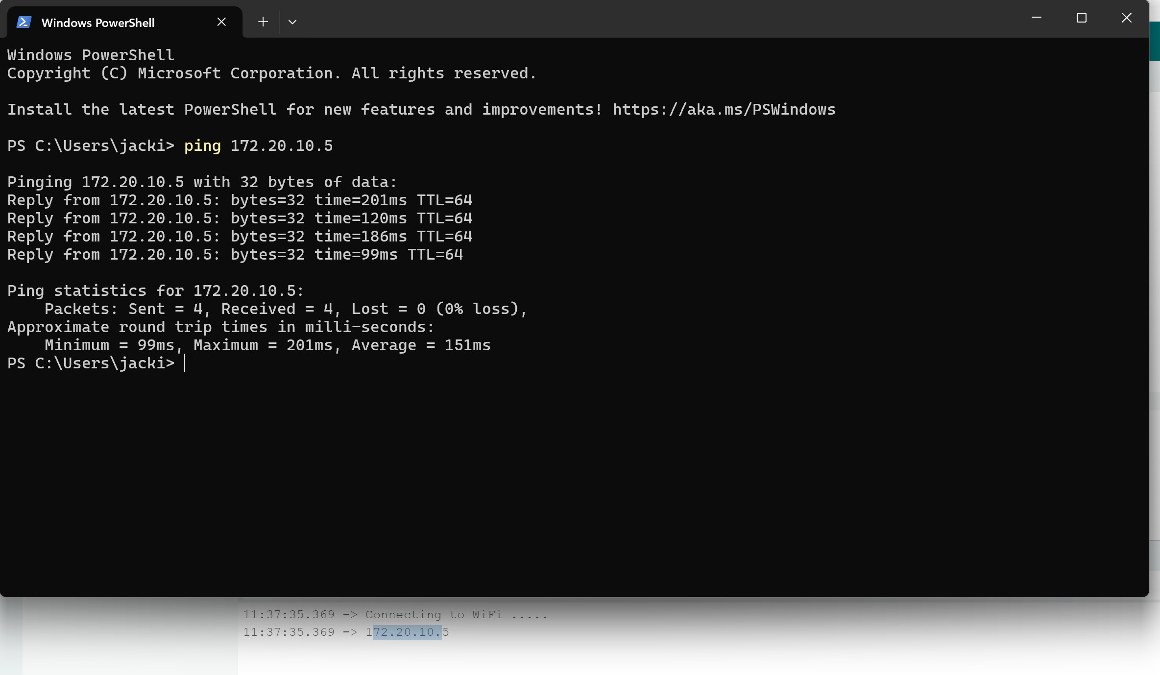 Next, I used the example wifi code on the seed xiao website to put my microcontroller on the internet, then verified by doing a ping test
