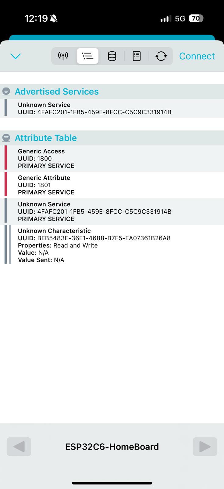 I used RFConnect to connect to the microcontroller via BLE. While the connection was successful, I could not transmit any data