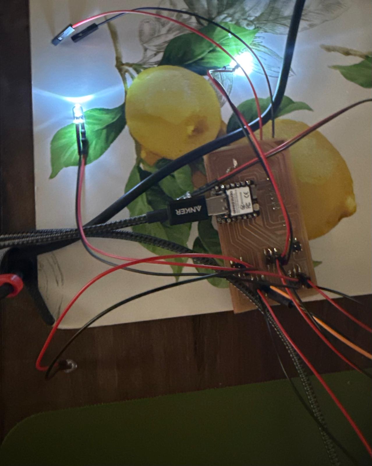 First, I tested all the LEDs on my PCB from Week 10, and only some of them work. See Week 10 for a detailed explanation. I have a new board design, but I still need to fabricate it. Next, ChatGPT took my initial test code and added functionality to hold the LED on (High) for a certain amount of time. While the LED is high, I want the NeoPixel to light up one at a time until the time ends. There are 8 NeoPixel cells in total. After the time ends, I want all the NeoPixels to turn red and gradually dim (like a light bar) for a set rest period. See the full conversation here . Surprisingly, it worked (neopixels not tested).
