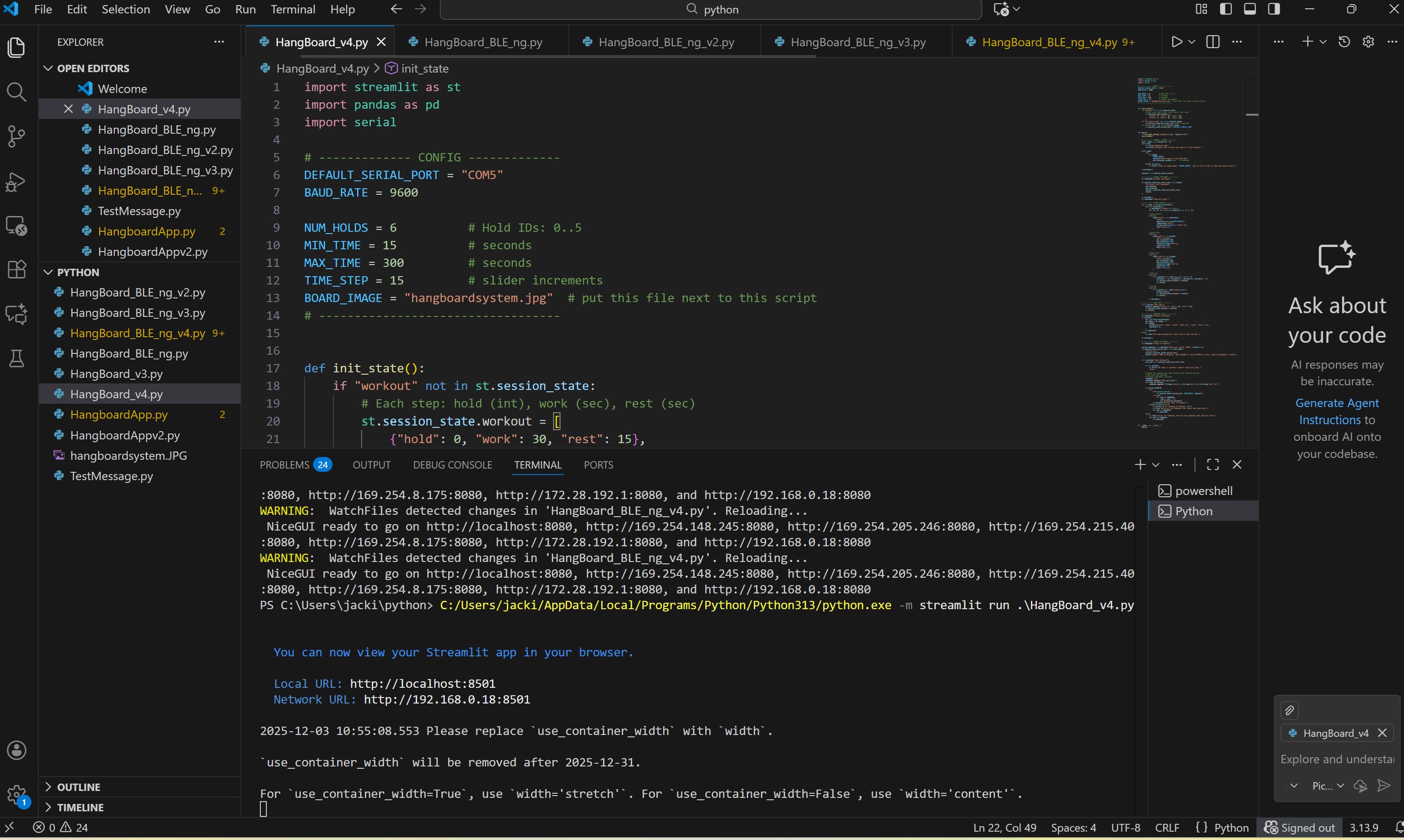He used Claude to generate some test code for me to try and ensure I have the correct setup. I haven’t used Python before, so this was new to me. I faced many issues using Linux via WSL to access the USB serial, and after spending about an hour or so trying to debug it, I gave up and switched to running Python in Windows through VS Code.