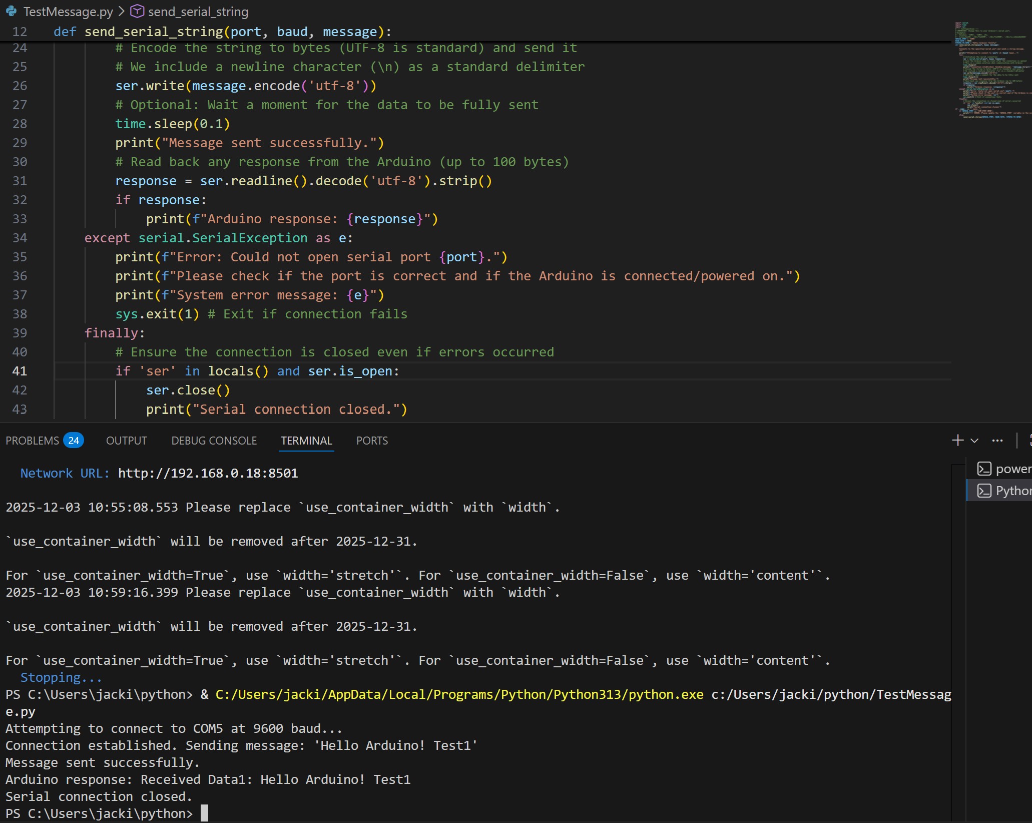 First, I compiled the code in Ardinuo and sent it to the microcontroller. Next, I ran the python script. How to run in Python: PS C:\Users\jacki\python> & C:/Users/jacki/AppData/Local/Programs/Python/Python313/python.exe c:/Users/jacki/python/TestMessage.py