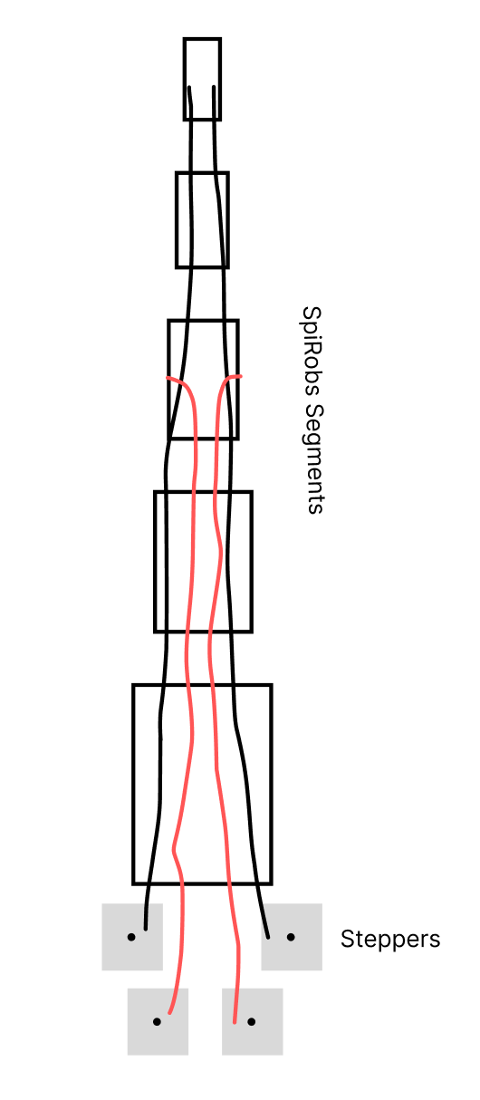 The black lines are the main cables to pull the segments, the red are for clamping the black cables. There will be 4 stepper motors.