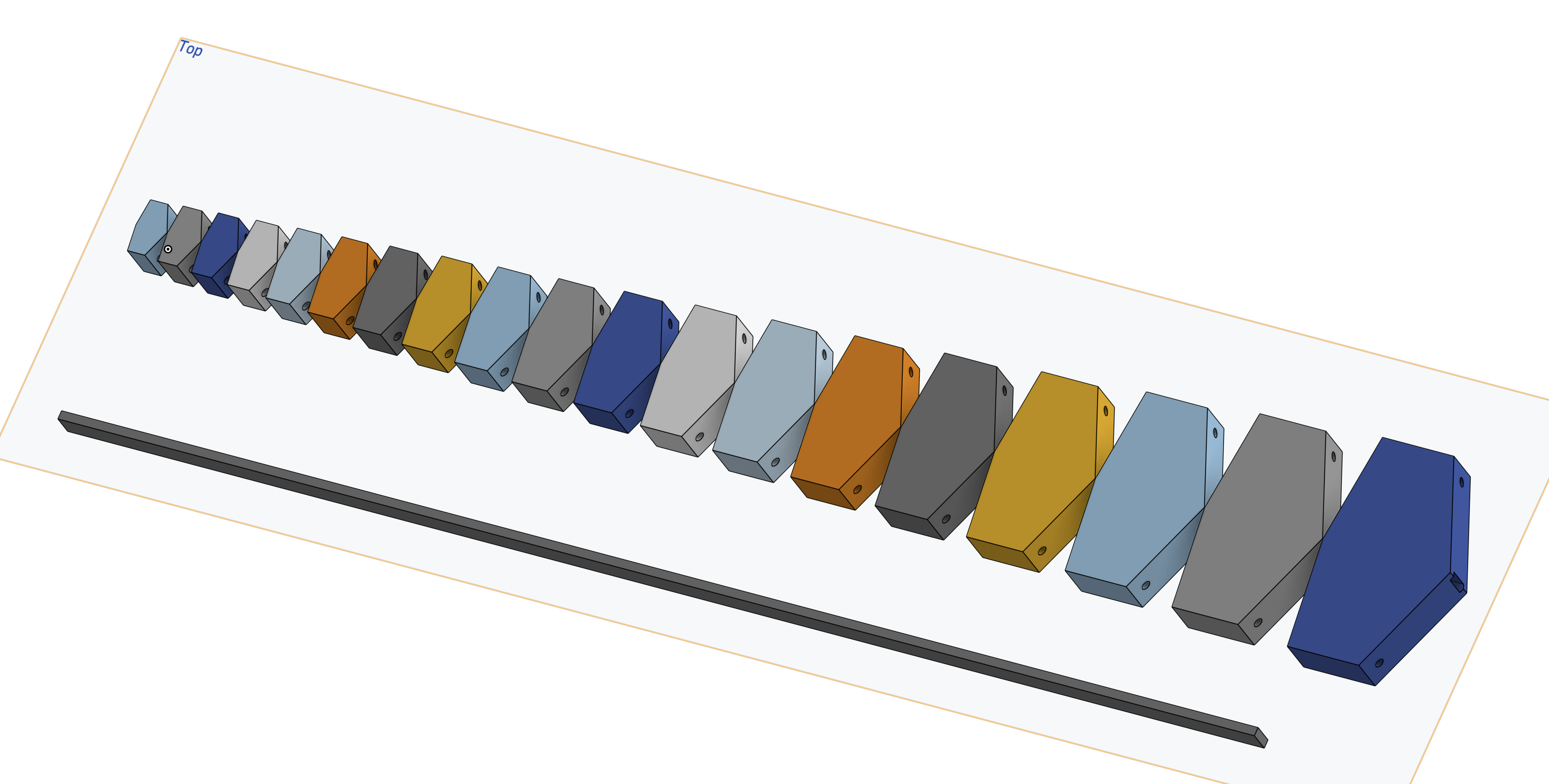 points_to_dxf(points, filename=f"parts/segment_{i}.dxf", closed=True)Here I manually added each part in OnShape, and moved it. I need to figure out how to automate this process. I then extruded some holes for the TPU core and the cable wire (I am using fishing line).