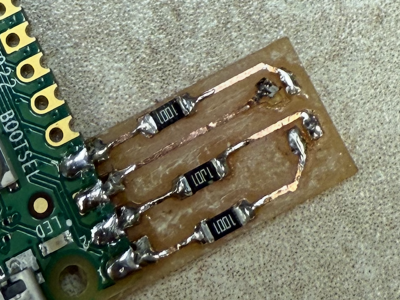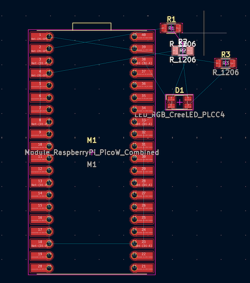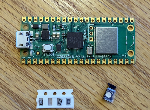 I gathered my parts which were the Raspberry Pi Pico W, 3 1k Ohms 1206 format resistors, and one RED LEG 4PLCC SMD from our inventory made by Cree. The Pico has a inbuilt bluetooth module which is the large silver plate. This is why it doesn’t need an antenna. This does Bluetooth Low Energy (BLE).