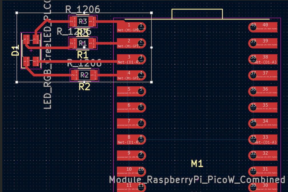 Then I did the typical routing puzzle. Now here is the interesting part, when drawing the edge cuts, I was thinking since I am just using a few pins of the pico, and they are all adjacent ones on the top left, there is no need to make my PCB for the entire Pico. So what I did was make the PCB just mount to the needed pins, and I thought that would look elegant and minimal.
