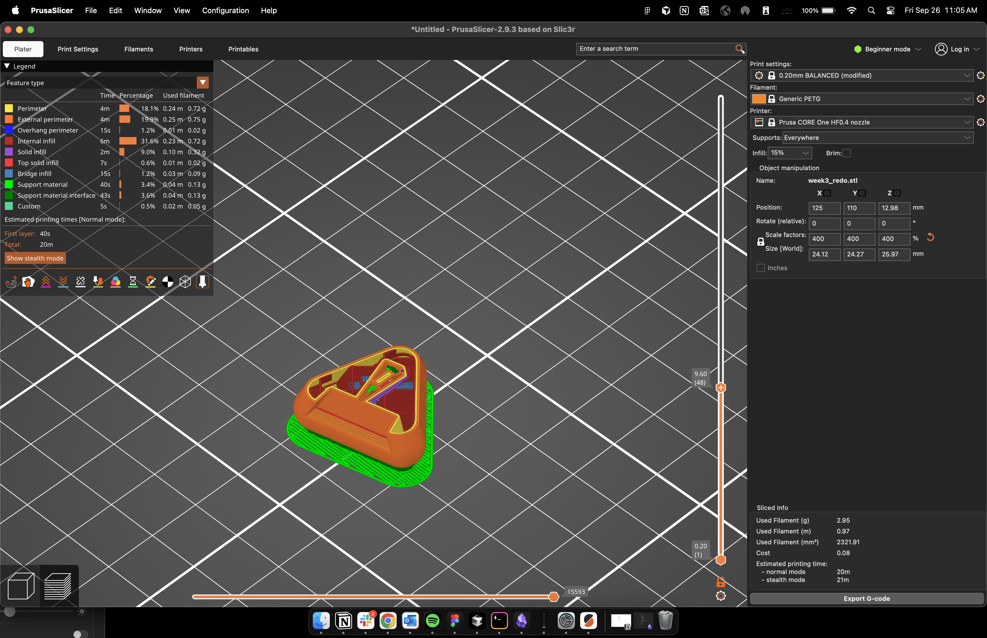I increased the scale factor to 400 to make it a reasonable size (2.5 cm). The reason I chose this is because if you look at the below image you can see the print pattern for the inner column is just few nozzle widths wide, I can’t make it too small or else that would make it unstable to print. I used a light infill percentage of 15% to make the print time shorter. The printer I was using used an orange PETG filament.