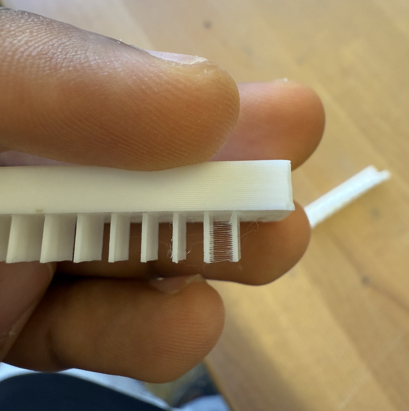 What I found most surprising was the thin wall test, it seemed that it was only 1-2 layers thick and the print quality was impressively good. However, for some reason there is stringing between the 2 thinnest walls. I read the following: https://www.simplify3d.com/resources/print-quality-troubleshooting/stringing-or-oozing/, which says the following: