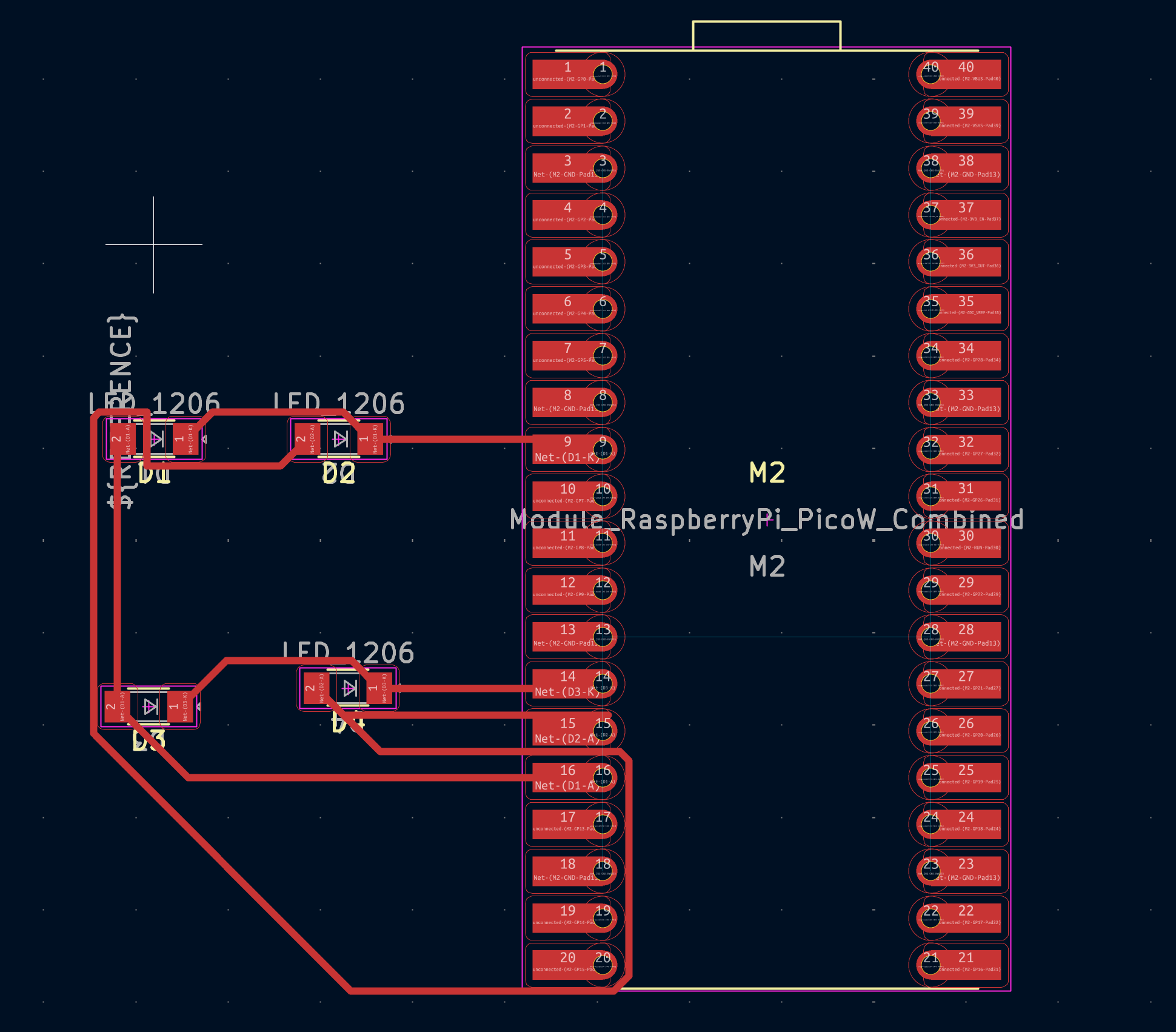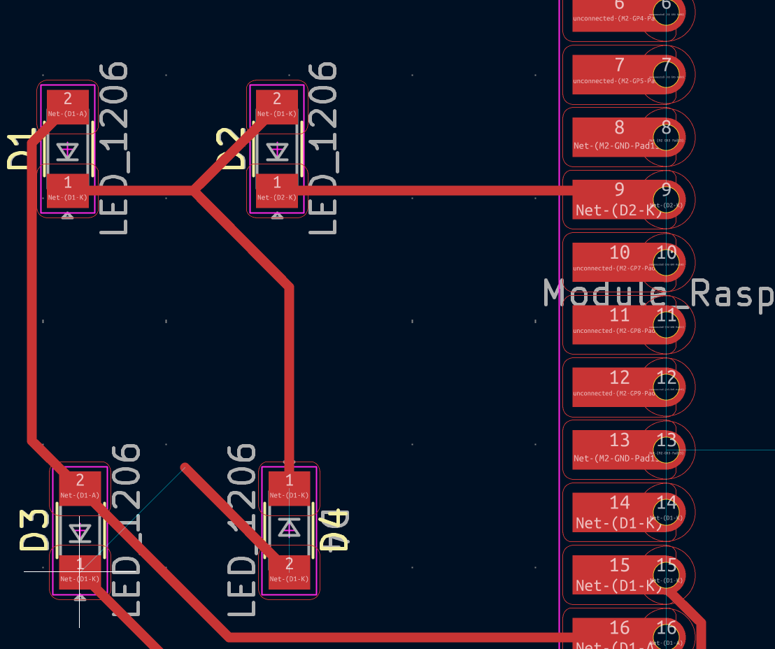 I had to spend some time figuring out how to route all the wires, but finally I was able to use the space between the LEDs to make it all work. I think this passes the design clearance because I set the minimum track width and clearance of 0.4 mm.