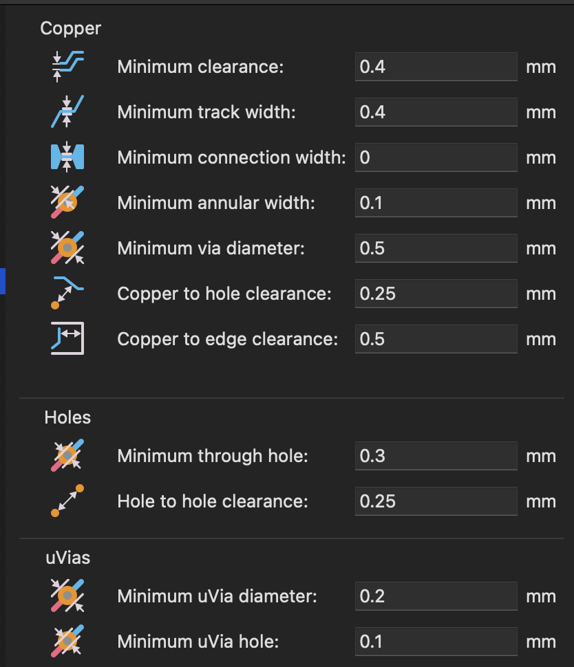 The first step I did was learn the basics of KiCad from the recitation video. I ended up replicating the board with an LED. I set the design rules of 0.4 mm minimum clearance and track width.