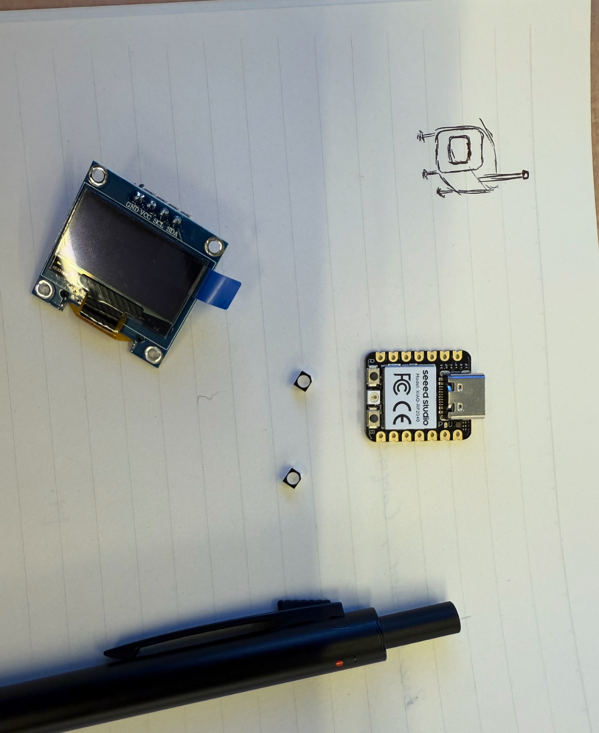 Therefore, I got to designing. I got the parts which are the xiao r2040, an OLED screen and an RGB led. I also drew a rough sketch of how II wanted it to look like.