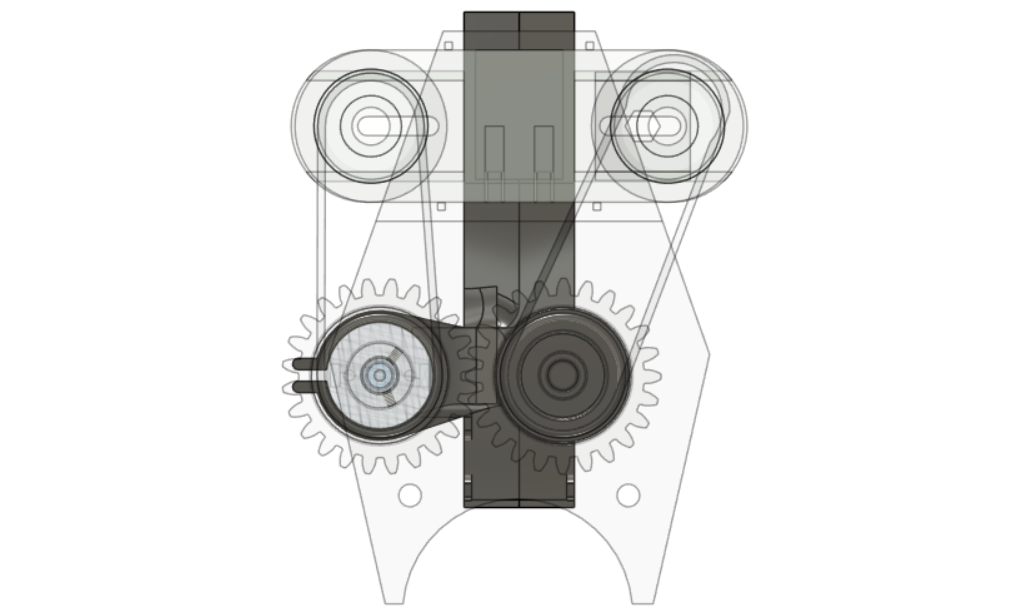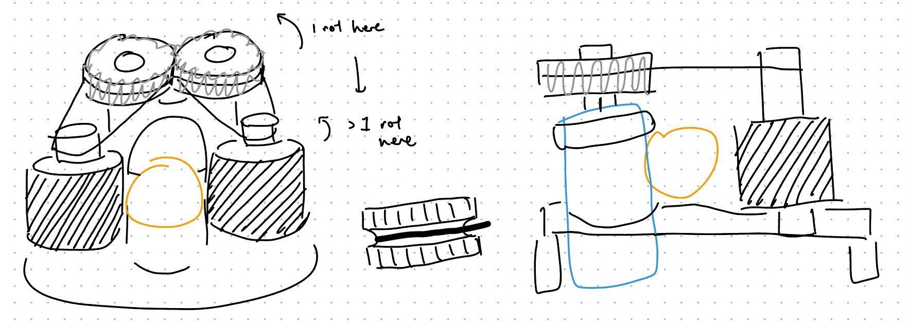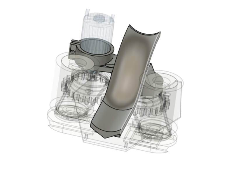 The gears were stiffer and louder than I expected, but worked fairly well. The stiffness could be mitigated by using bearings instead of having a plastic-on-plastic axel, but I was still worried about force transfer and the general loudness/impreciseness of plastic meshing, especially at speeds. With this in mind, I designed the sketched out the following mechanism next: