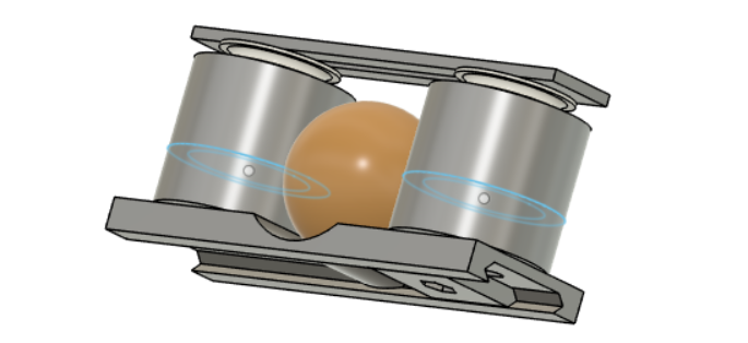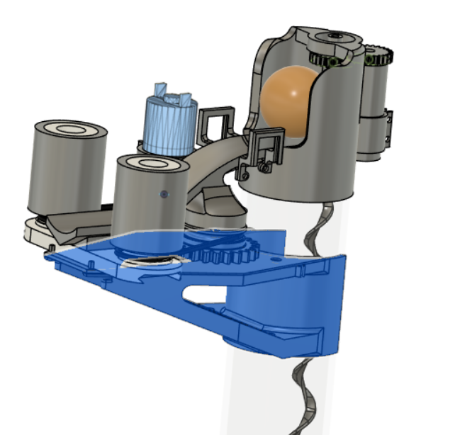 Unfortunately, as the gears have to meet above the channel where the ping-pong ball goes (due to the dimensions of the head), the packaging was… not ideal. This is especially exacerbated by the fact that the motor gear (and its motor) has to be completely clear of the ball channel, which would force me to either put the axel of the driven gear above the ball channel and severely limit my support options, or make the gears extra large in diameter, which seemed like an even worse idea with fast motors and plastic gears (something something torque?).