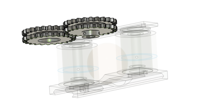 Here, the motor gear would be attached to the motor via set screws, and the driven gear would be attached to the structures via a bearing on top and a bearing on the bottom.