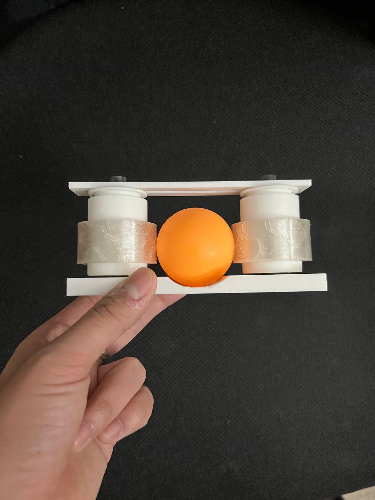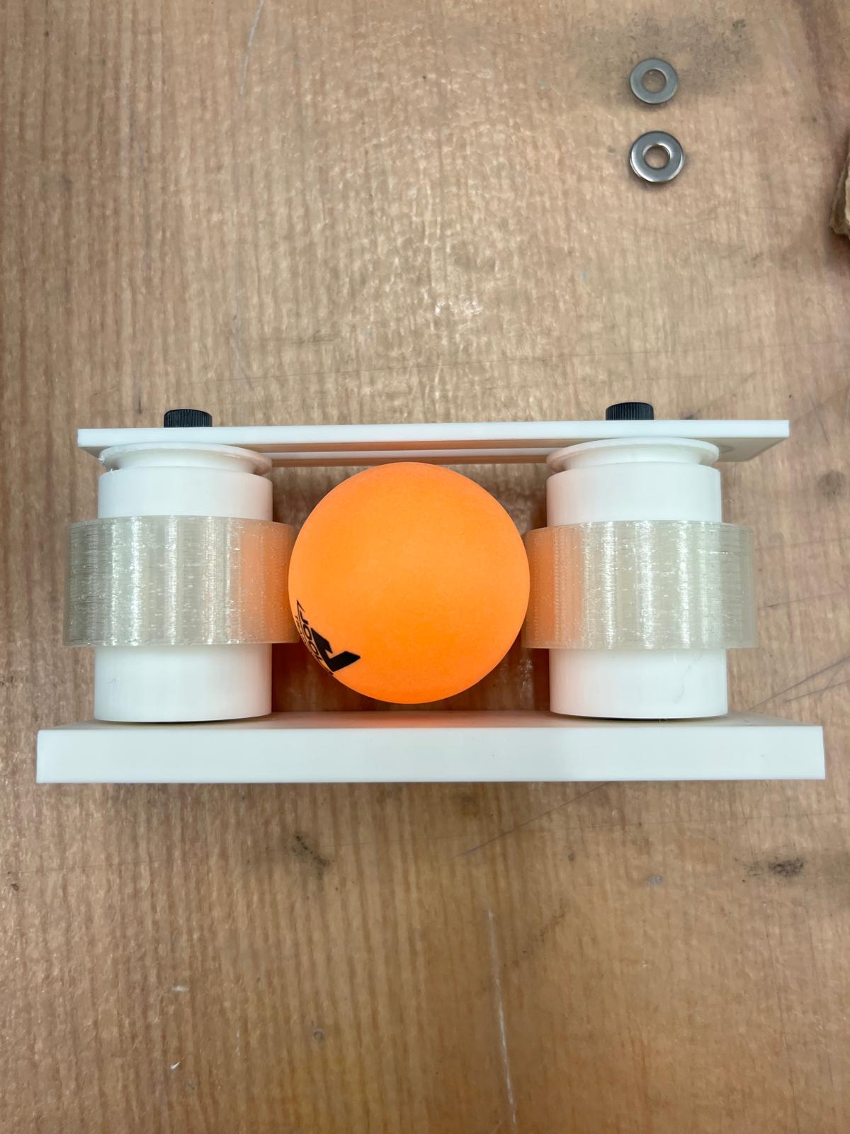 Unfortunately, I had neglected to consider height too much, and while it held together (see above) with one washer on either side, it turns out the roughness from the 3D print necessitated two washers on the bottom of the stackup for smooth spinning, which was just enough that the nut at the bottom could not properly thread onto the bolt. Another issue was that the TPU tire, which kind of worked but wasn’t squishy enough to satisfy me.