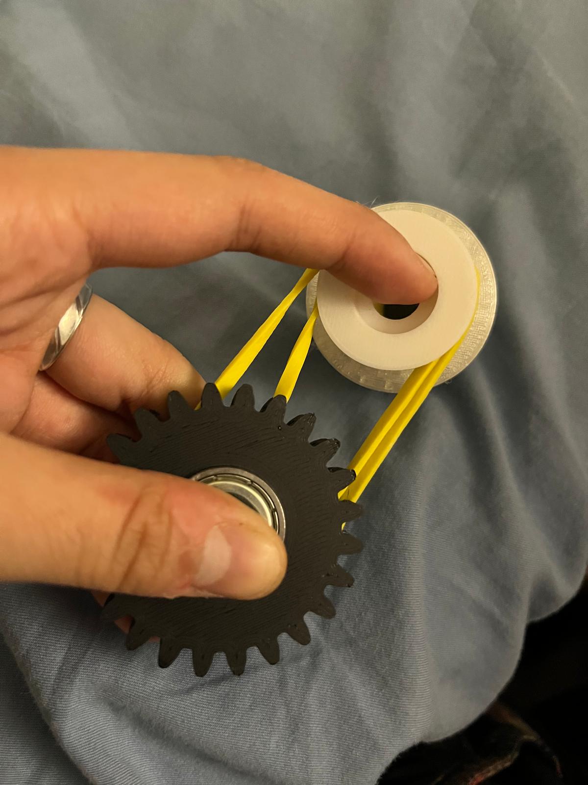 I printed a floor to constrain the entire mechanism better, and tested spinning with a power supply and some rubber bands to act as my belt. This rubber band was just generally annoying - it slipped out of its groove relatively often, and, since it was long enough that it had to be folded in on itself, it wasn’t as effective at force transfer.