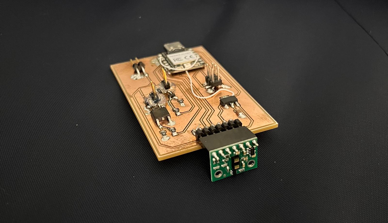 Then I soldered the whole thing and slotted it into the slot I made on the shooting support. I used hot glue to reinforce the motor pins (where I had lost traces previously), and had to wire two pins on the XIAO together, as I’d accidentally put my analog sensor on a non-analog pin.